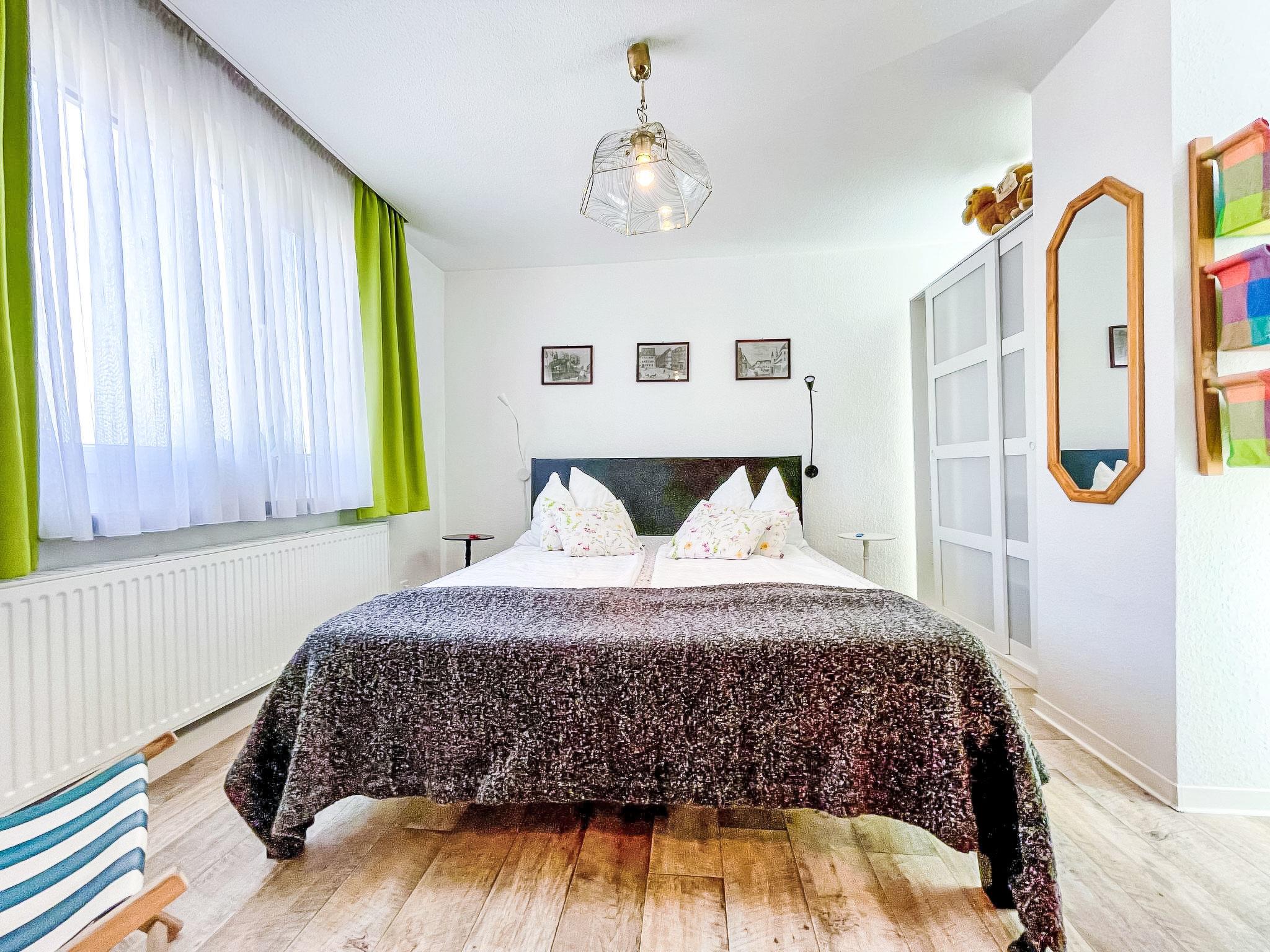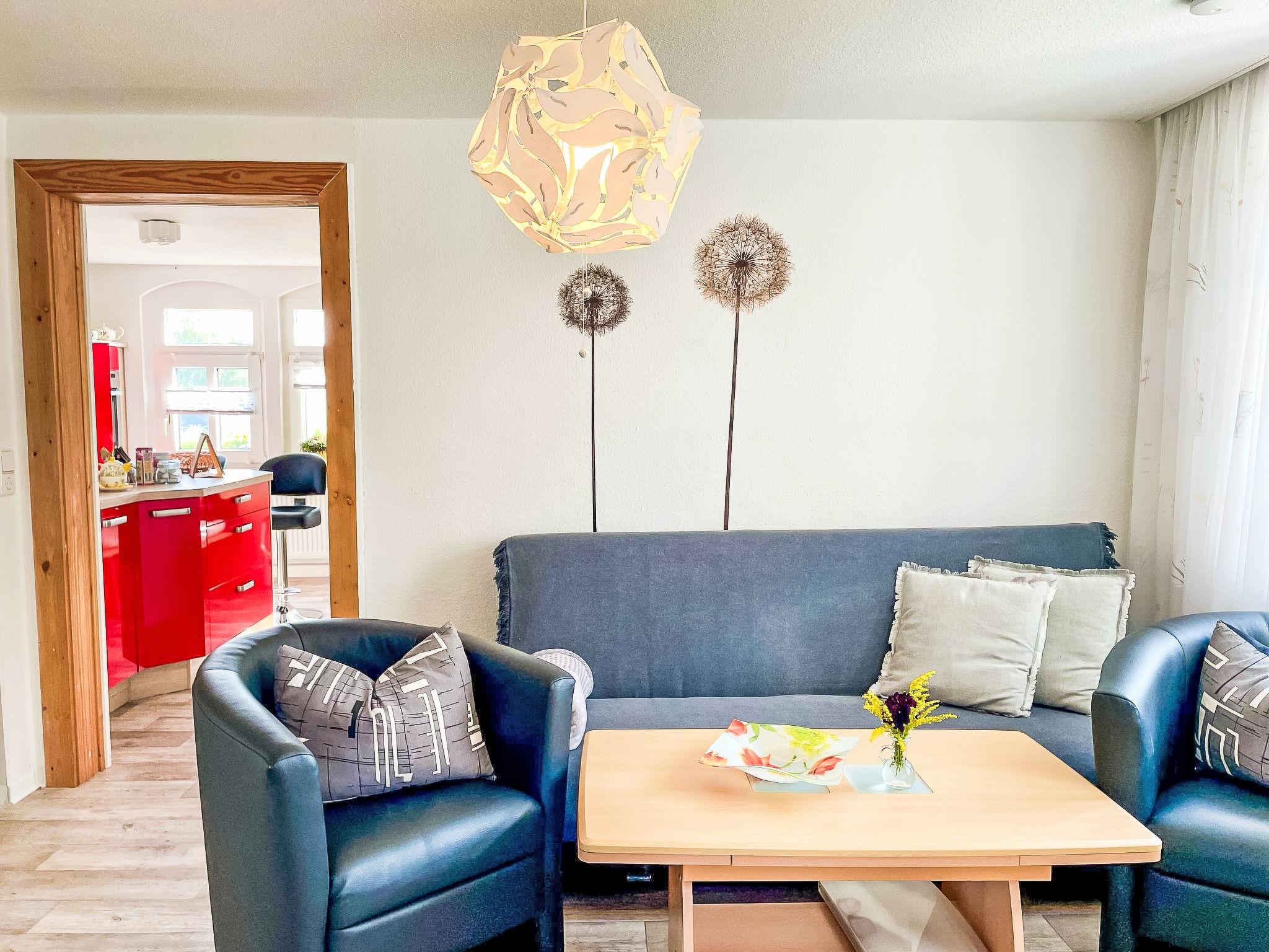 "Naturblick Karla Rößler", 3-room apartment 60 m2 on 2nd floor. Very comfortable and cosy furnishings: living room with 1 sofabed (140 cm, length 200 cm), satellite TV. Walk-through room with 1 sofabed (140 cm, length 200 cm). 1 large room with 1 double bed (1 x 180 cm, length 200 cm). Large kitchen (4 hot plates, oven, dishwasher, toaster, kettle, freezer, electric coffee machine) with dining table. Shower/WC. Underfloor heating. Parquet floors. Very beautiful distant view of the countryside and the forest. Facilities: children's high chair, baby cot. Internet (WiFi). Parking (extra). Please note: suitable for families. Non-smokers only. Smoke alarm.
