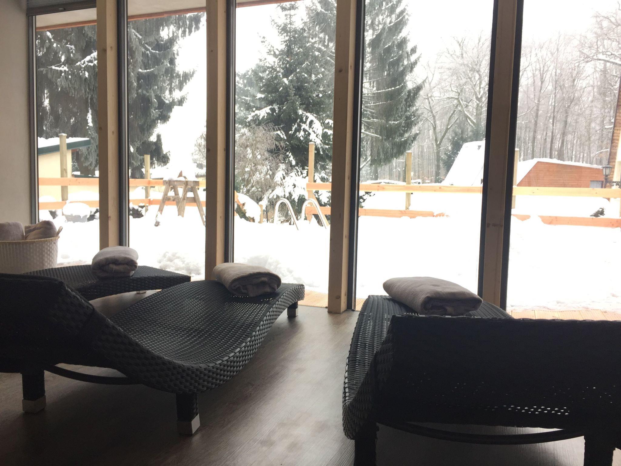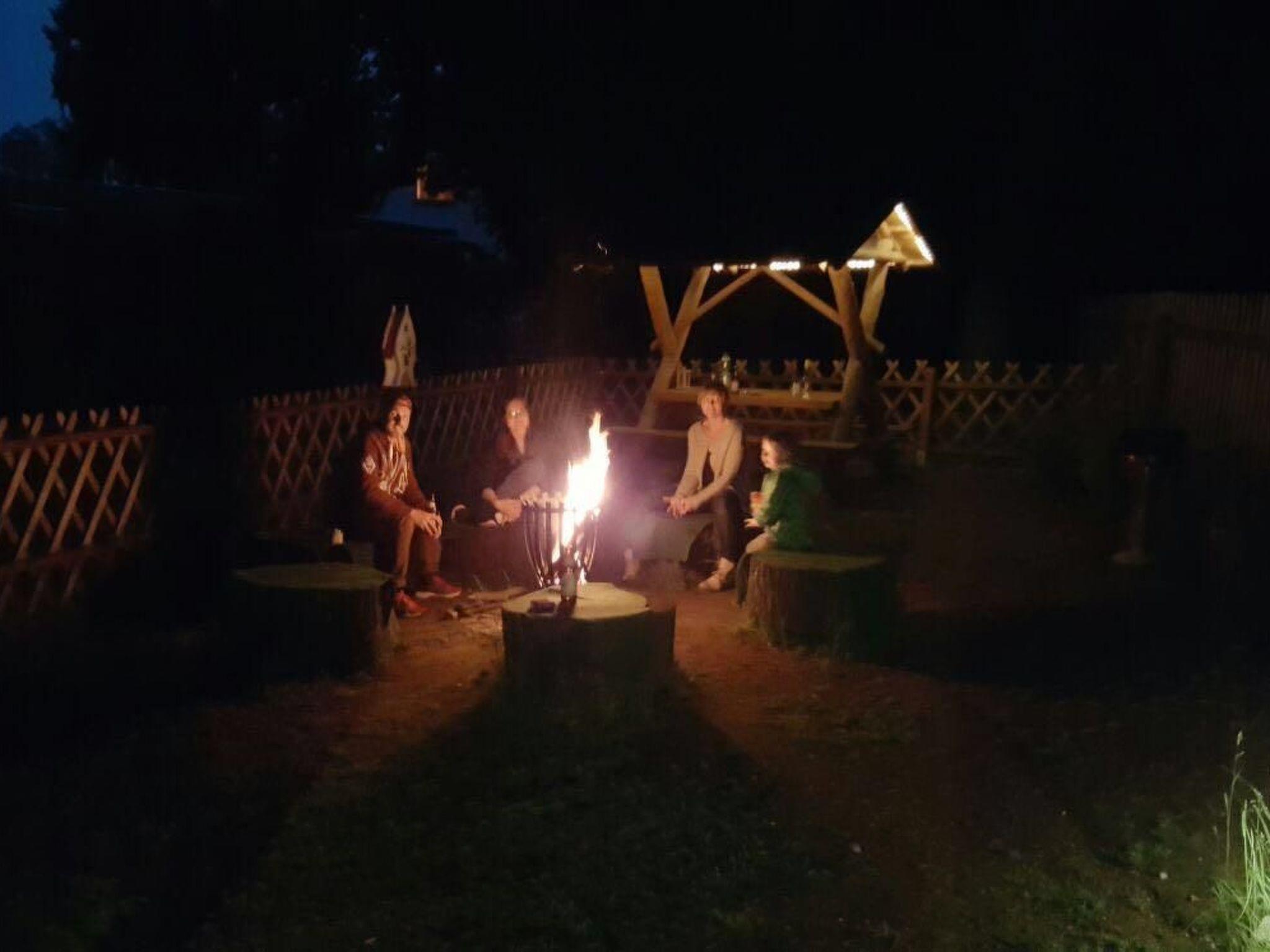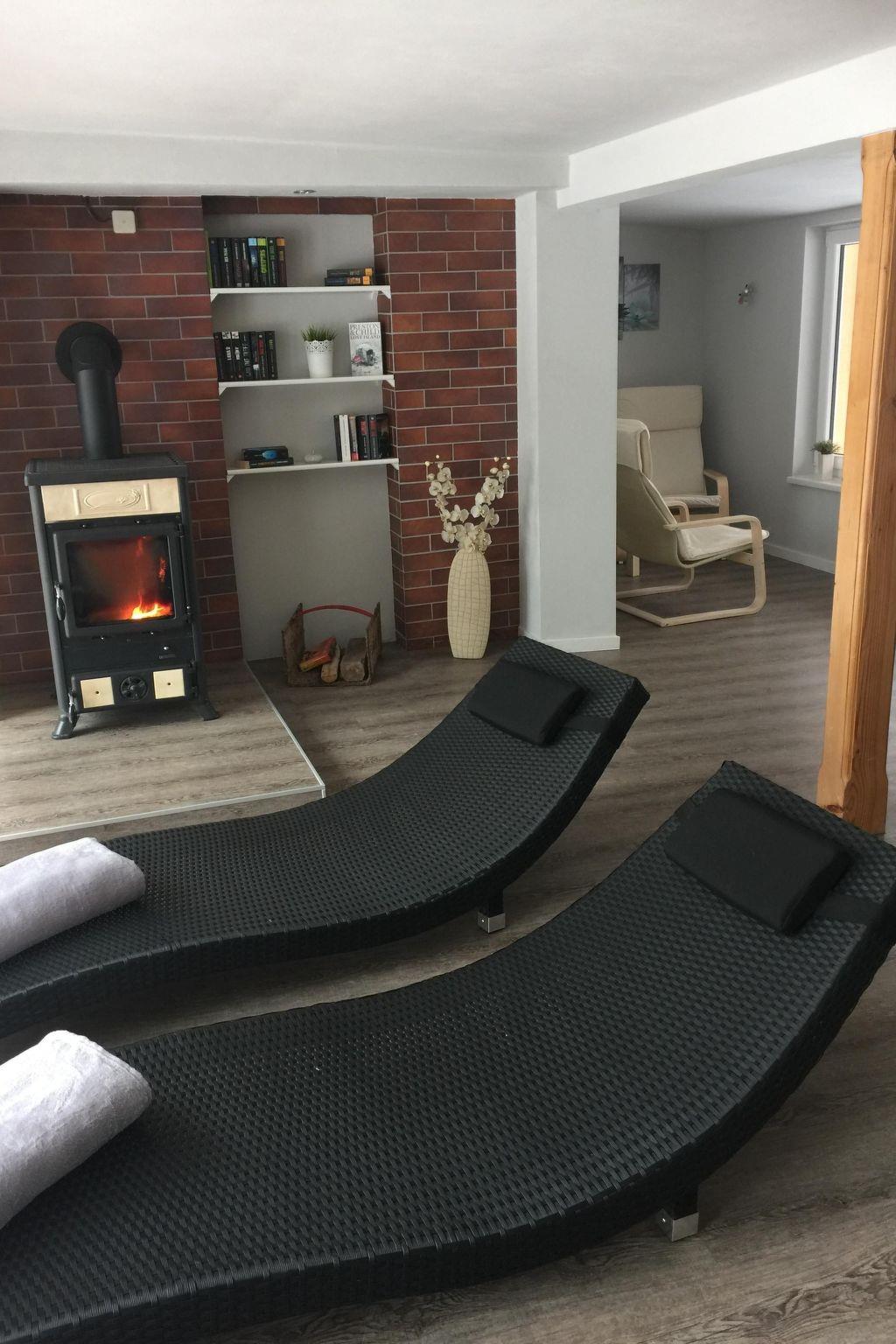 There is a bar table for meals together, looking out at the wooden terrace that has garden furniture and a grill. Pets are allowed on request.