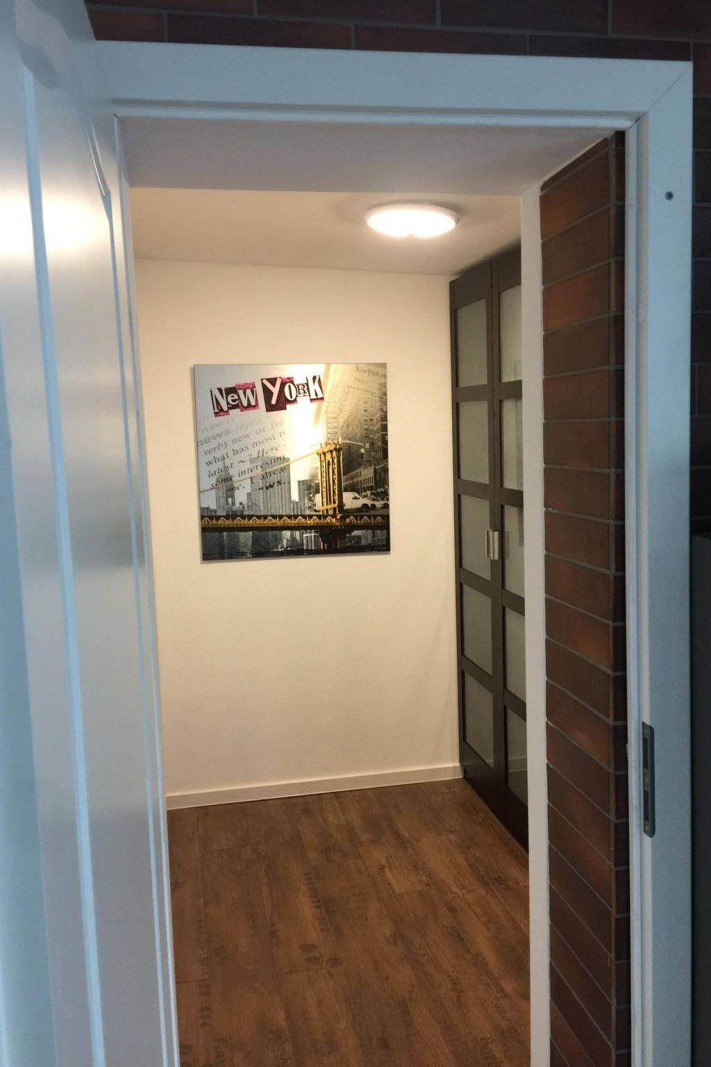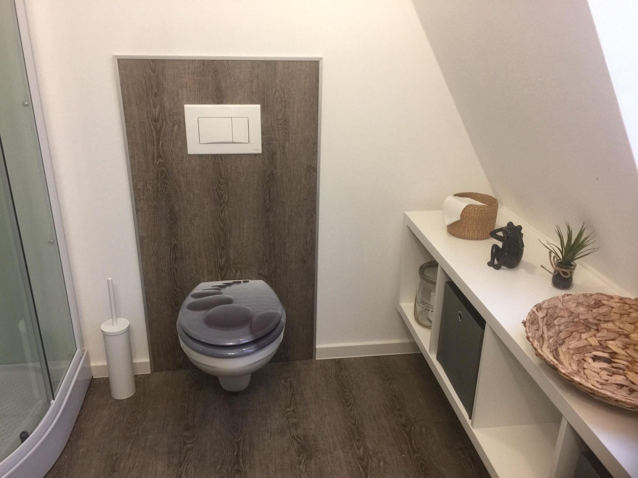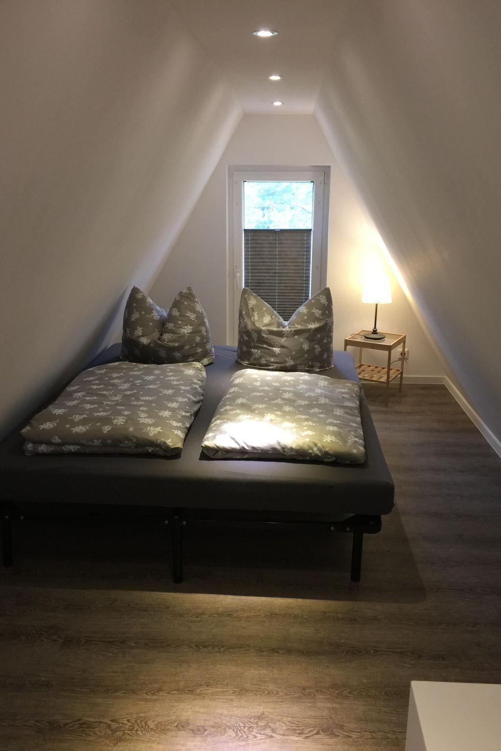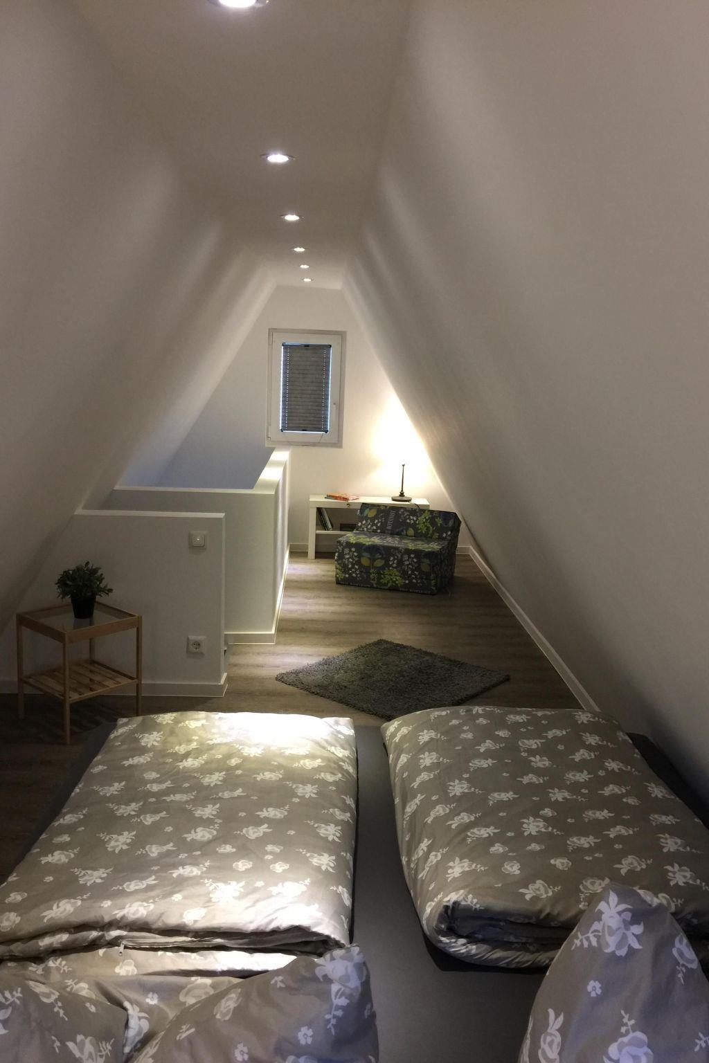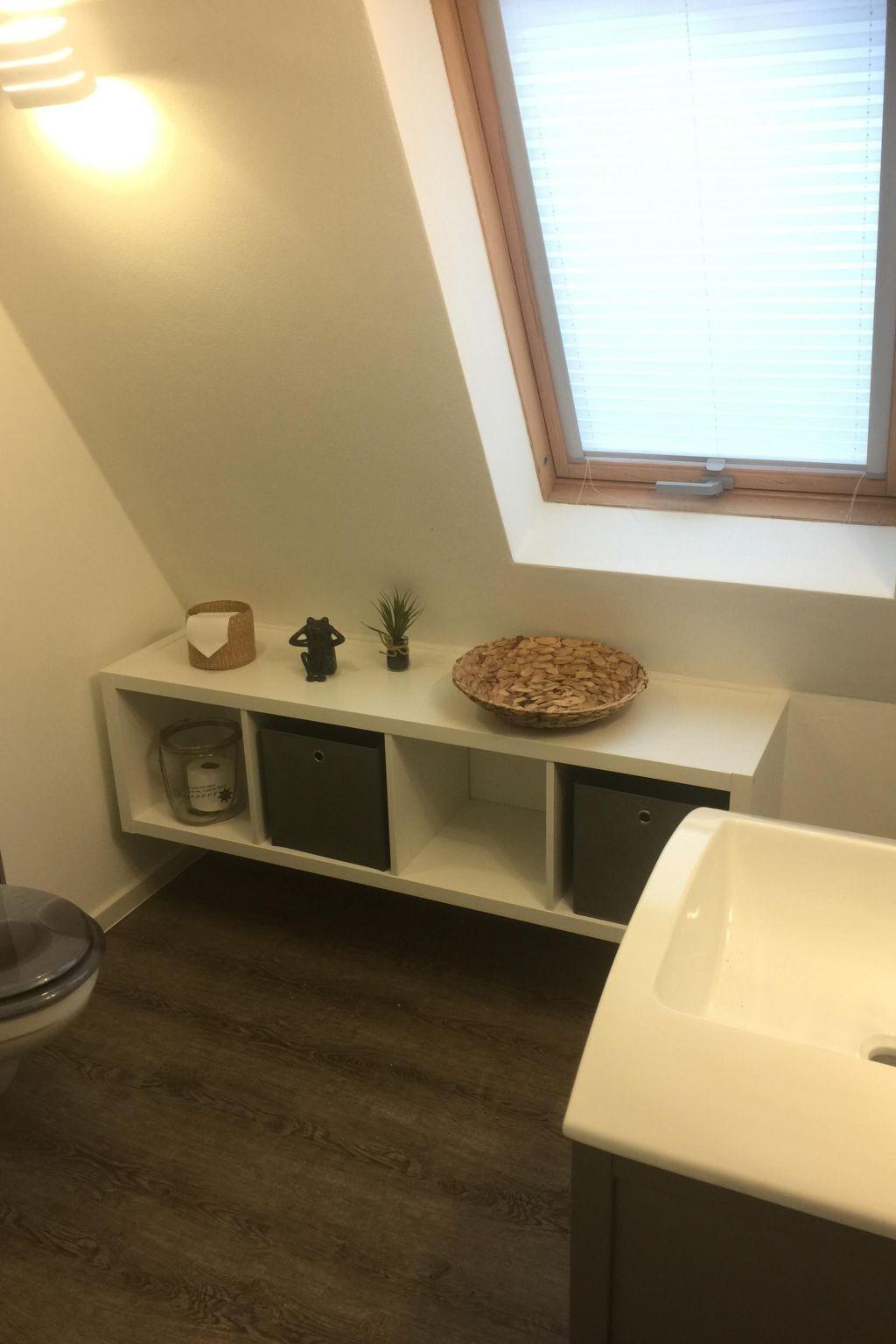 The living room has modern furnishing, including a leather corner sofa, and a 40“ LED TV with satellite channels, a DVD player and stereo system for entertainment, and a games console on request. The kitchen is equipped with a fridge and freezer compartment, a four-ring hob with an oven, a dishwasher, microwave, toaster, kettle and coffee machine. The small bathroom with a WC and shower has a modern design. The bedroom, accessed up steep stairs, is furnished with a double bed (180 x 200cm) and cupboards.