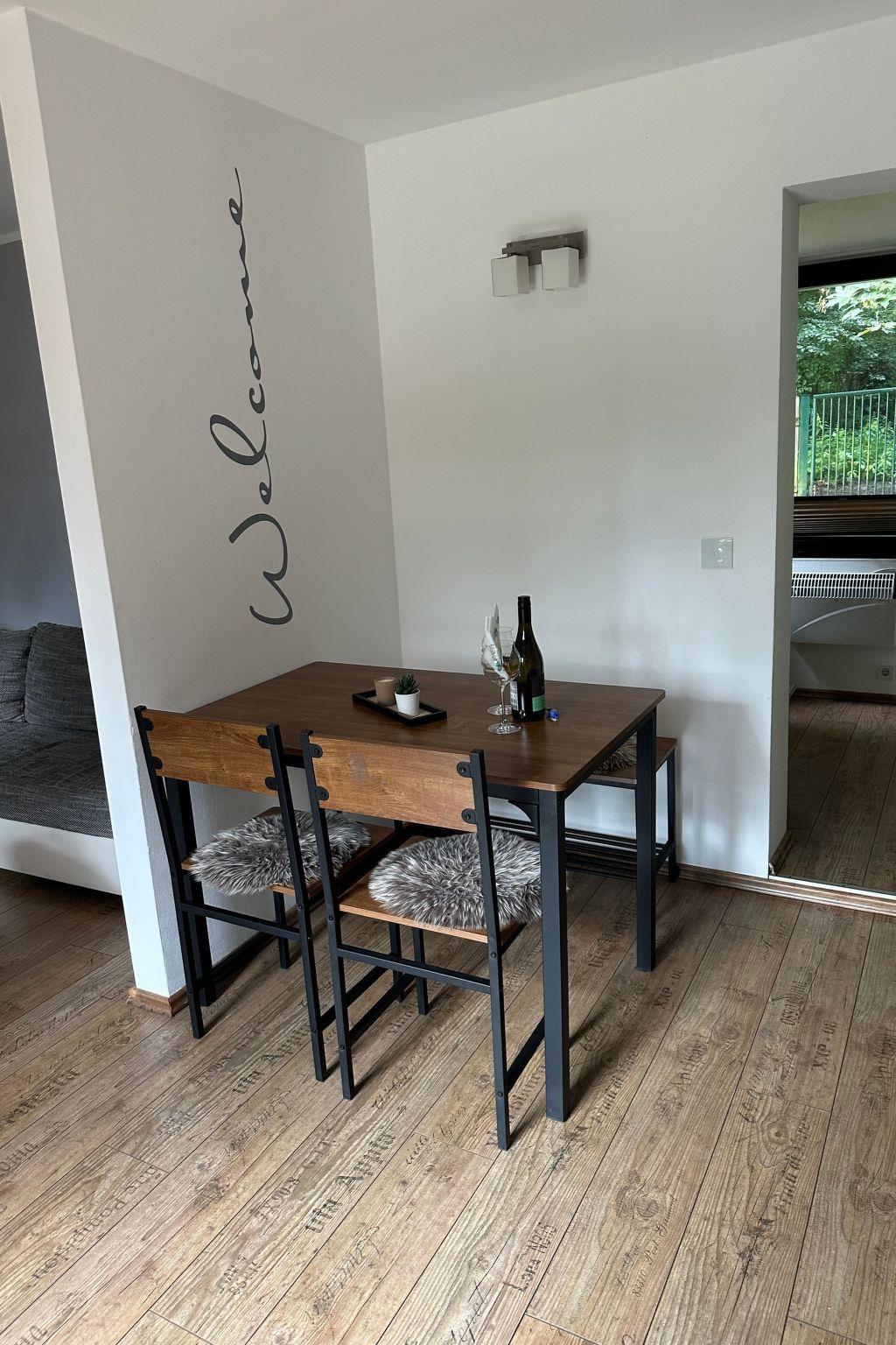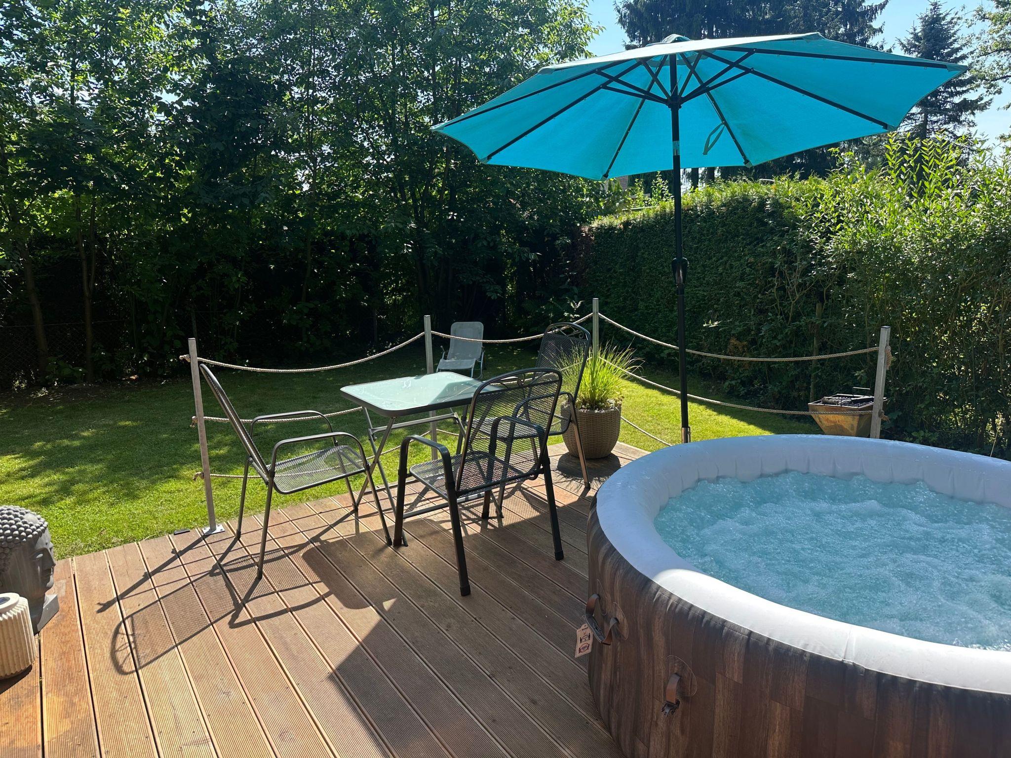 The outdoor area with its cosy wooden terrace, equipped with garden furniture and a barbecue, invites you to linger and enjoy the fresh air. Right next to the entrance area is an inviting, bright dining area, which offers a wonderful view of the terrace and invites you to eat outside together. Here you can enjoy the quiet evenings and nature to the full.