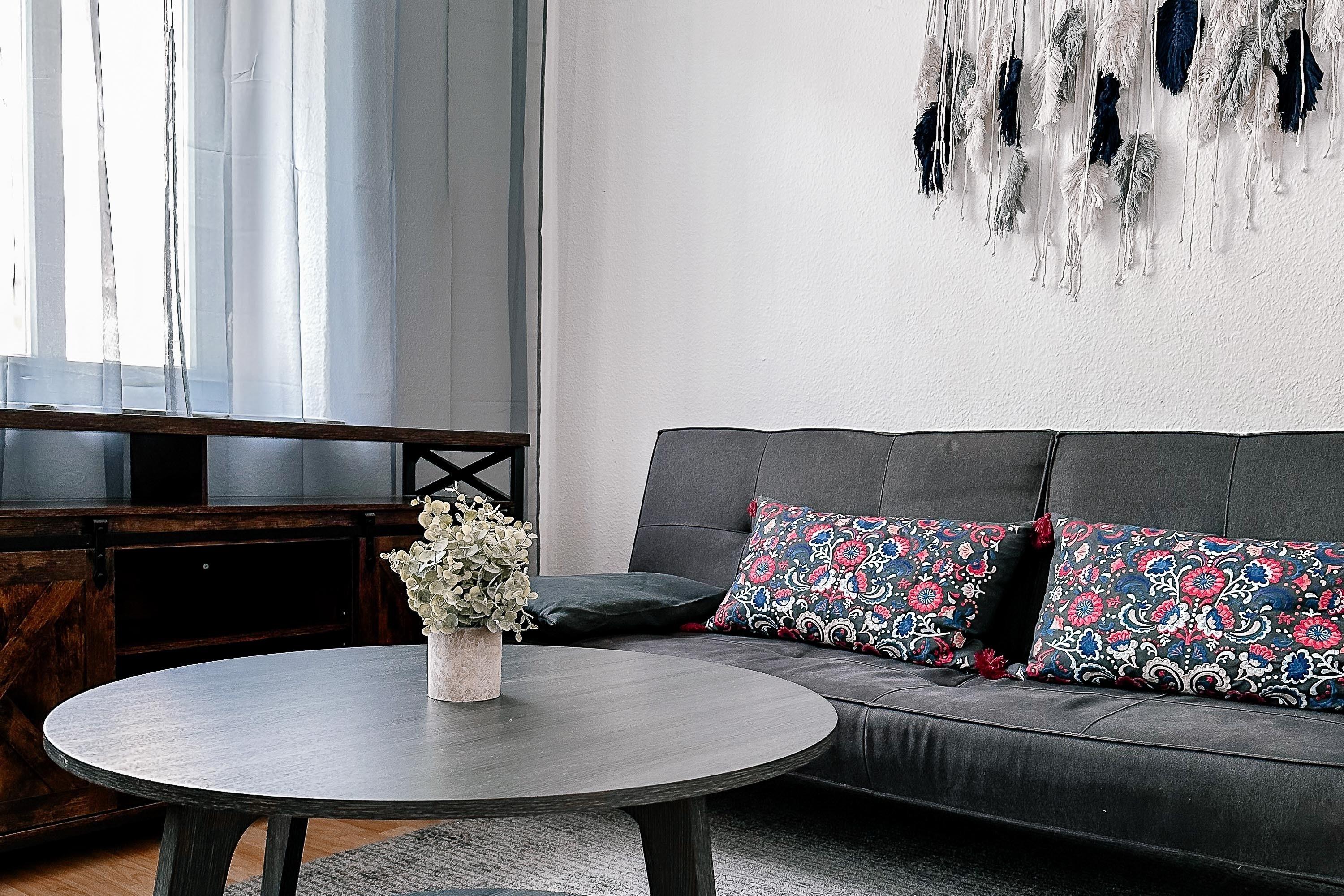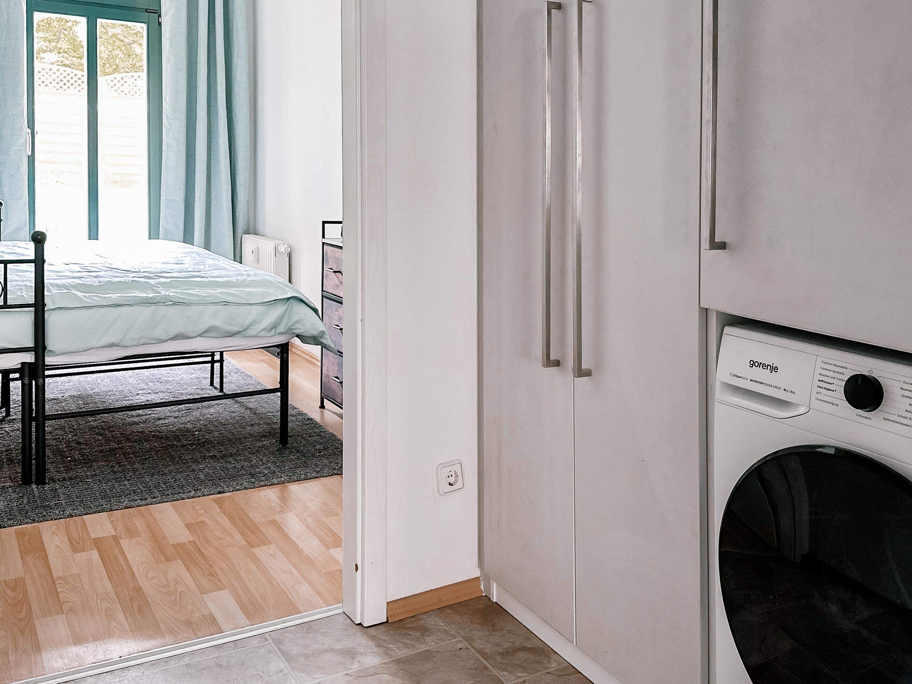 Die Ausstattung des Apartments umfasst ein gemütliches Wohnzimmer. Die offene Küche ist mit einer Mikrowelle sowie Küchenutensilien ausgestattet. Für längere Aufenthalte befinden sich auch ein Trockner und eine Waschmaschine in der Ferienunterkunft.