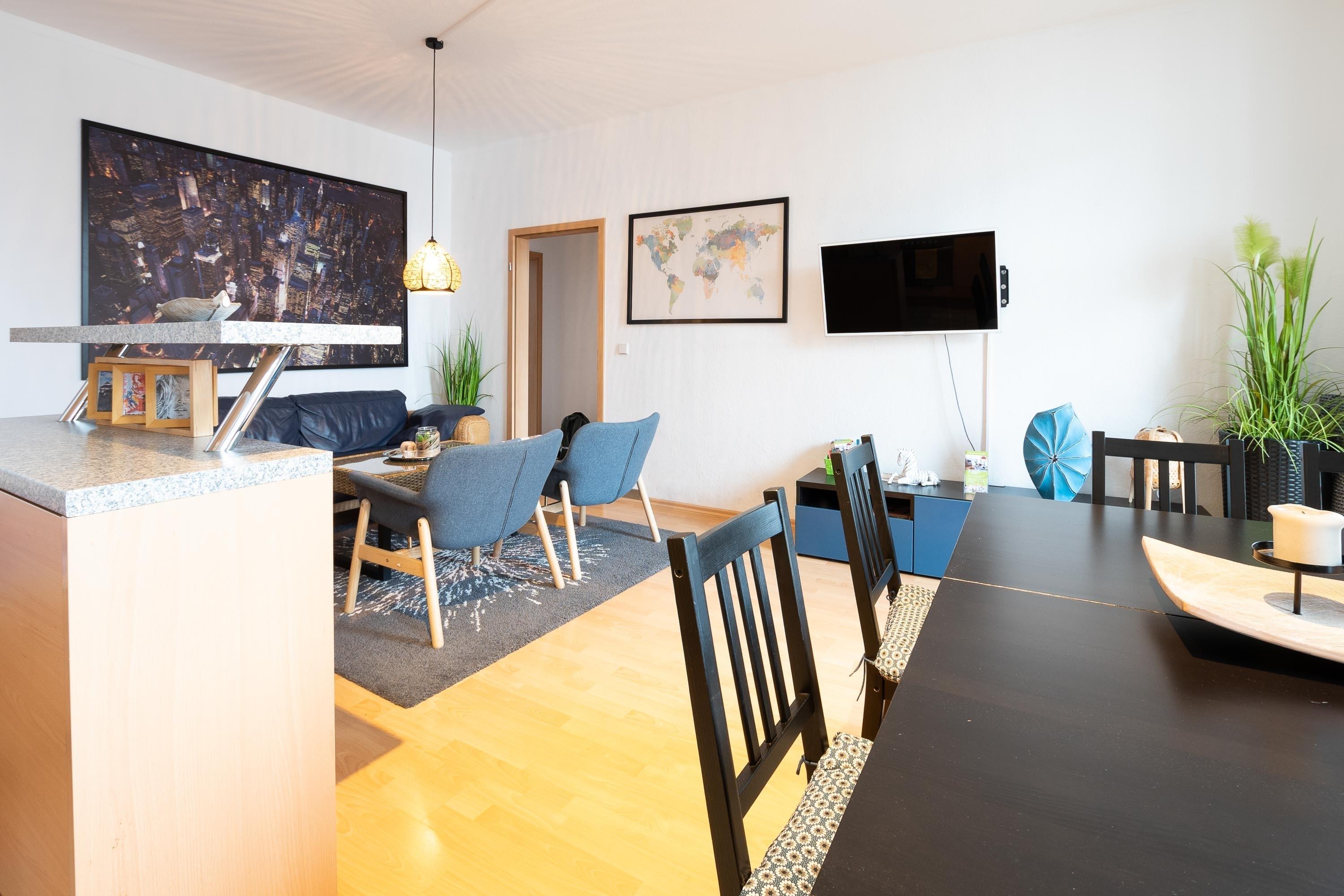 Die Ausstattung des Apartments umfasst ein gemütlichen Wohnzimmer mit offener Küche und einem großen Esstisch für gesellige Abende, einen Flachbild-TV, sowie einen Internetzugang via WLAN. Die offene Wohnküche ist mit einer Kaffeemaschine (Filter), einer Mikrowelle, einem Wasserkocher, einem Toaster und einer Spülmaschine ausgestattet. Für längere Aufenthalte befinden sich auch ein Trockner und eine Waschmaschine in der Ferienunterkunft.