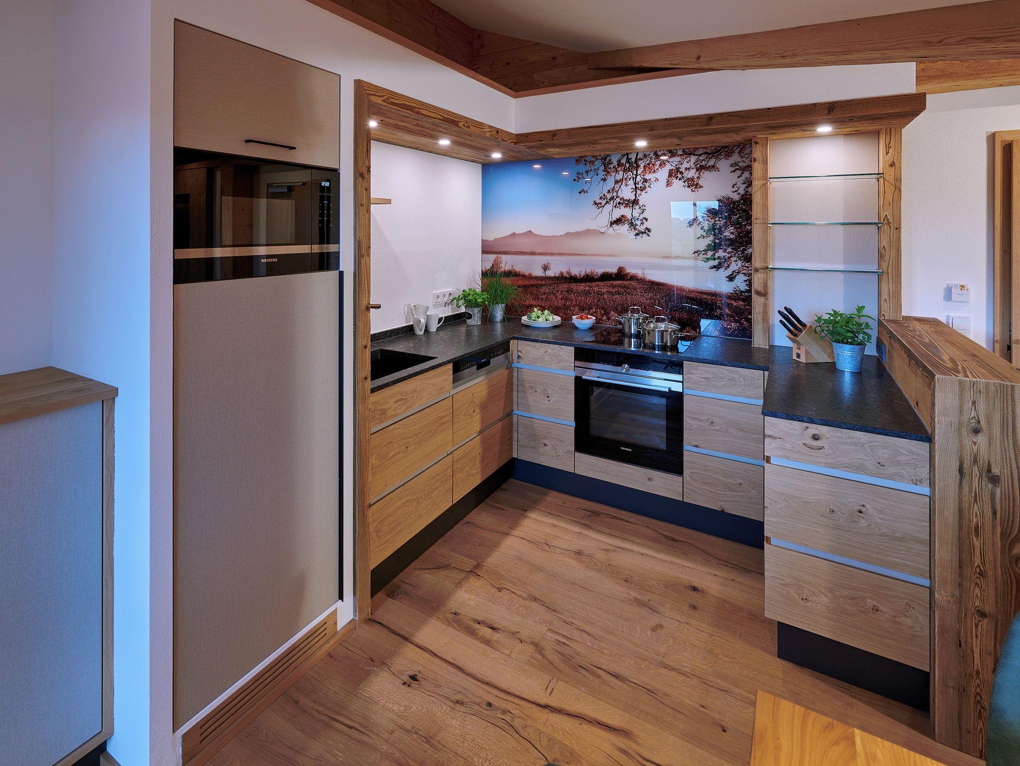 • Komplett ausgestattete Küche mit E-Herd, Backofen, Kühlschrank mit Gefrierfach, Mikrowelle, Geschirrspüler, Kaffeepadmaschine, Wasserkocher und Toaster