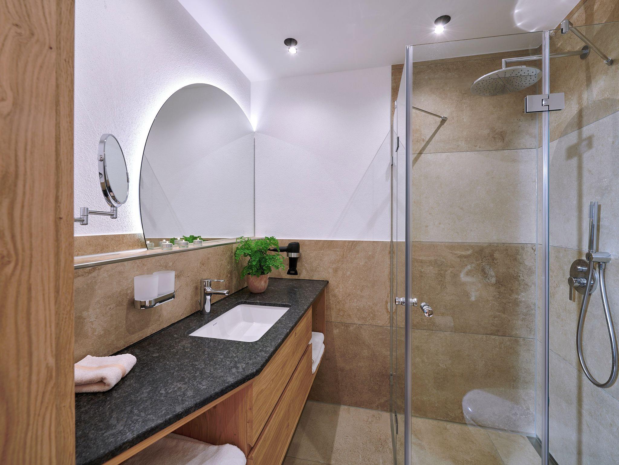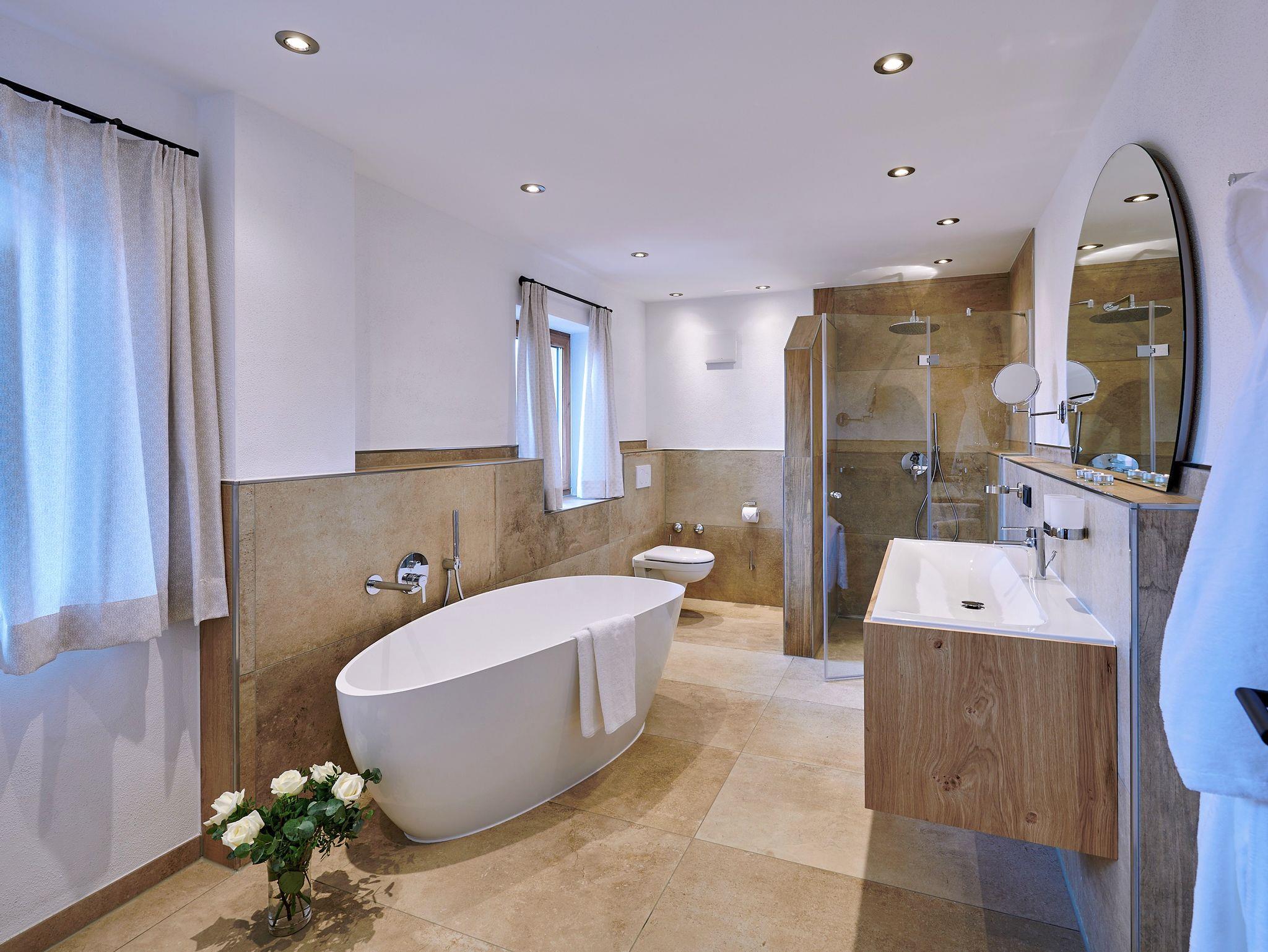 • 1 Eltern-Badezimmer mit begehbarer bodengleicher Regendusche, frei stehender Badwanne, WC, Föhn, beheizbarem Handtuchtrockner und Schminkspiegel
