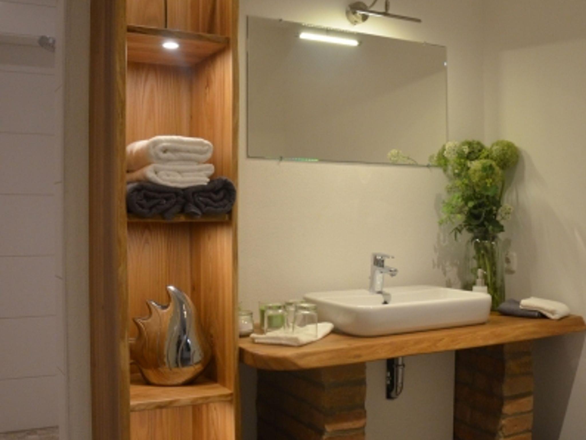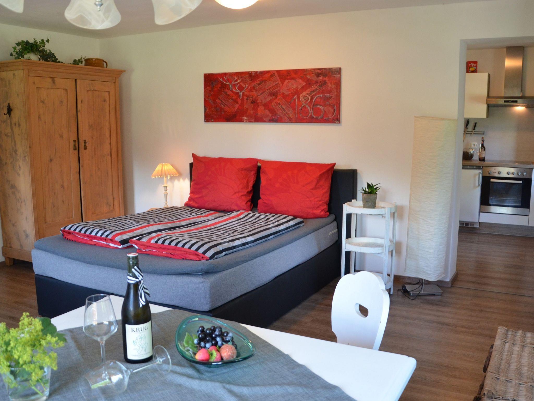 Im kombinierten Wohn- und Schlafraum befindet sich ein Boxspring-Doppelbett, eine ausziehbare Schlafcouch, Essecke, SAT-TV und W-LAN. Eine separate Küche ist mit Küchenutensilien, Kaffeemaschine, Wasserkocher, Kühlschrank sowie Kochherd mit Backofen eingerichtet. Das Badezimmer hat eine begehbare Dusche und ist mit Hand-/Badetüchern sowie mit Fön und Toilettenartikeln versehen. Keine Tiere, Nichtraucher Kostenlose Unterstellmöglichkeit in abschließbarer Garage für Fahrräder, Bikes od. andere Sportgeräte. Separater Garten mit überdachten Freisitz.