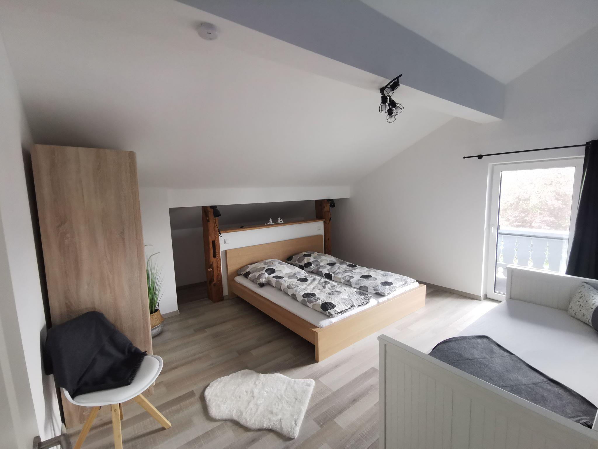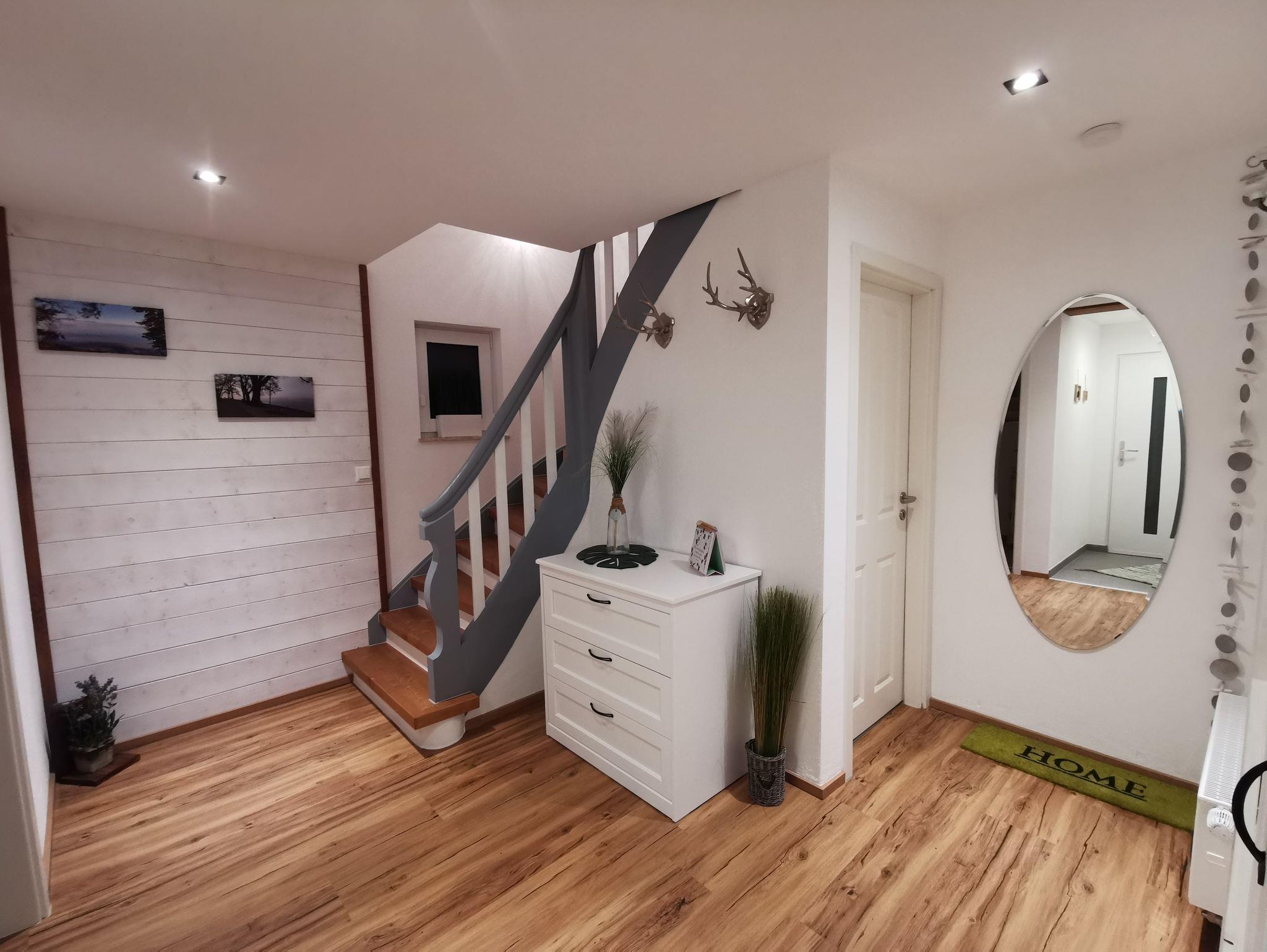 Unsere Ferienwohnung verfügt über alles, das man für einen schönen Urlaub mit oder ohne Kinder benötigt. Ausgelegt auf möglichst hohen Komfort und Sicherheit für Kinder. Auf großzügigen 85 m² findet man eine komplett ausgestattete Küche mit Microwelle, Wasserkocher, Kaffeemaschine, Spülmaschine mit Tabs, Spülmittel und natürlich sämtliche Küchenutensilien. Ein großer Esstisch lädt zum Verweilen ein. Bei Bedarf bekommen Sie natürlich auch einen Hochstuhl. Das gemütliche Wohnzimmer kann mit einem Vorhang abgetrennt werden und verfügt über eine breite Schlafcouch für 2 Personen mit extra Matratzenauflage und Smart TV. Des Weiteren befindet sich im Erdgeschoss eine separate Toilette.Im ersten Obergeschoss finden Sie ein sehr großzügiges Bad mit großer Regendusche und WC. Bei Bedarf erhalten Sie natürlich eine Babybadewanne sowie Hocker und Wickelauflage. Das große Schlafzimmer mit direktem Zugang zum Balkon ist mit einem Doppelbett, einem Einzelbett, (bei Bedarf wird ein Babybett oder Beistellbett (BabyBay) zugestellt), einem Kleiderschrank und einem Smart TV ausgestattet. Der angrenzende Balkon ist mit einer kleinen Sitzgelegenheit versehen.Unsere Ferienwohnung hat einen eingezäunten Garten mit einer kleinen Terrasse mit Essecke. In unserem liebevoll gestalteten Garten können unsere großen und kleinen Gäste die Seele baumeln lassen. Der Parkplatz befindet sich unmittelbar vor der Unterkunft.