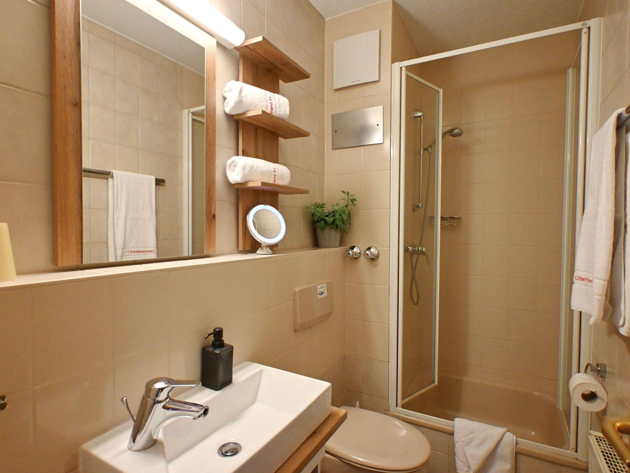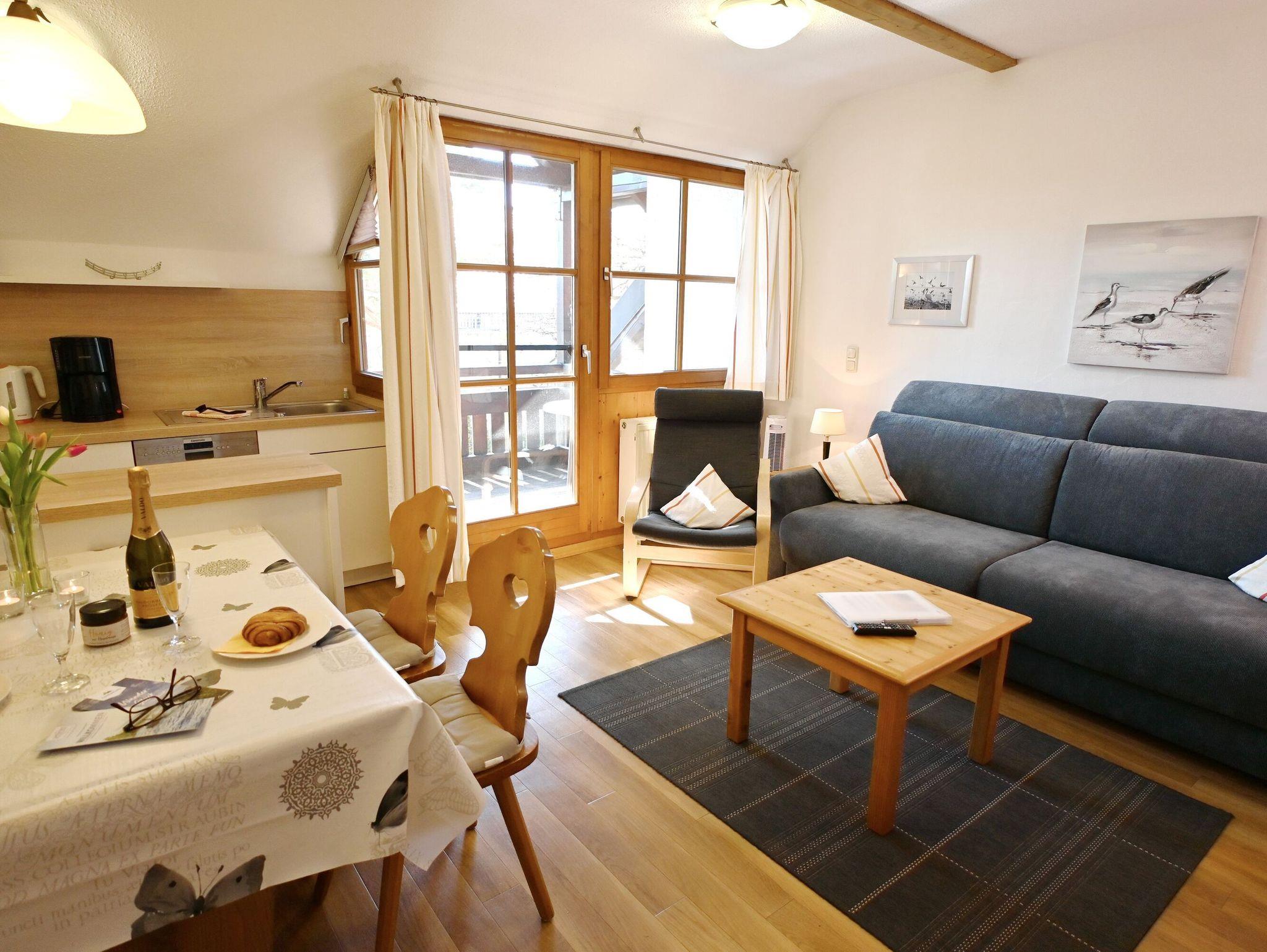 Das Apartment befindet sich im 2. Stockwerk der Ferienresidenz Chiemseestrand und verfügt über einen Wohn- und Essbereich mit offener Küche. Der überdachte Holzbalkon (ohne Seeblick) ist über den Wohnbereich erreichbar. Neben einem Schlafzimmer mit Doppelbett steht als weitere Schlafgelegentheit das Schlafsofa im Wohnbereich zur Verfügung, welches mit echter Matratze versehen ist. Der pflegeleichte Boden in Holzoptik verleiht eine gemütliche Atmosphäre. Das Badezimmer mit Dusche und WC vervollständigt das Feriendomizil.