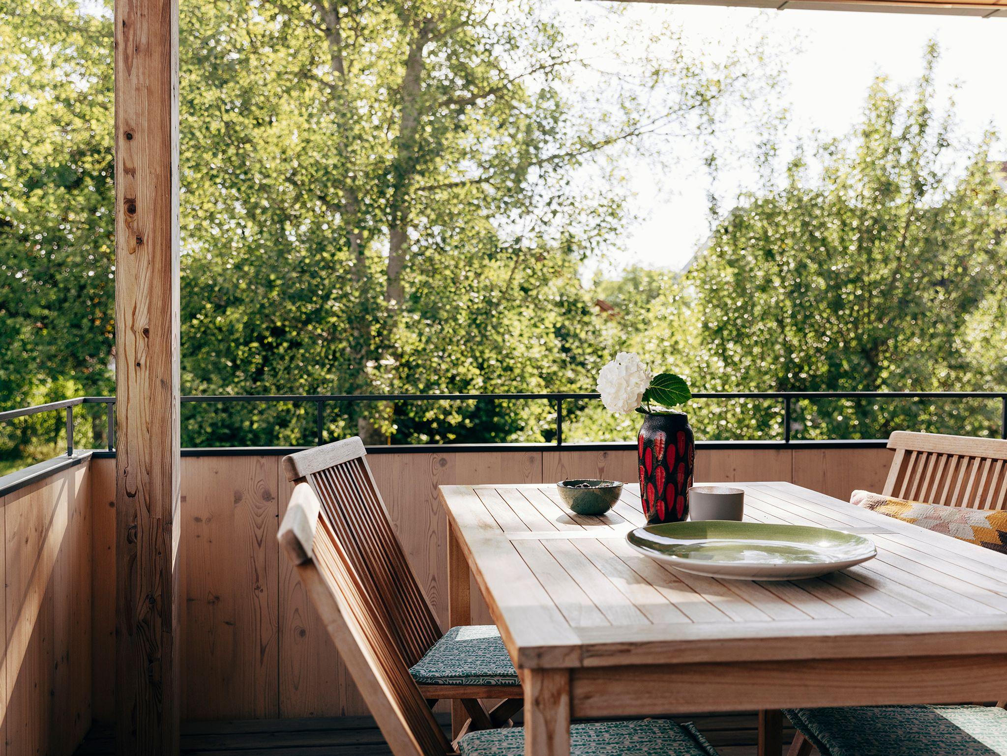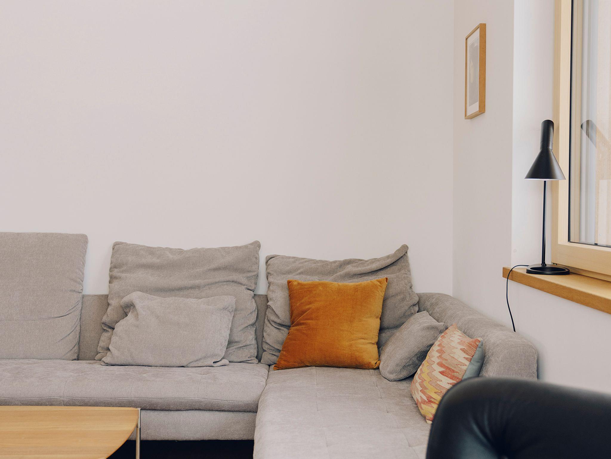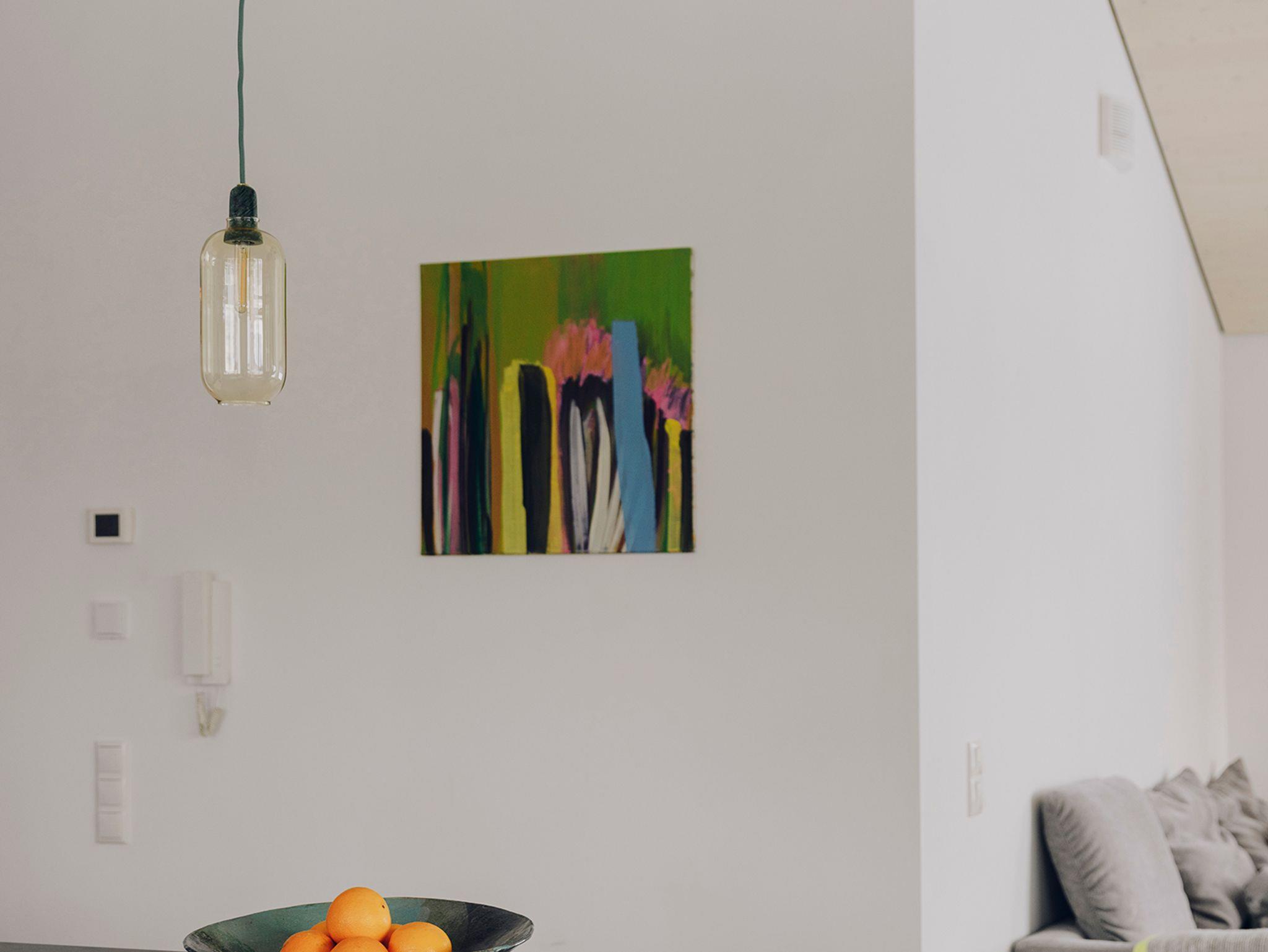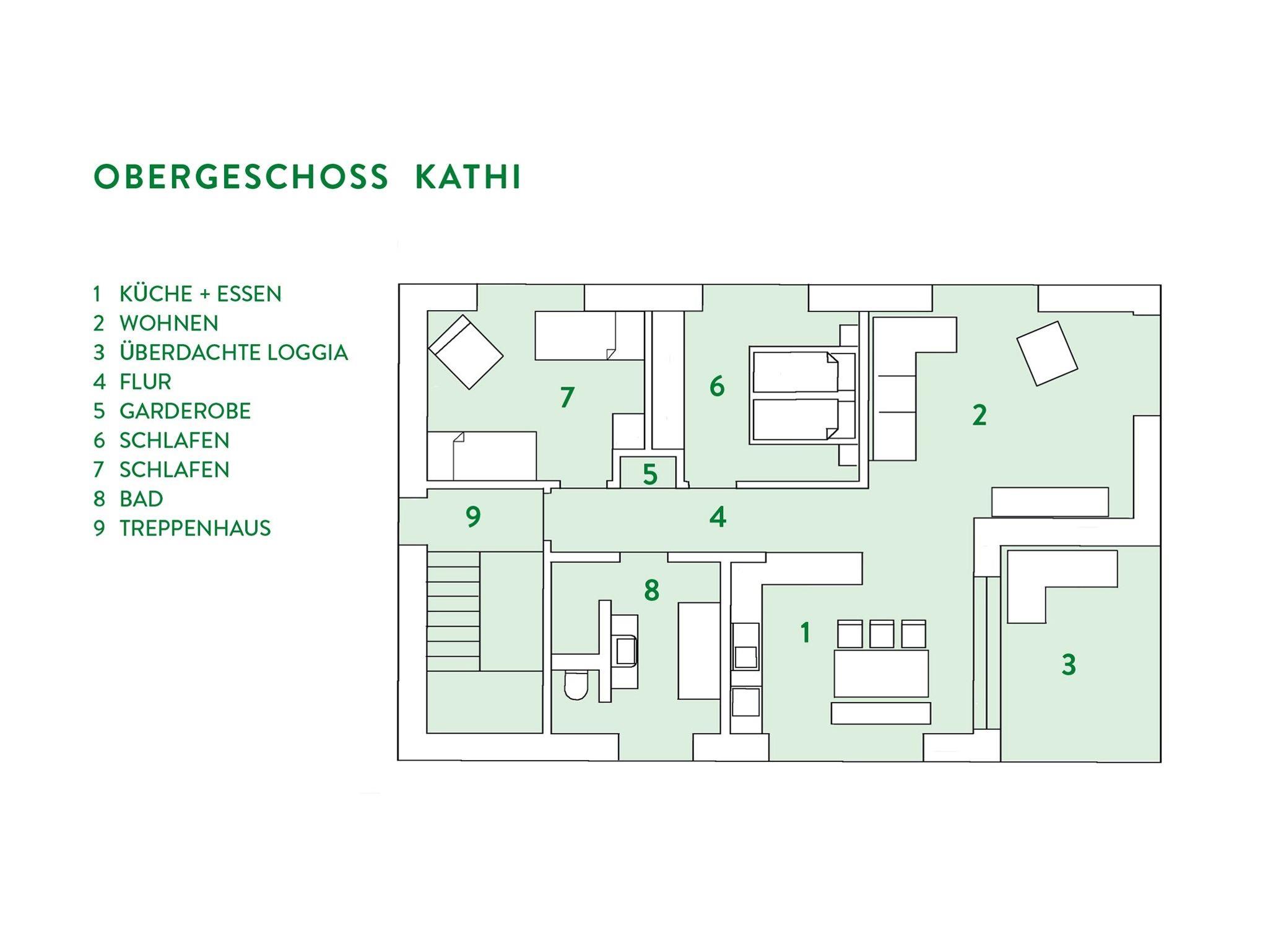Die Ferienwohnung KATHI im Obergeschoss besticht durch ihre Raumhöhe von bis zu 4 m. Sie bietet viel Privatsphäre und Geborgenheit. Beim Blick aus dem Küchenfenster in die Kronen hoher Bäume fühlt man sich beinahe wie in einem Baumhaus. Das Wohnzimmer mit exklusiver Sofalandschaft, dänischem Sideboard und Lounge-Chair besitzt zudem ein Panoramafenster mit integrierter Sitzbank und Bergblick. Von der maßgefertigten Schreinerküche mit gemütlichem Essplatz hat man Zugang auf die große, überdachte Loggia mit Frühstücks-Sitzplatz und Lounge-Sofa für den Drink zum Sonnenuntergang. Die beiden Schlafzimmer sind mit hochwertigen Betten ausgestattet. Das Elternschlafzimmer mit einem Boxspringbett (180 x 200cm), das Kinderzimmer mit zwei Einzelbetten (90 x 200cm). Das großzügige Tageslichtbad verfügt über Regendusche, WC-Nische, Badewanne und hochwertigen Accessoires.