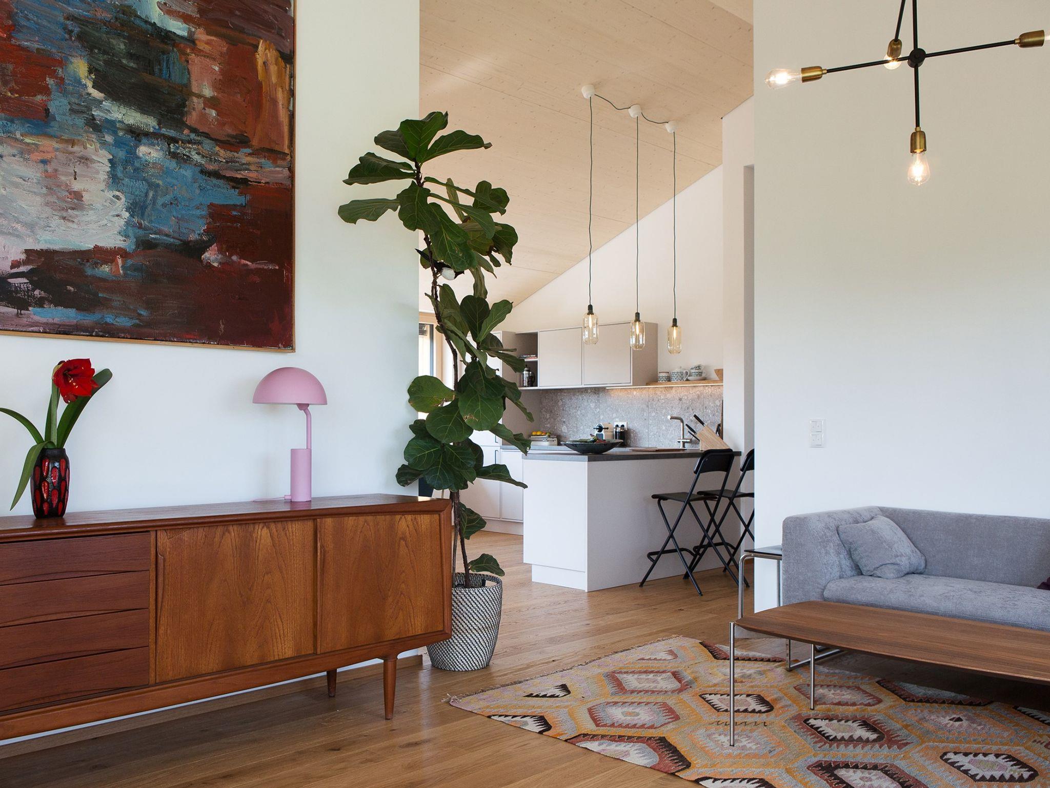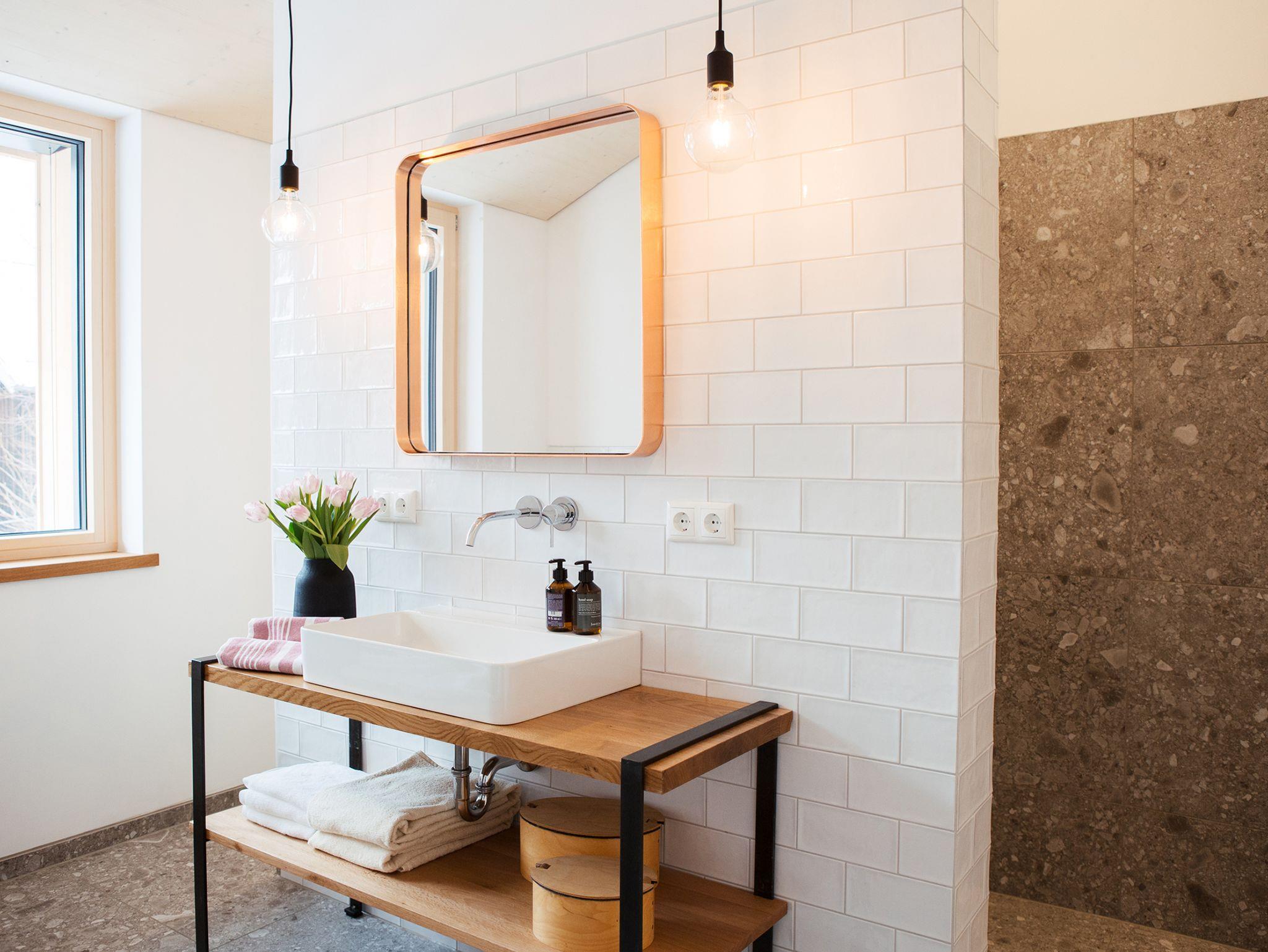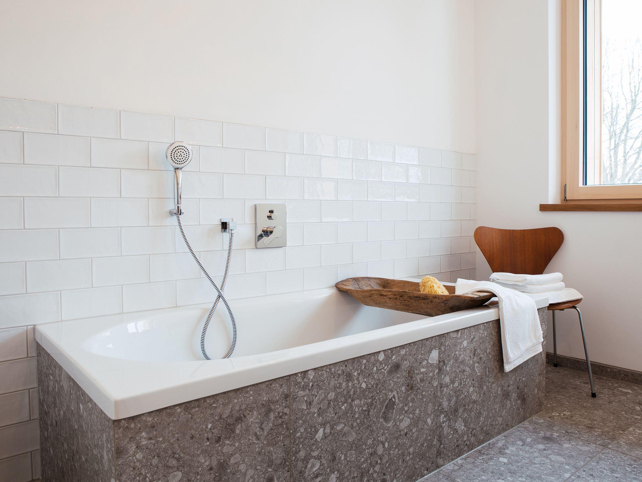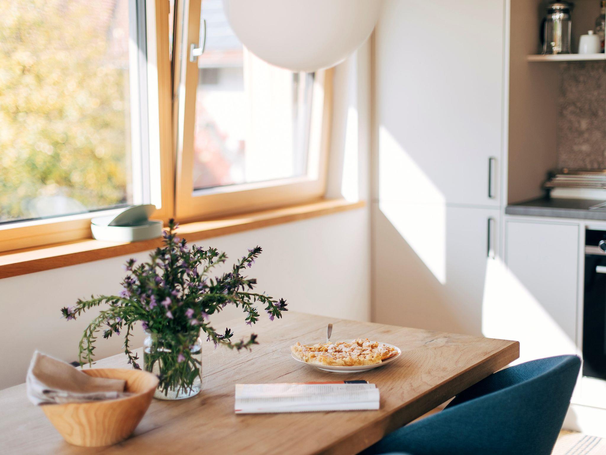 Die Ferienwohnung KATHI im Obergeschoss besticht durch ihre Raumhöhe von bis zu 4 m. Sie bietet viel Privatsphäre und Geborgenheit. Beim Blick aus dem Küchenfenster in die Kronen hoher Bäume fühlt man sich beinahe wie in einem Baumhaus. Das Wohnzimmer mit exklusiver Sofalandschaft, dänischem Sideboard und Lounge-Chair besitzt zudem ein Panoramafenster mit integrierter Sitzbank und Bergblick. Von der maßgefertigten Schreinerküche mit gemütlichem Essplatz hat man Zugang auf die große, überdachte Loggia mit Frühstücks-Sitzplatz und Lounge-Sofa für den Drink zum Sonnenuntergang. Die beiden Schlafzimmer sind mit hochwertigen Betten ausgestattet. Das Elternschlafzimmer mit einem Boxspringbett (180 x 200cm), das Kinderzimmer mit zwei Einzelbetten (90 x 200cm). Das großzügige Tageslichtbad verfügt über Regendusche, WC-Nische, Badewanne und hochwertigen Accessoires.