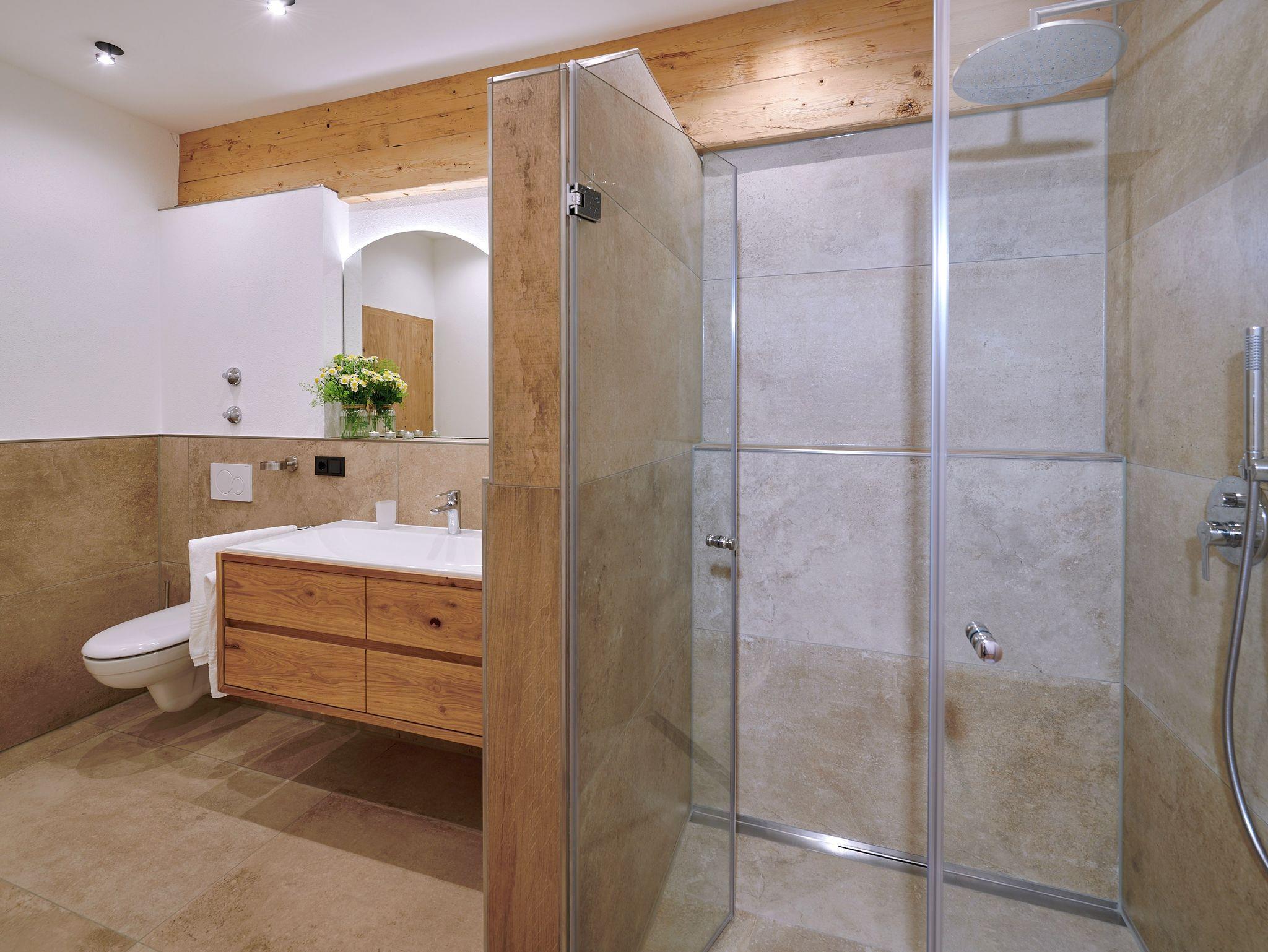 • 1 Badezimmer mit begehbarer bodengleicher Regendusche, WC, Föhn, beheizbarem Handtuchtrockner und Schminkspiegel