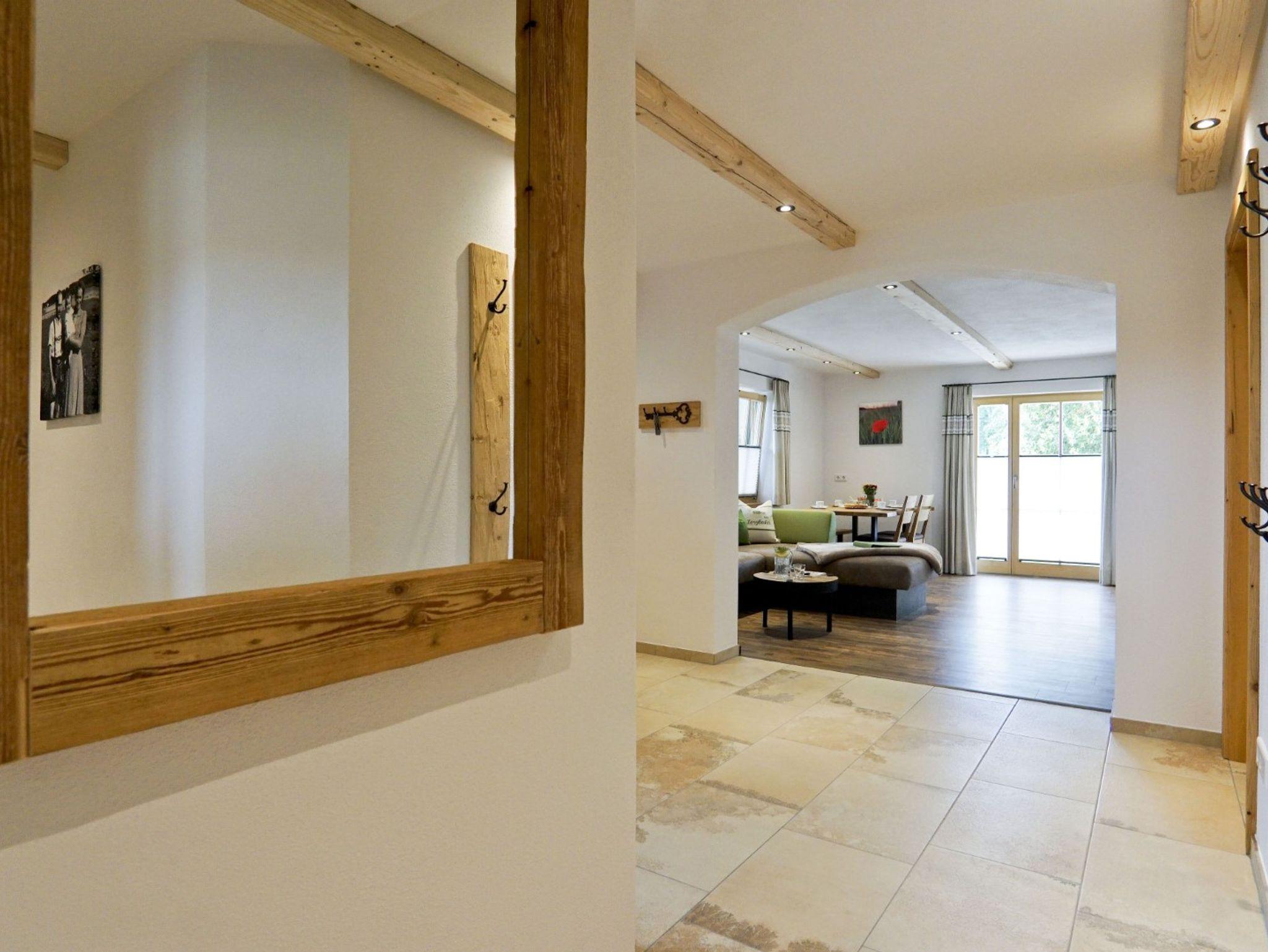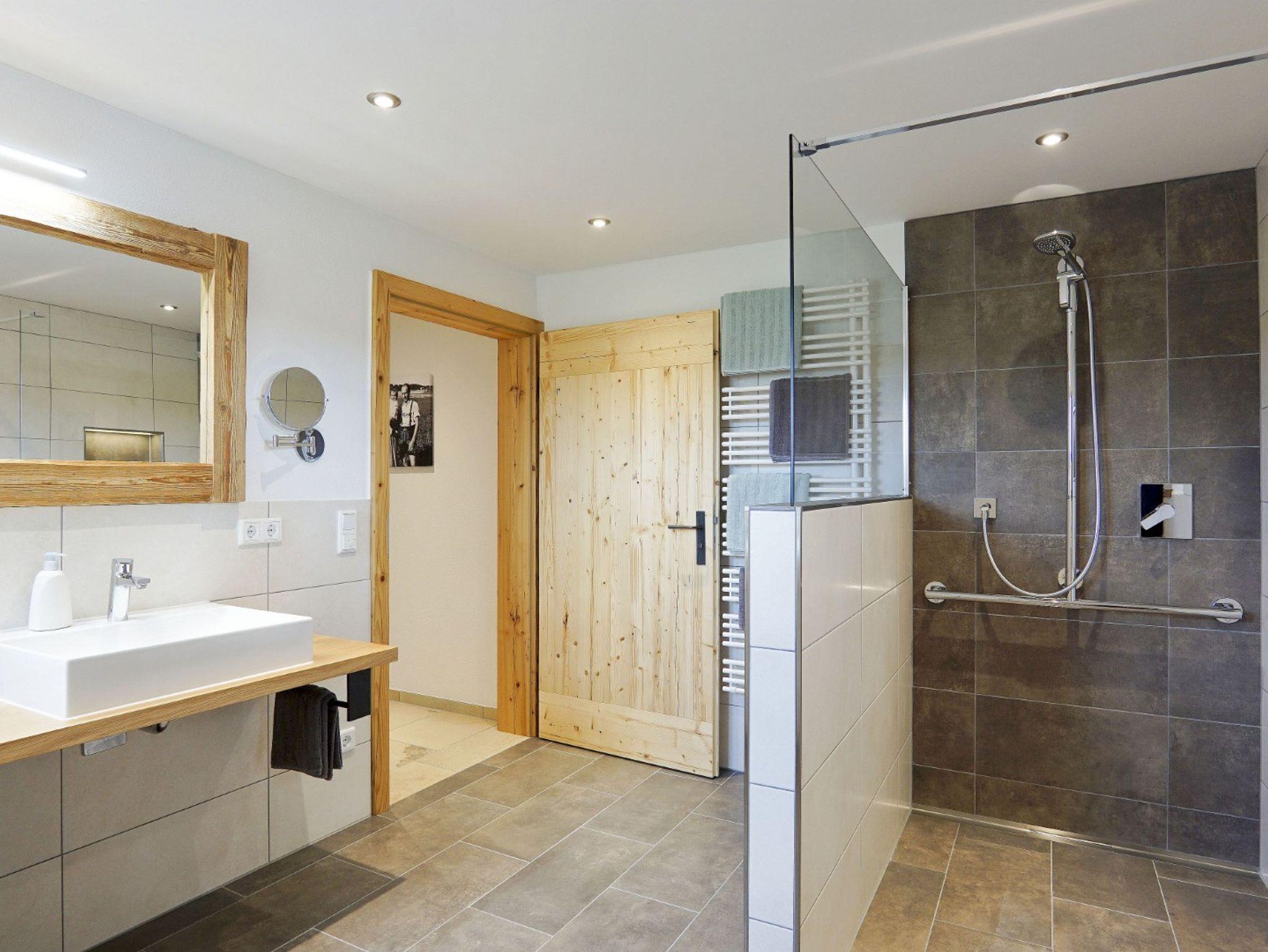 Im Erdgeschoss unseres neu renovierten Bauernhauses befindet sich die ca. 60m² große, liebevoll eingerichtete, barrierearma Ferienwohnung mit großer Wohnküche. Der Wohn-Essbereich ist mit großem Esstisch, Eckcouch, Fernseher mit integriertem Radio und USB-Anschluss ausgestattet. Die Küchenzeile mit Kühlschrank, Tiefkühlfach, Kaffeemaschine, Eierkocher, Wasserkocher, Toaster, Elektroherd und Spülmaschine. Das Elternschlafzimmer ist mit einem Doppelbett, extra Fernseher und hochwertigen Bettdecken und Kissen ausgestattet, welche Großteiles aus eigener Alpaka-Wolle hergestellt wurden und ideal geeignet sind für Allergiker. Das Kinderzimmer ist ausgestattet für zwei Kinder und hat ein Etagenbett. Im Bad befindet sich eine große Dusche, WC und auch ein Kosmetikspiegel und Fön, sowie Handtücher und Toilettenartikel sind vorhanden. Auch ein Babybett und einen Hochstuhl können Sie bei uns auf Anfrage nutzen. Der Balkon der Ferienwohnung ist nach Süden ausgerichtet und bietet mit den Balkonmöbeln Platz zum Entspannen. Zudem bietet diese Wohnung auch eine Große Terrasse mit zusätzlichen Sitzgelegenheiten und einer Grillmöglichkeit. Für Ihre E-Bikes und auch das Elektroauto ist eine E-Ladestation vorhanden.