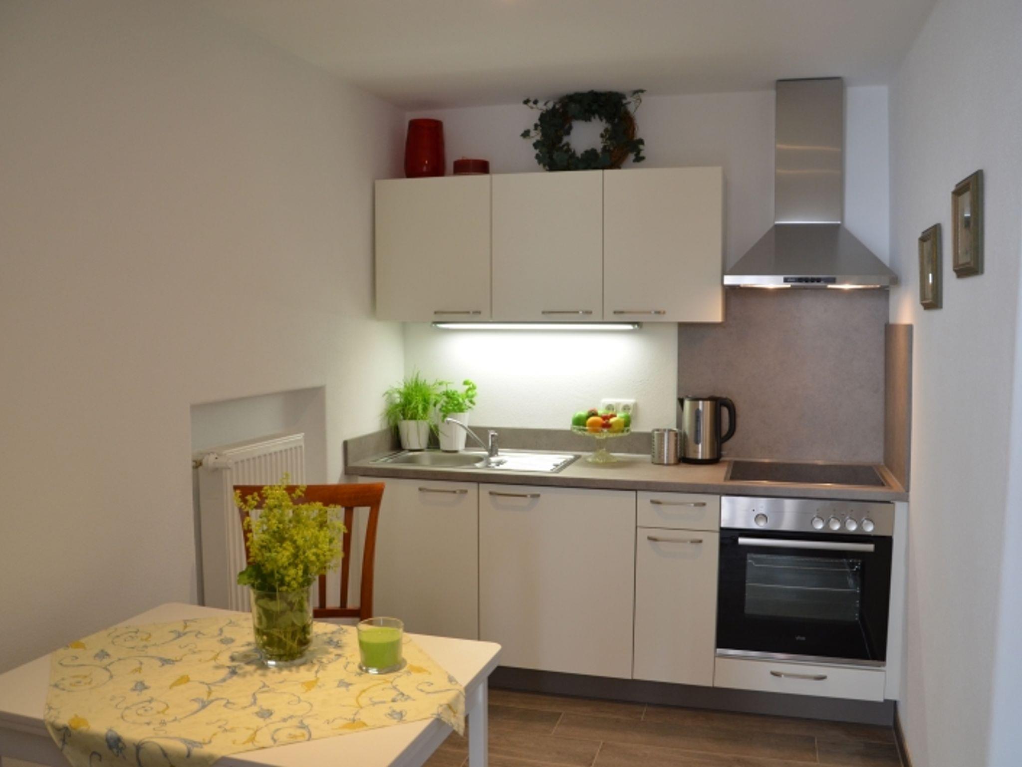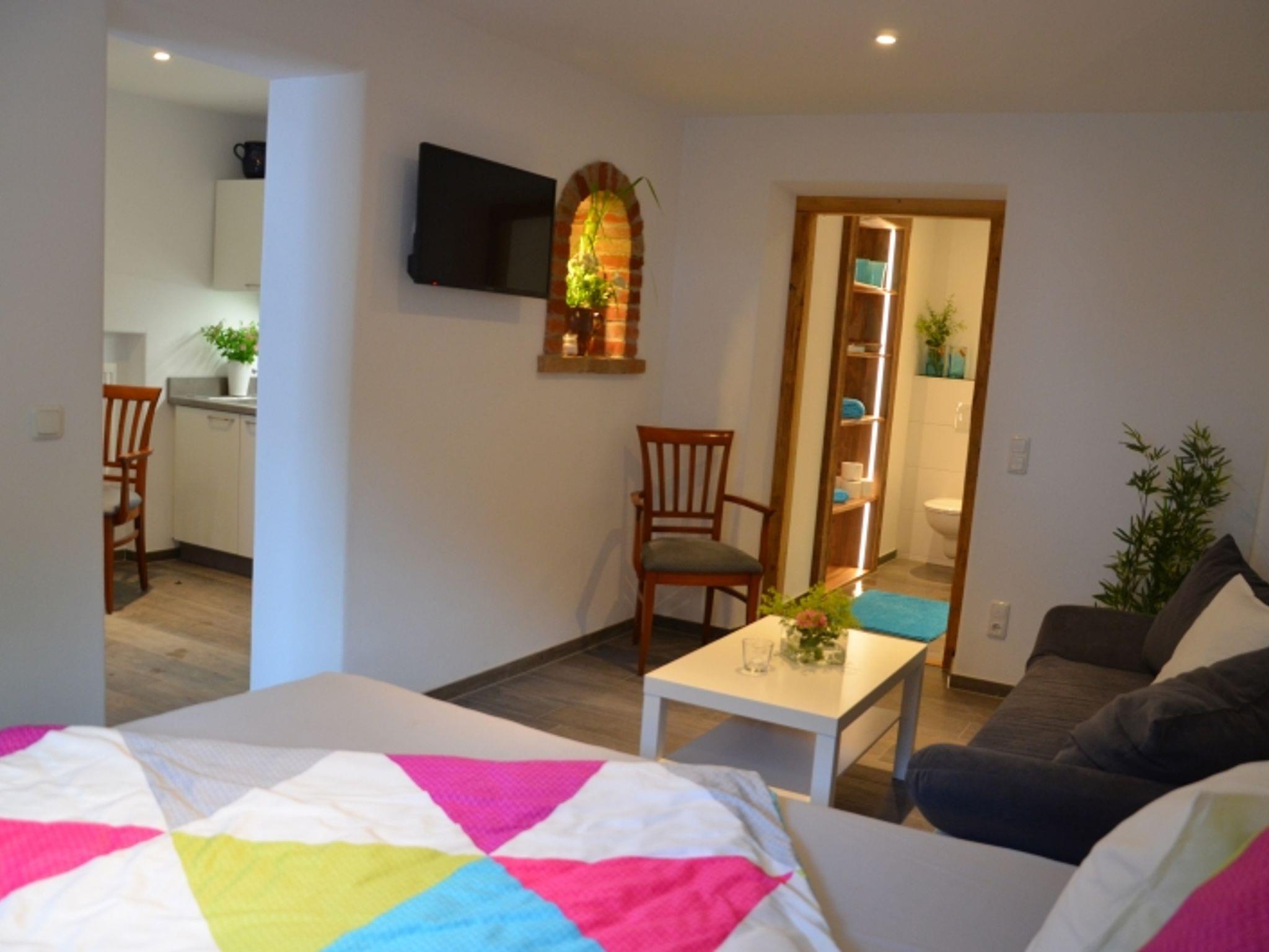2016 neu fertiggestellte Ferienwohnung. Im kombinierten Wohn- und Schlafraum befindet sich ein Boxspring-Doppelbett, eine ausziehbare Schlafcouch, Essecke, SAT-TV und W-LAN. Eine separate Küche ist mit Küchenutensilien, Kaffeemaschine, Wasserkocher, Kühlschrank sowie Kochherd mit Backofen eingerichtet. Das Badezimmer hat eine begehbare Dusche und ist mit Hand-/Badetüchern sowie mit Fön und Toilettenartikeln versehen. Keine Tiere, Nichtraucher. Kostenlose Unterstellmöglichkeit in abschließbarer Garage für Fahrräder, Bikes od. andere Sportgeräte.Separater Garten mit überdachten Freisitz.