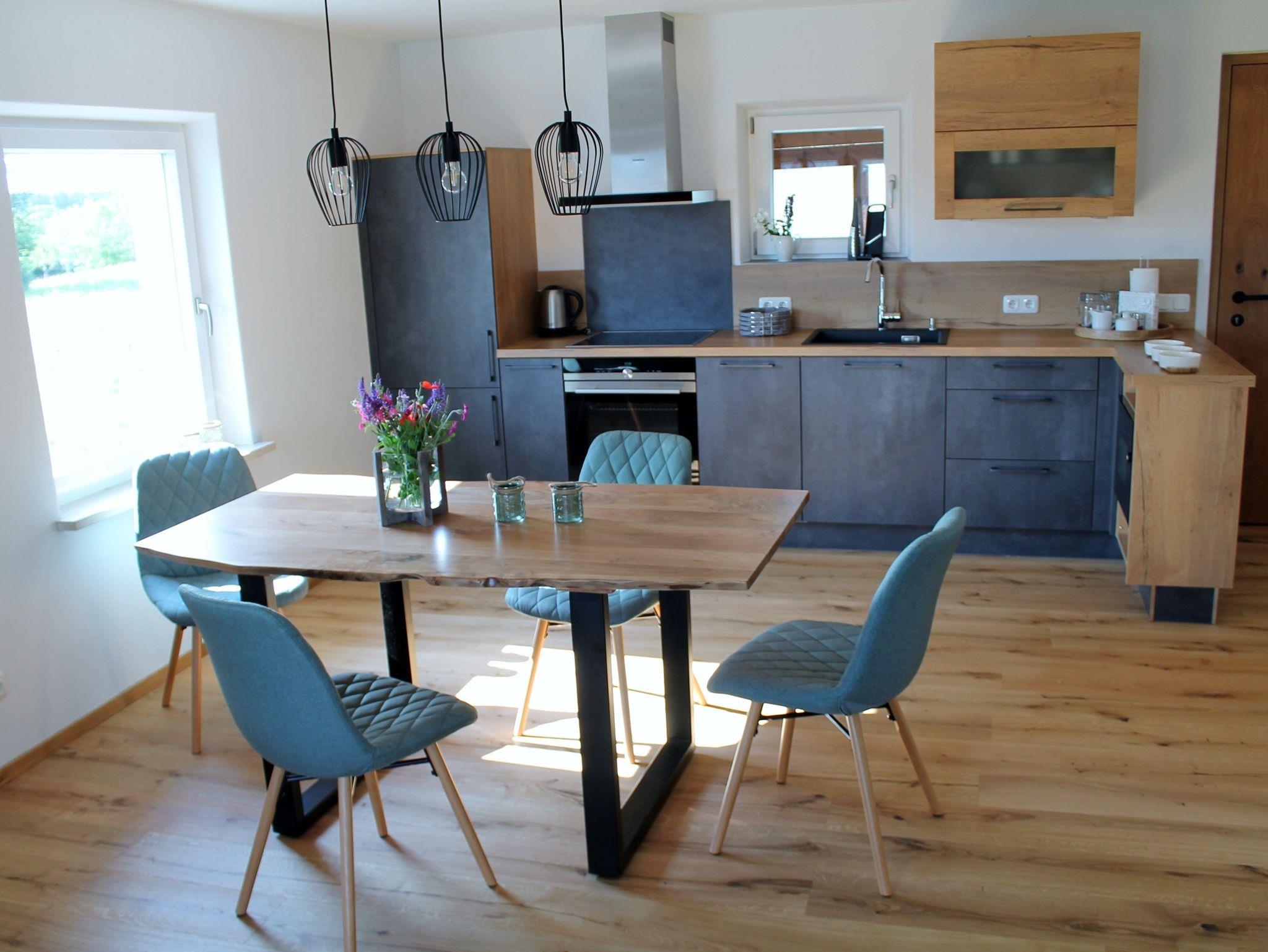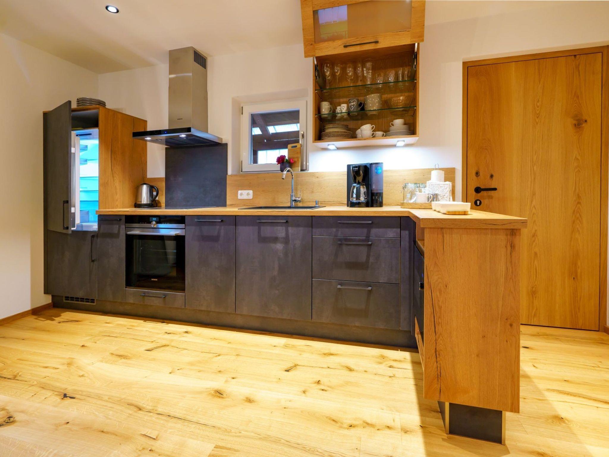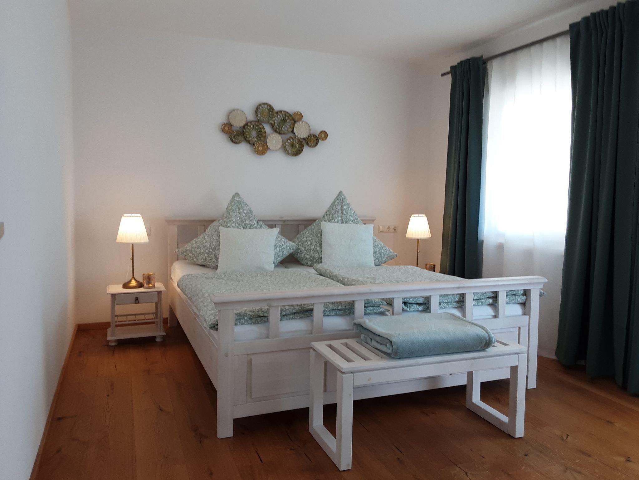 Unsere offene Wohnküche lädt Sie ein zum Kochen, Essen und Plaudern. Sie verfügt über einen großzügigen Koch-Essbereich der in die TV- Ecke übergeht. Die Küchenzeile ist gut ausgestattet mit einem Backofen, Cerankochfeld, Kühl-Gefrierkombination, Spülmaschine, Kaffeemaschine, Mikrowelle, Toaster, Wasserkocher. In der TV Ecke finden Sie eine Couch mit Schlaffunktion,einen Flach-TV und eine Leselampe. Nutzen Sie unser freies WLAN.Das helle Badezimmer besticht durch seine Regendusche und den Waschtisch aus echtem Holz.WC, Waschmaschine, Handtuchtrockner, Fön und Handtücher sind in dem geräumigen Bad vorhanden. Sanften und erholsamen Schlaf verbringen Sie in einem weißen, romantischen Doppelbett im schlichten Design, der freundliche und warme Stil hat eine beruhigende Wirkung. Für die Unterbringung Ihrer Bekleidung dient ein 2-türiger Kleiderschrank aus Holz. Zur Abdunkelung der Räumlichkeiten gibt es in jedem Zimmer farblich abgestimmte Vorhänge, Bettwäsche ist auch für Sie da. Relaxen Sie auf dem schönen Balkon der über den Wohn und Schlafbereich zu erreichen ist. Nutzen Sie die Sitzgelegenheit für ein schönes Frühstück und genießen Sie auf den Liegen den Ausblick auf die heimischen Berge.