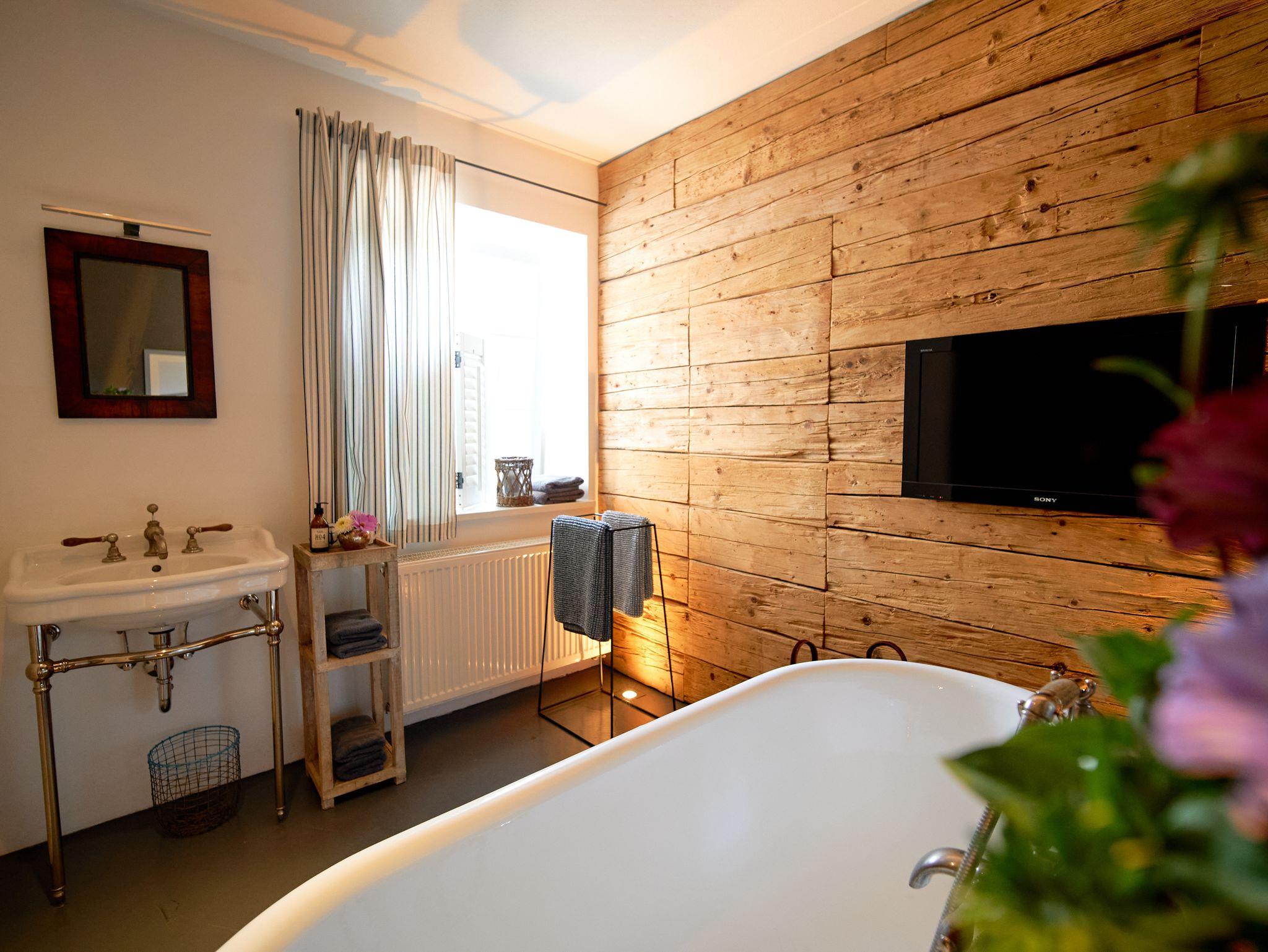 2 Badezimmer mit Dusche, Toilette, Waschbecken und eine Waschmaschine, Regenwasserdusche, freistehende Badewanne , TV