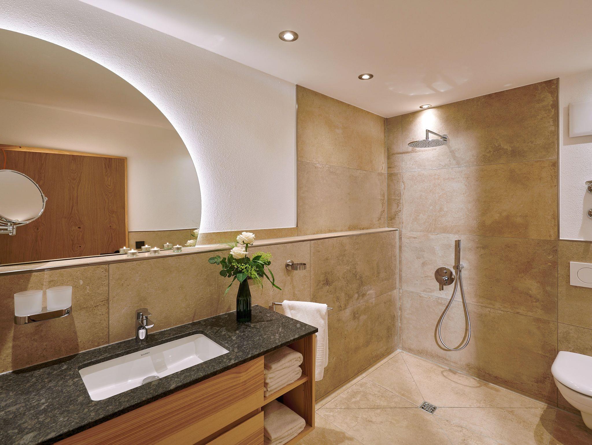 • 1 Badezimmer mit begehbarer bodengleicher Regendusche, WC, Föhn, beheizbarem Handtuchtrockner und Schminkspiegel