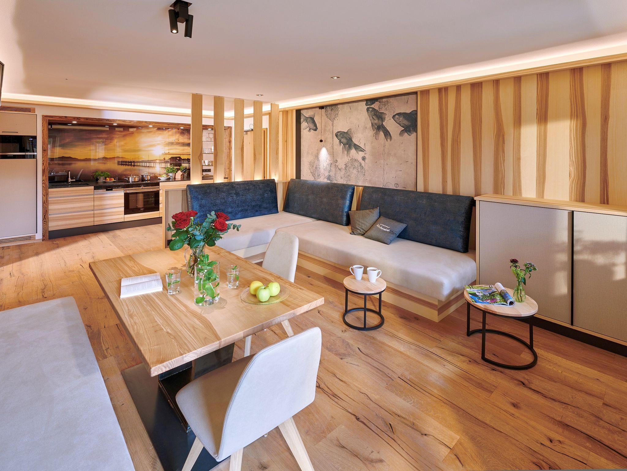 Erholung und Entspannung findest du in unserer luxuriösen 5-Sterne-Ferienwohnung Tiroler Ache im Erdgeschoss des Urlaubshofes Kirchmaier. Sofort nach deiner Ankunft wirst du dich in deinem Urlaubszuhause wohlfühlen. Das helle und offene Flair mit viel Echtholzausstattung wird durch die harmonisch aufeinander abgestimmte Inneneinrichtung sowie das luxuriöse Badezimmer mit Regendusche abgerundet. Auf der großzügigen Westterrasse mit Seeblick kannst du die Seele baumeln lassen, die traumhafte Natur rund um unseren Ferienhof genießen und bei einem unvergesslichen Sonnenuntergang den Urlaubstag ausklingen lassen.