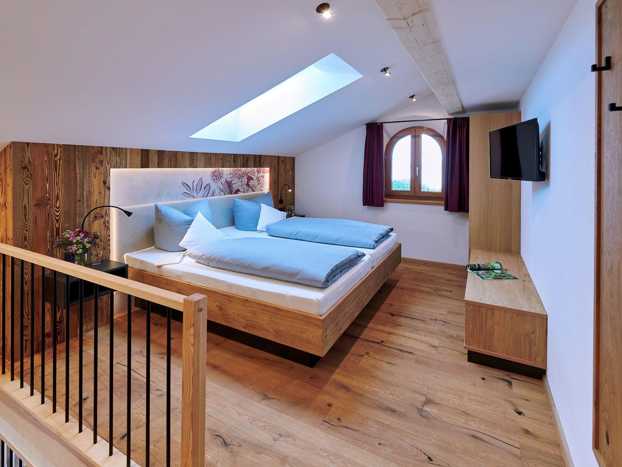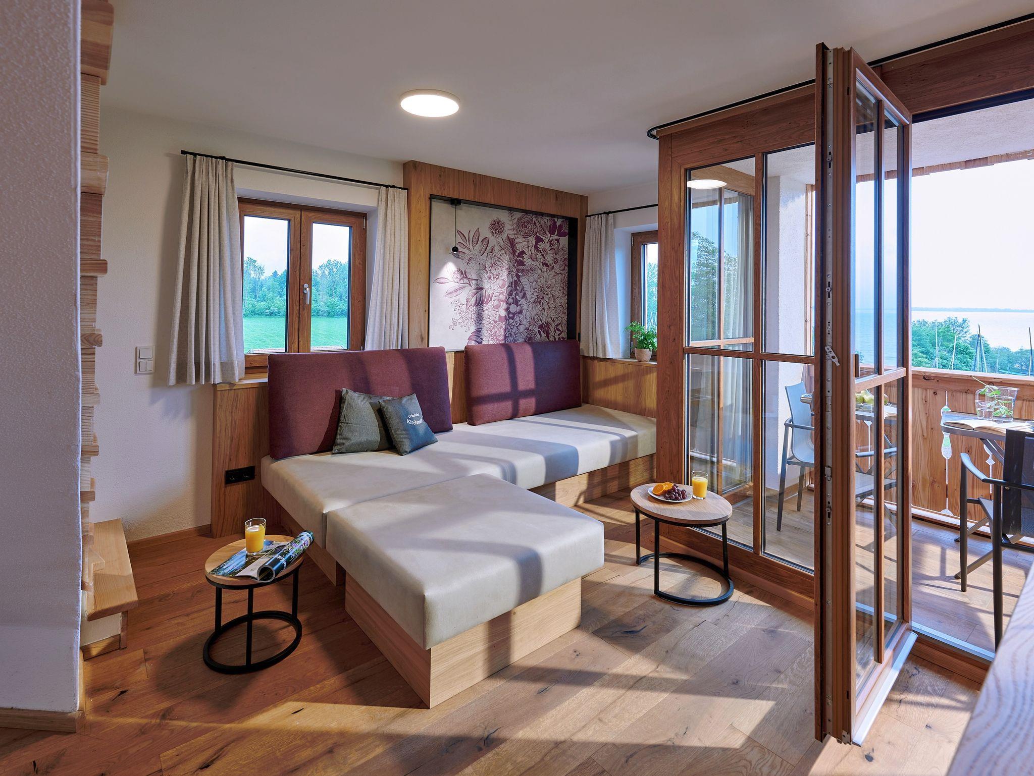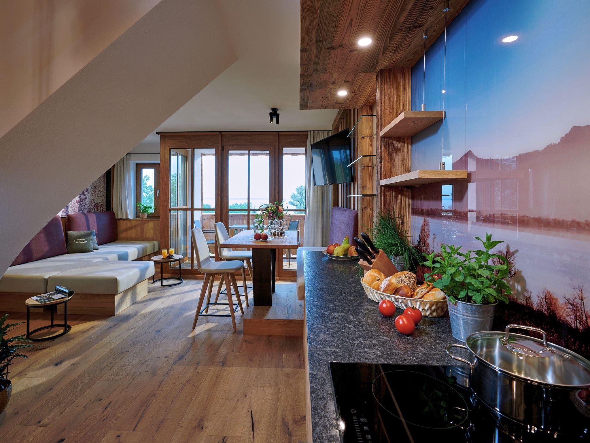 In der liebevoll mit natürlichen Materialien ausgestatteten 5-Sterne-Luxus-Ferienwohnung Herreninsel wirst du dich sofort wie zu Hause fühlen. Die dezenten, aufeinander abgestimmten Farben kombiniert mit viel Echtholz sorgen für einen urigen Charakter, und die vielen Glastüren und Dachfenster lassen die Wohnung hell und lichtdurchflutet wirken. Die beiden luxuriös gestalteten Badezimmer, eines davon mit frei stehender Badewanne, runden das Wohlfühlambiente ab. Eines der Highlights der Wohnung stellt der große Südbalkon mit traumhaftem Seeblick dar.