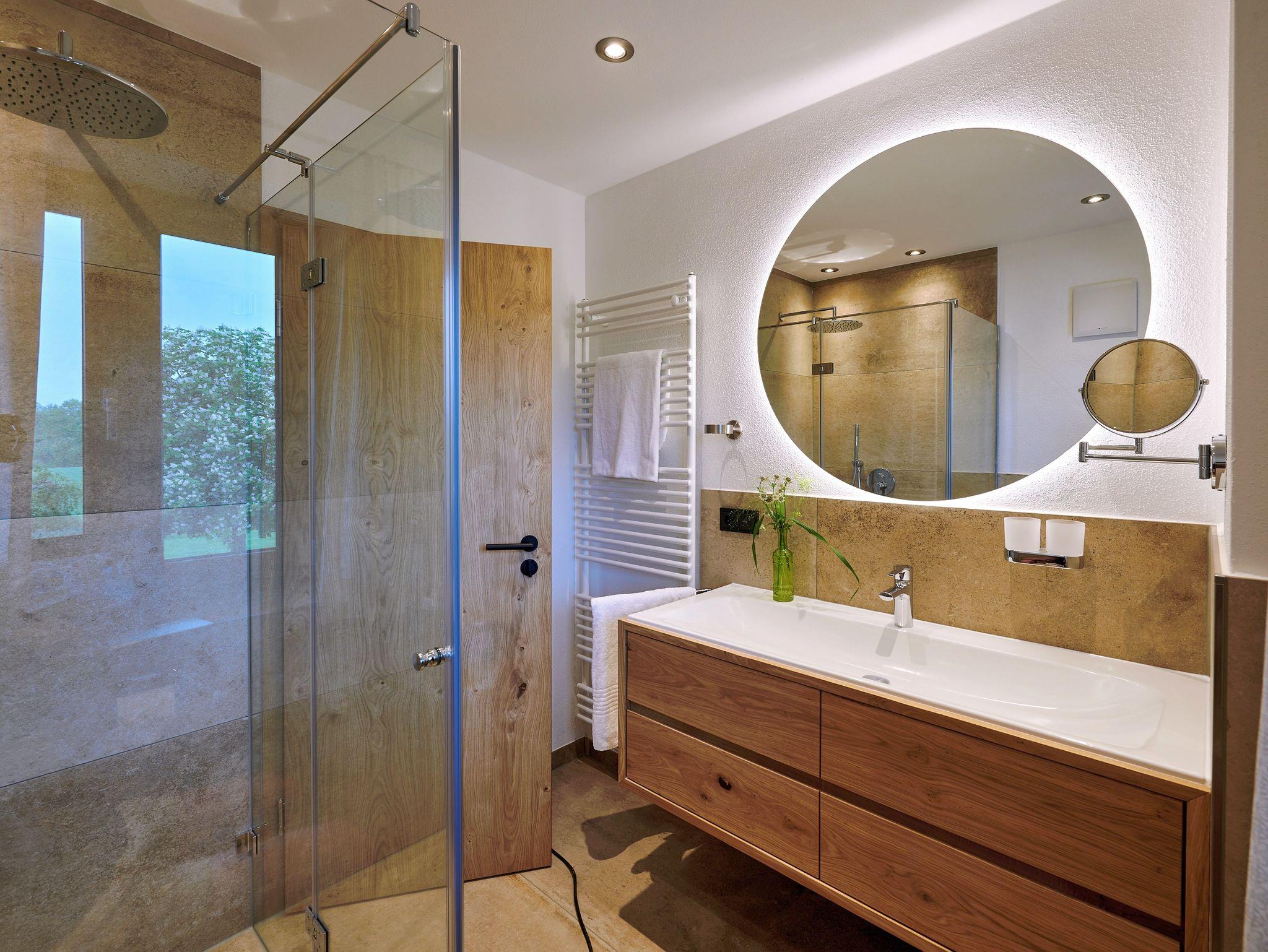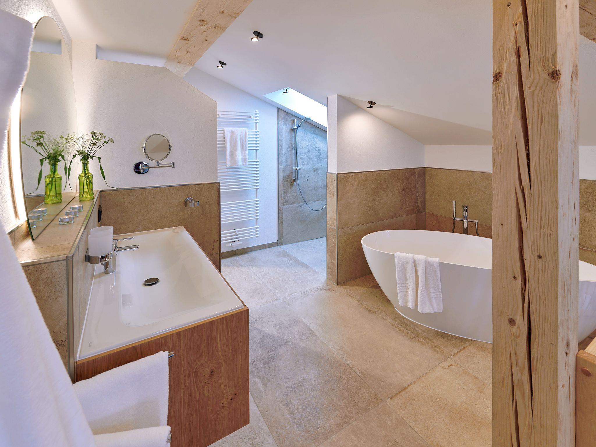 • 1 Eltern-Badezimmer mit begehbarer bodengleicher Dusche, frei stehender Badewanne, WC, Föhn, beheizbarem Handtuchtrockner und Schminkspiegel