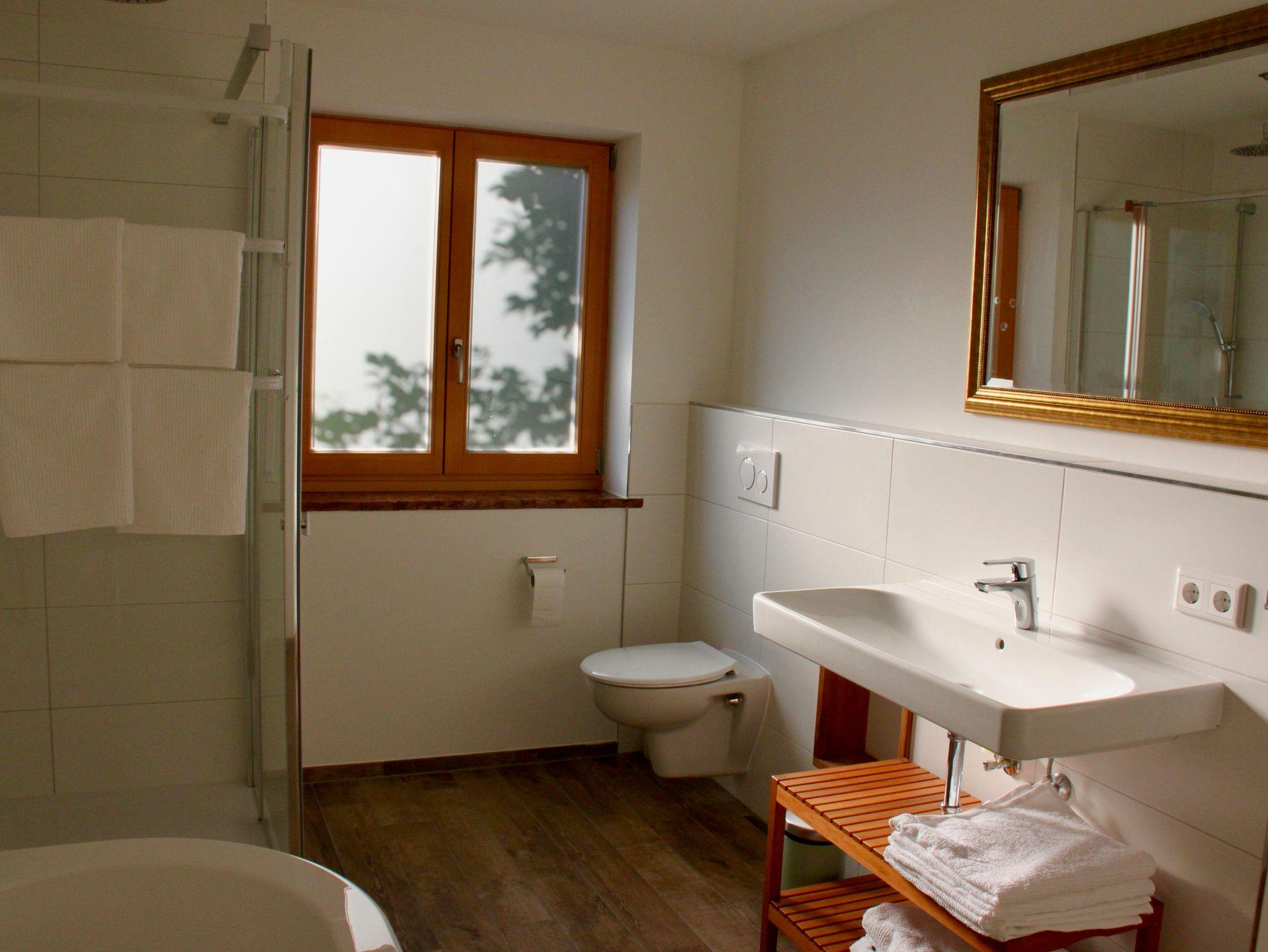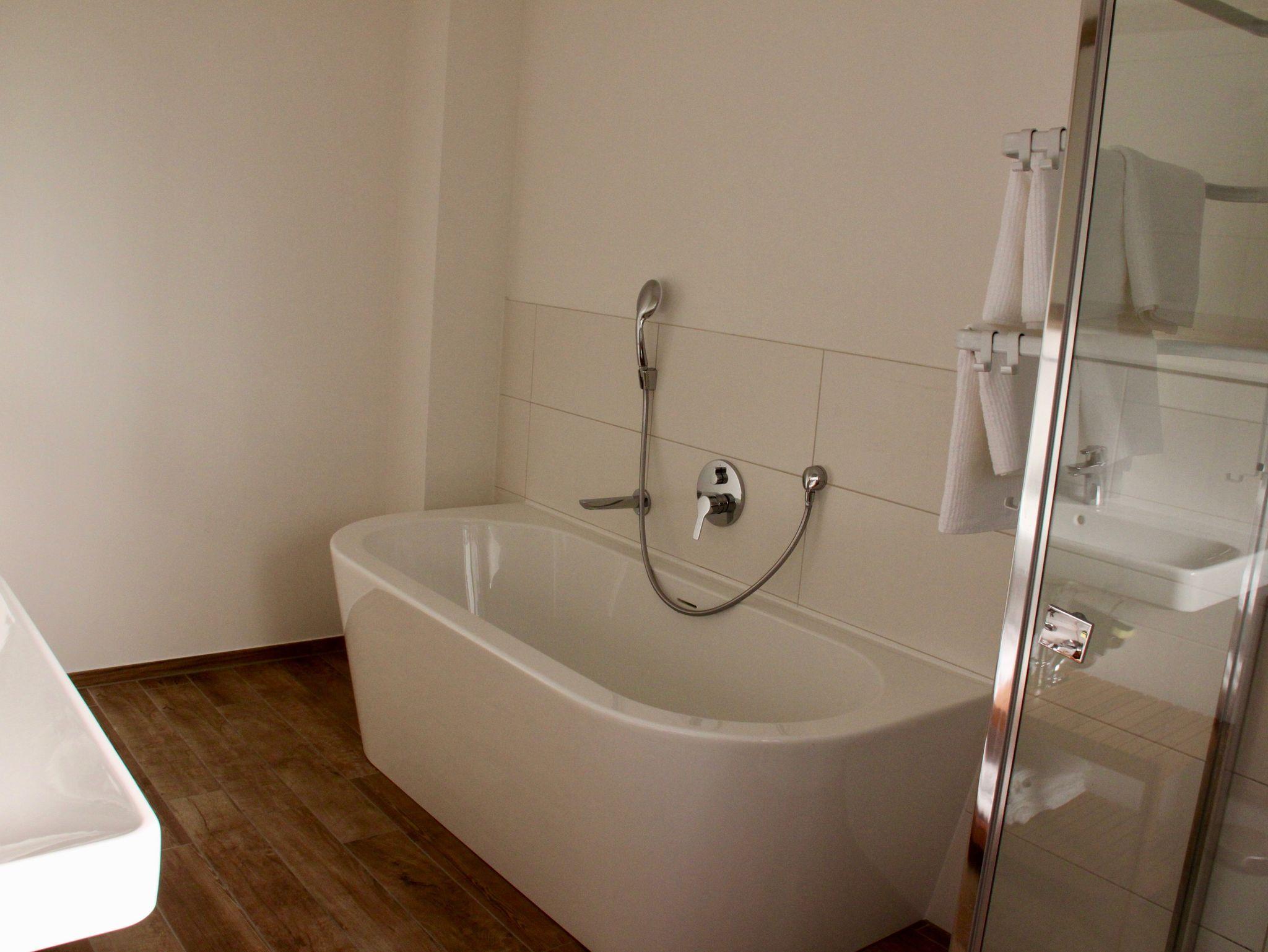 Die etwas größere Ferienwohnung hat zwei Schlafzimmern (neues Boxspringbett, zwei Einzelbetten) plus Schlaf-Wohnzimmer mit neuer komfortabler Boxspring-Schlafcouch (2 Personen), eine große Küche mit luxuriöser Ausstattung und wohnlichem Essbereich. Die sonnige Terrasse (30qm) lädt mit gemütlichen Terrassenmöbeln zum Lesen, Entspannen und draußen Essen ein. Das Bad ist mit Badewanne, Dusche und WC ausgestattet. Ein separates WC ist zusätzlich vorhanden.