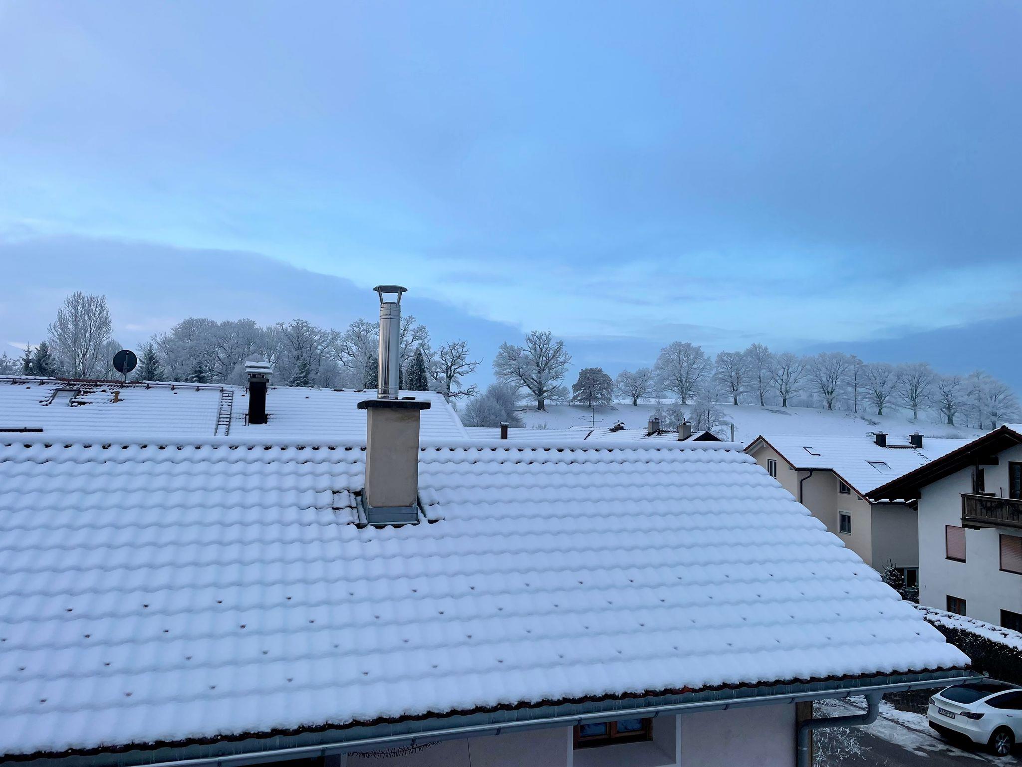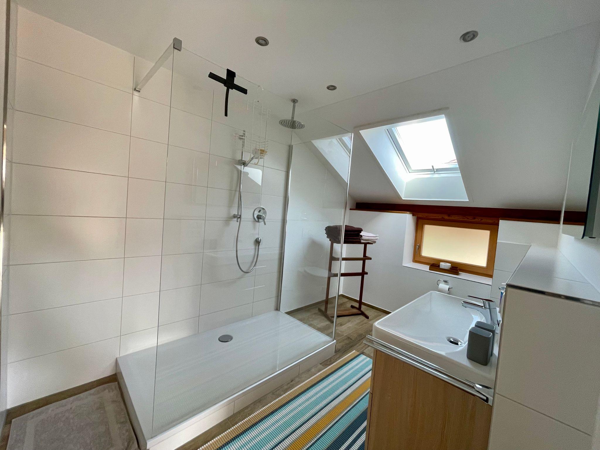 Eine nahezu identische Wohnung befindet sich im 1. OG, erreichbar über die Aussentreppe. Sie verfügt über eine außergewöhnlich große, offene, gemütliche Wohn-Küche mit Kamin und Weitblick, welche für alle 12 Gäste genügend Platz bietet. Im 1. OG befinden sich drei Schlafzimmer und Bad mit Dusche und WC. Die Küche ist vollständig ausgestattet: Block mit Induktionsherd, Backofen,