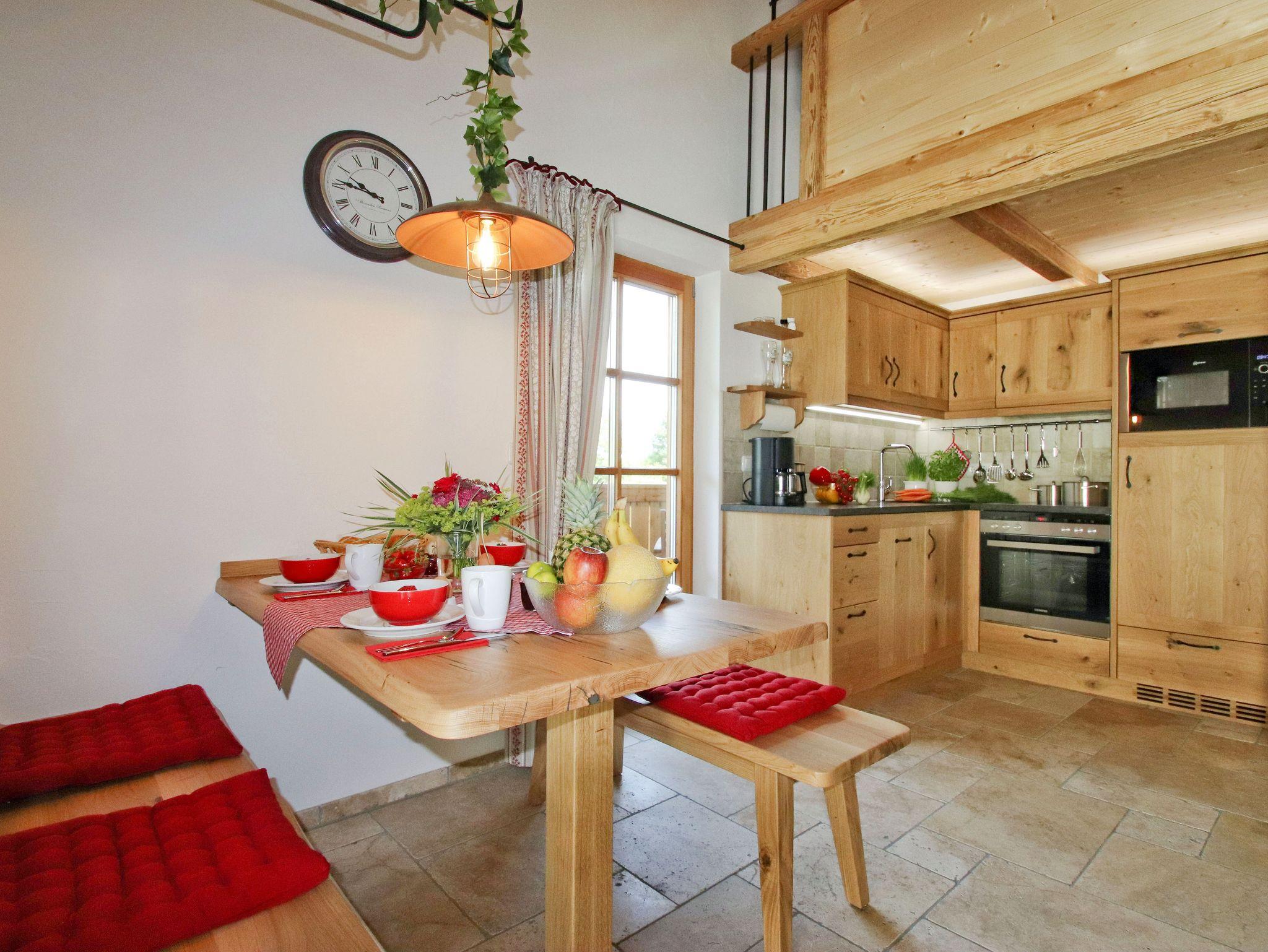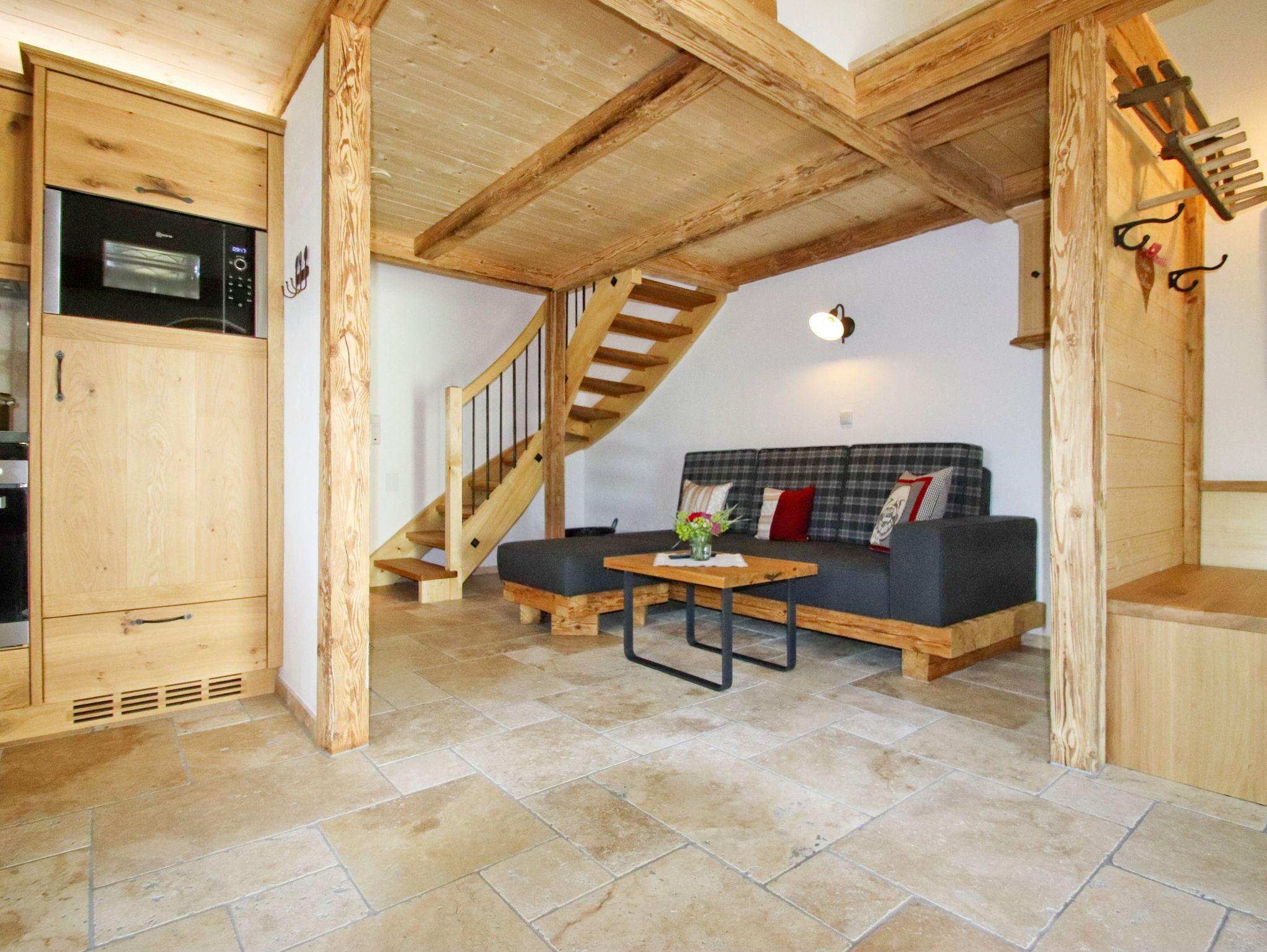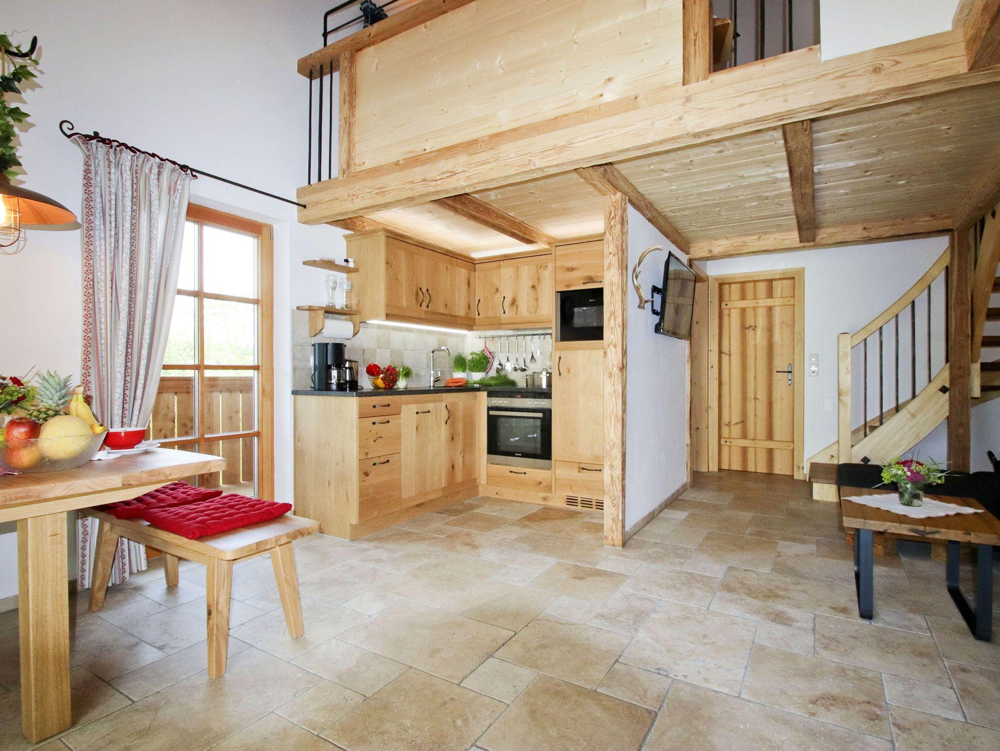 Unser Chalet wurde mit Naturmaterialien aus der Region erbaut. Die Naturfußböden und die vom Schreiner angefertigten Möbel, wurden aus Eschen- und Eichenholz aus dem eigenen Wald hergestellt. Der Fokus lag daran so viel Nachhaltigkeit und Tradition in die Gestaltung der Wohnung zu bringen. Die handgehobelte Holzdecke trägt zu einer Wohlfühl-Atmosphäre bei. Dezente Lichtelemente betonen das offene Wohnkonzept.