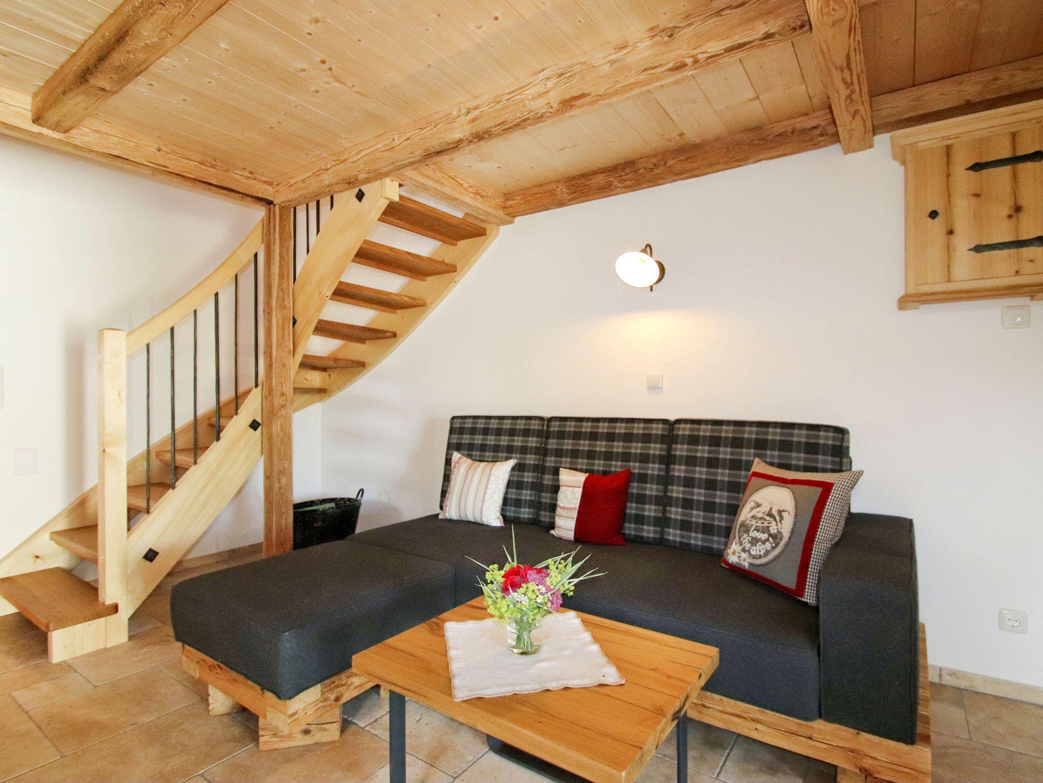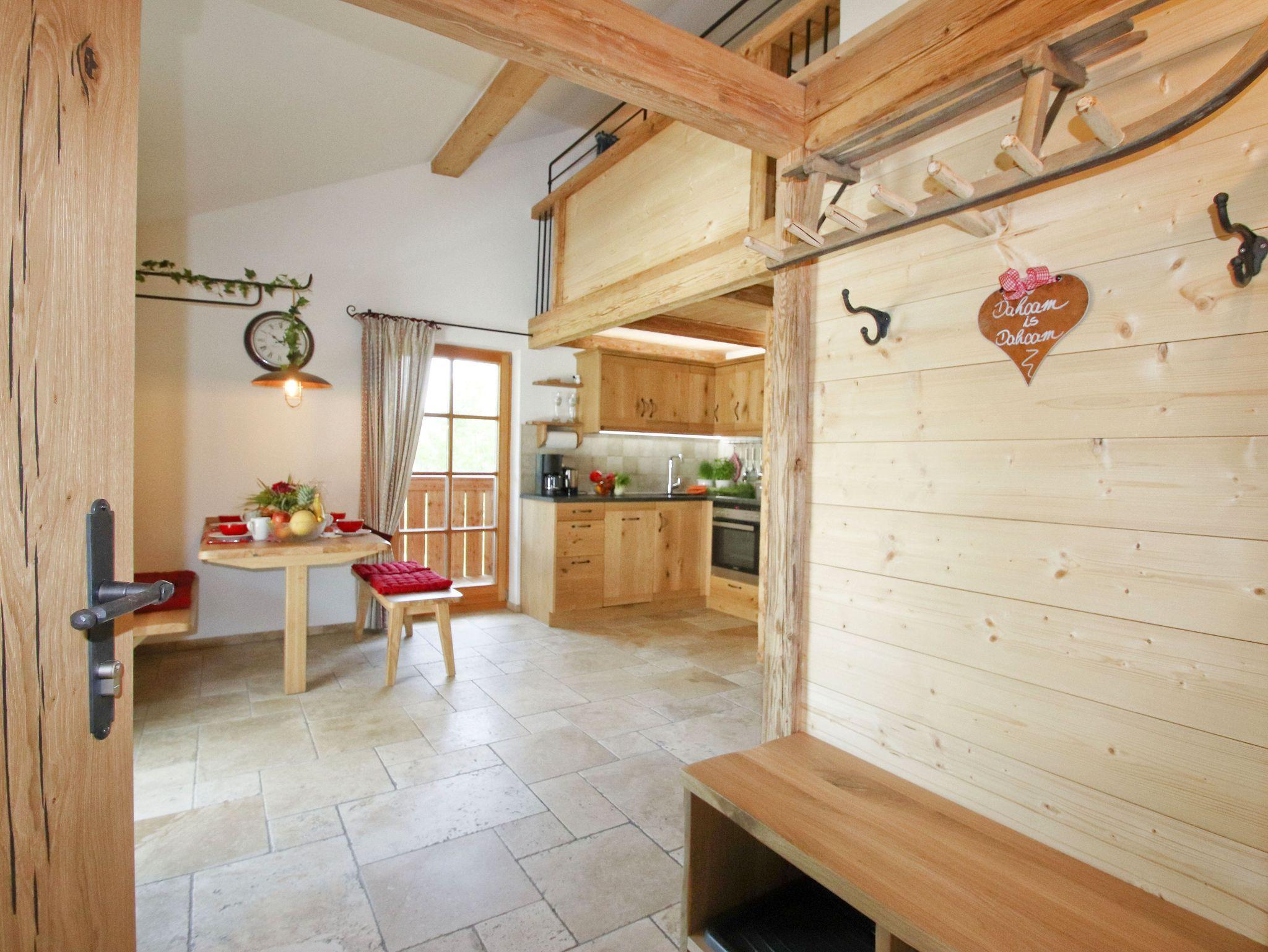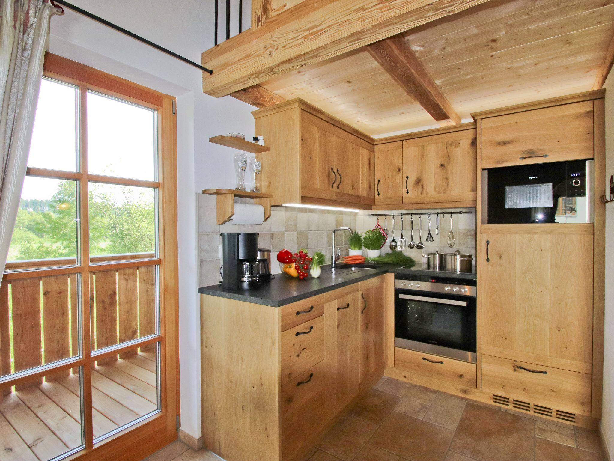 Unser Chalet wurde mit Naturmaterialien aus der Region erbaut. Die Naturfußböden und die vom Schreiner angefertigten Möbel, wurden aus Eschen- und Eichenholz aus dem eigenen Wald hergestellt. Der Fokus lag daran so viel Nachhaltigkeit und Tradition in die Gestaltung der Wohnung zu bringen. Die handgehobelte Holzdecke trägt zu einer Wohlfühl-Atmosphäre bei. Dezente Lichtelemente betonen das offene Wohnkonzept.