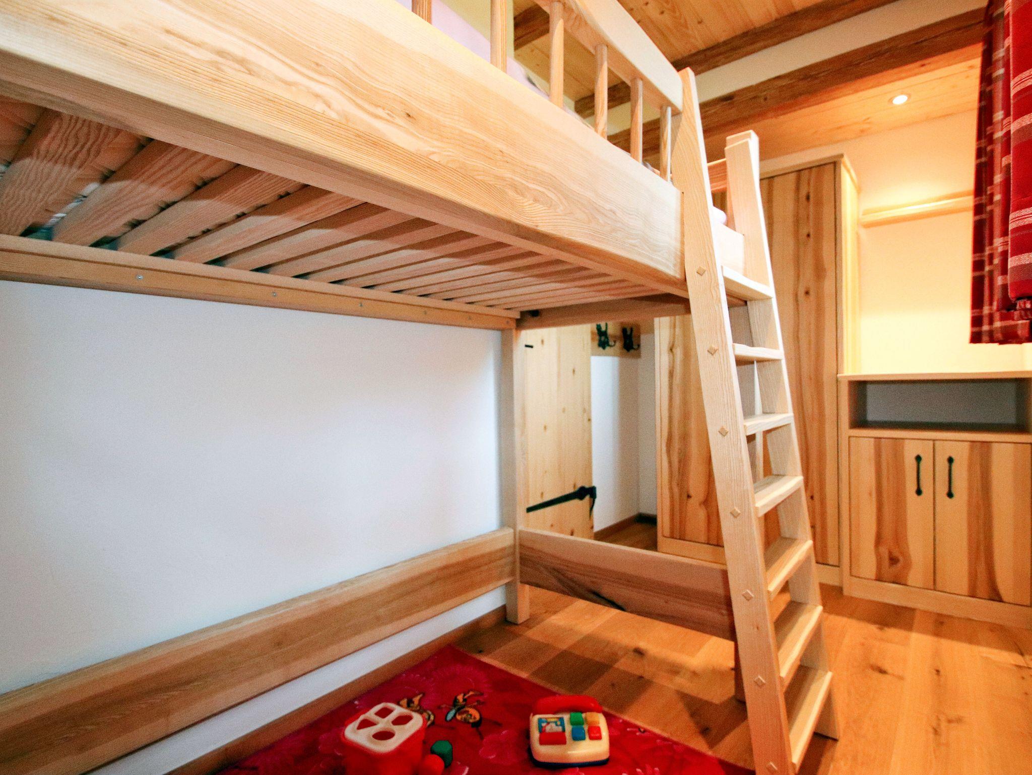 Im Untergeschoß des Chalets befindet sich neben dem Wohn- und Essbereich mit großem Sofa ein Kinderzimmer mit Stockbett (80x190) für eine Person, ein Badezimmer mit ebenerdiger Dusche sowie einem WC. Im Obergeschoß finden Sie das bequeme Hauptschlafzimmer mit Ehebett ohne Fußteil (180x200). Die Wohnung ist mit Fußbodenheizung ausgestattet.