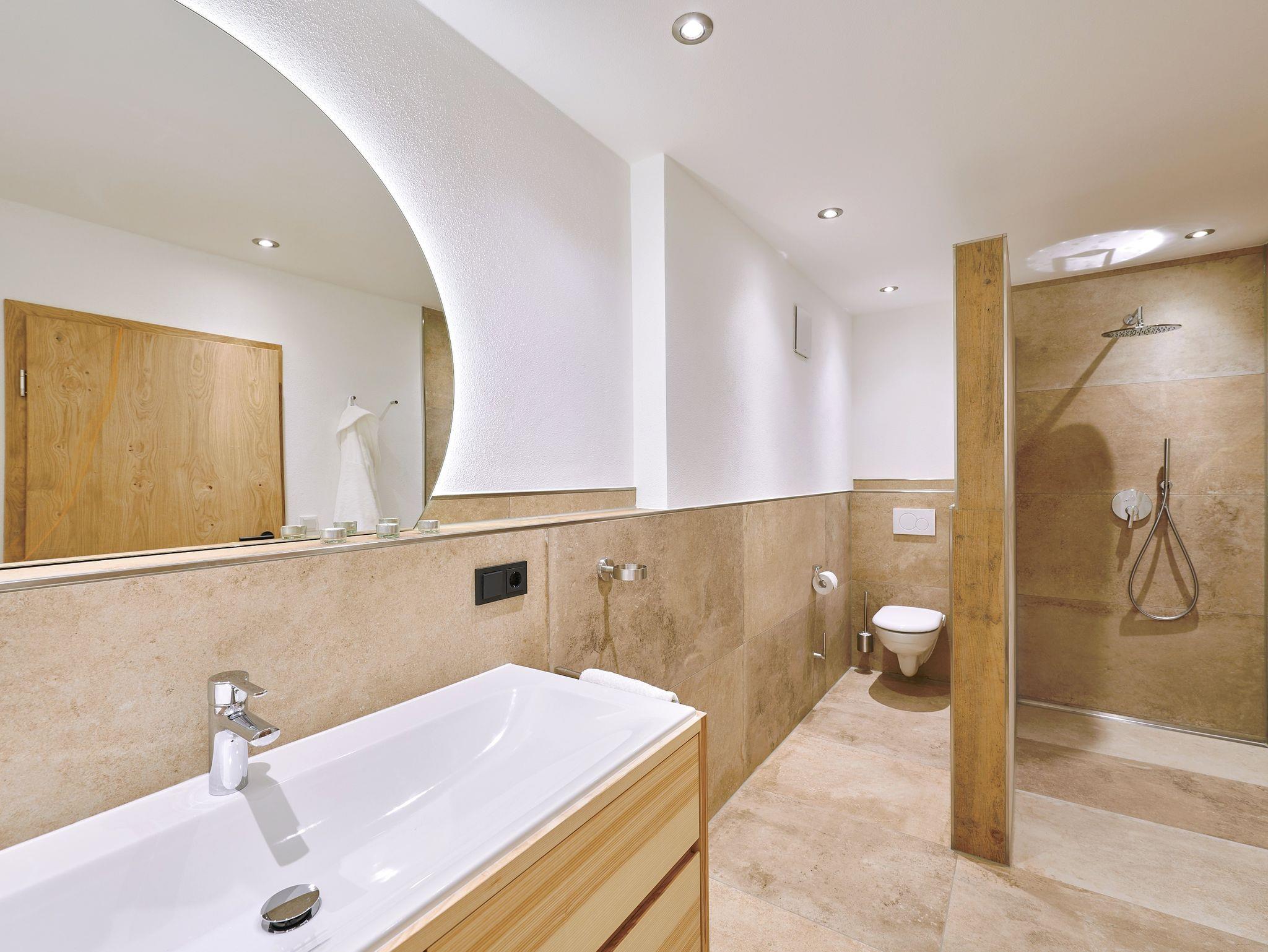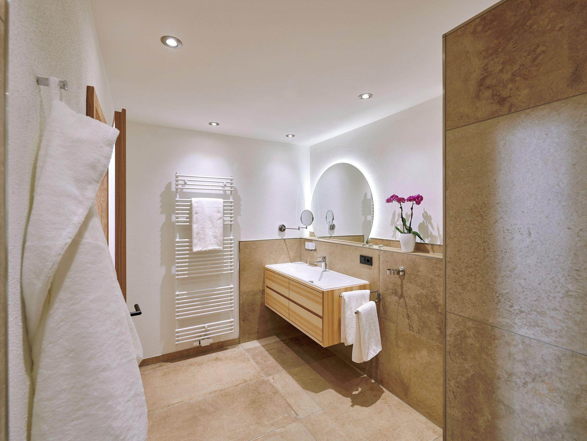 • 1 Badezimmer mit begehbarer bodengleicher Regendusche, WC, Föhn, beheizbarem Handtuchtrockner und Schminkspiegel