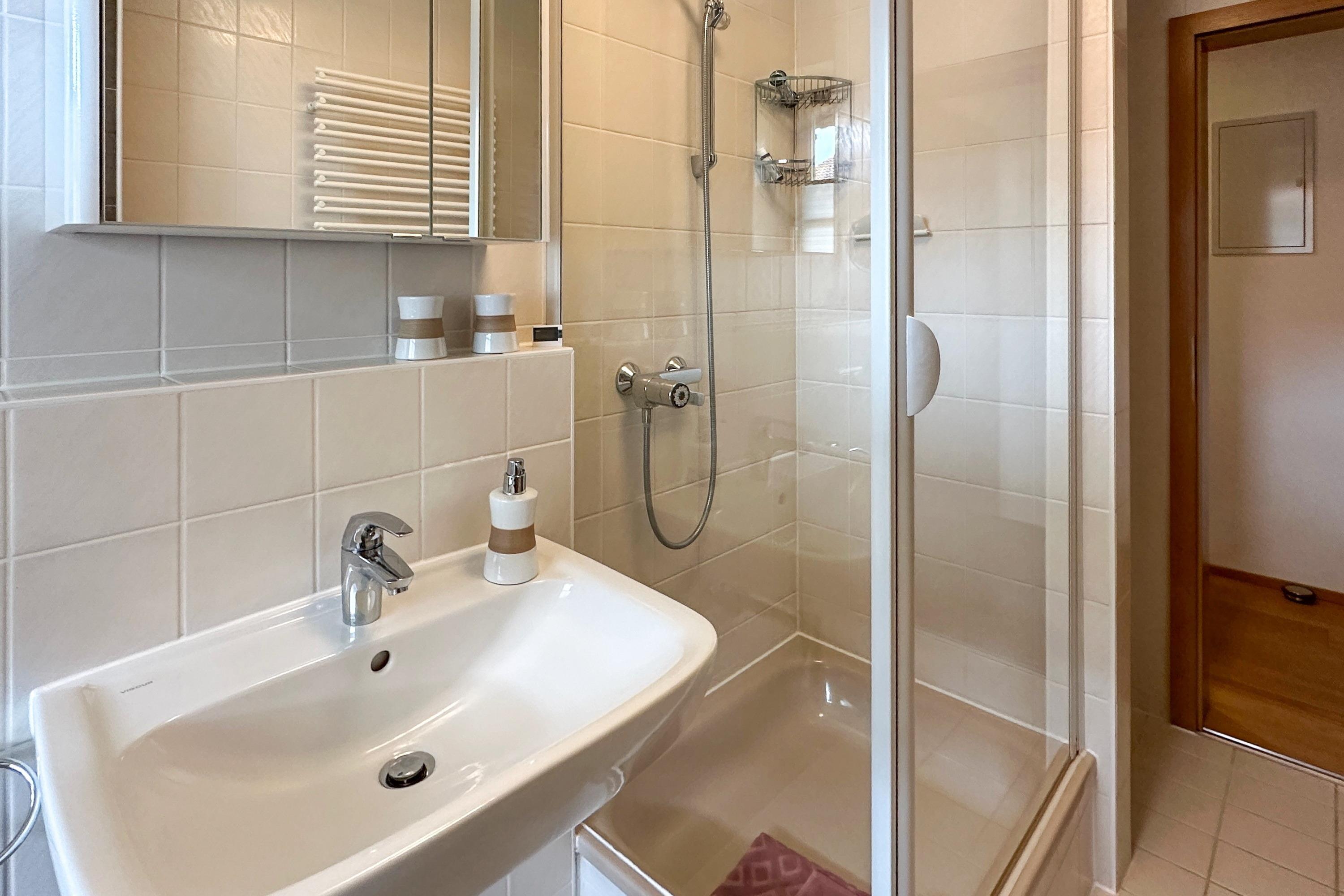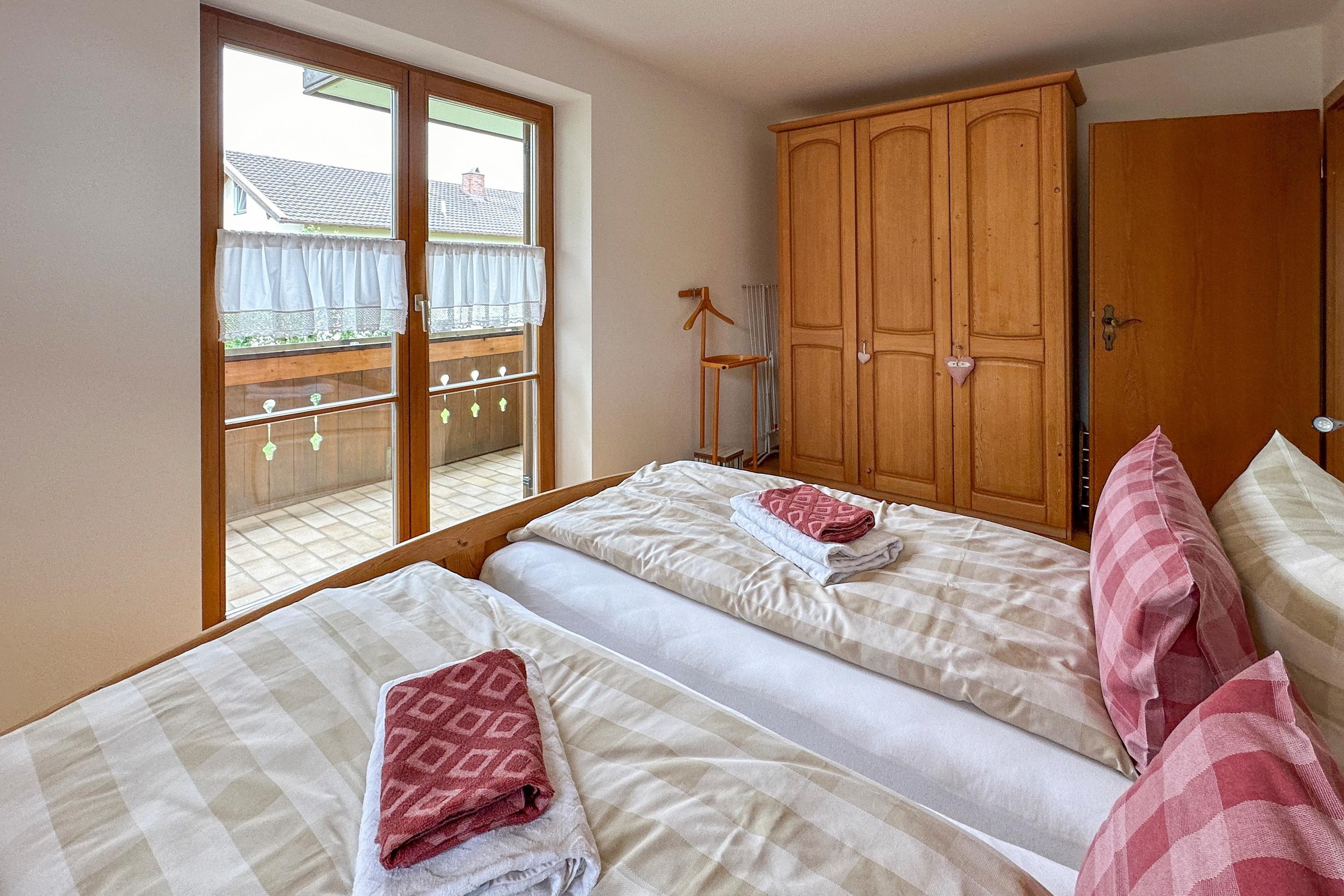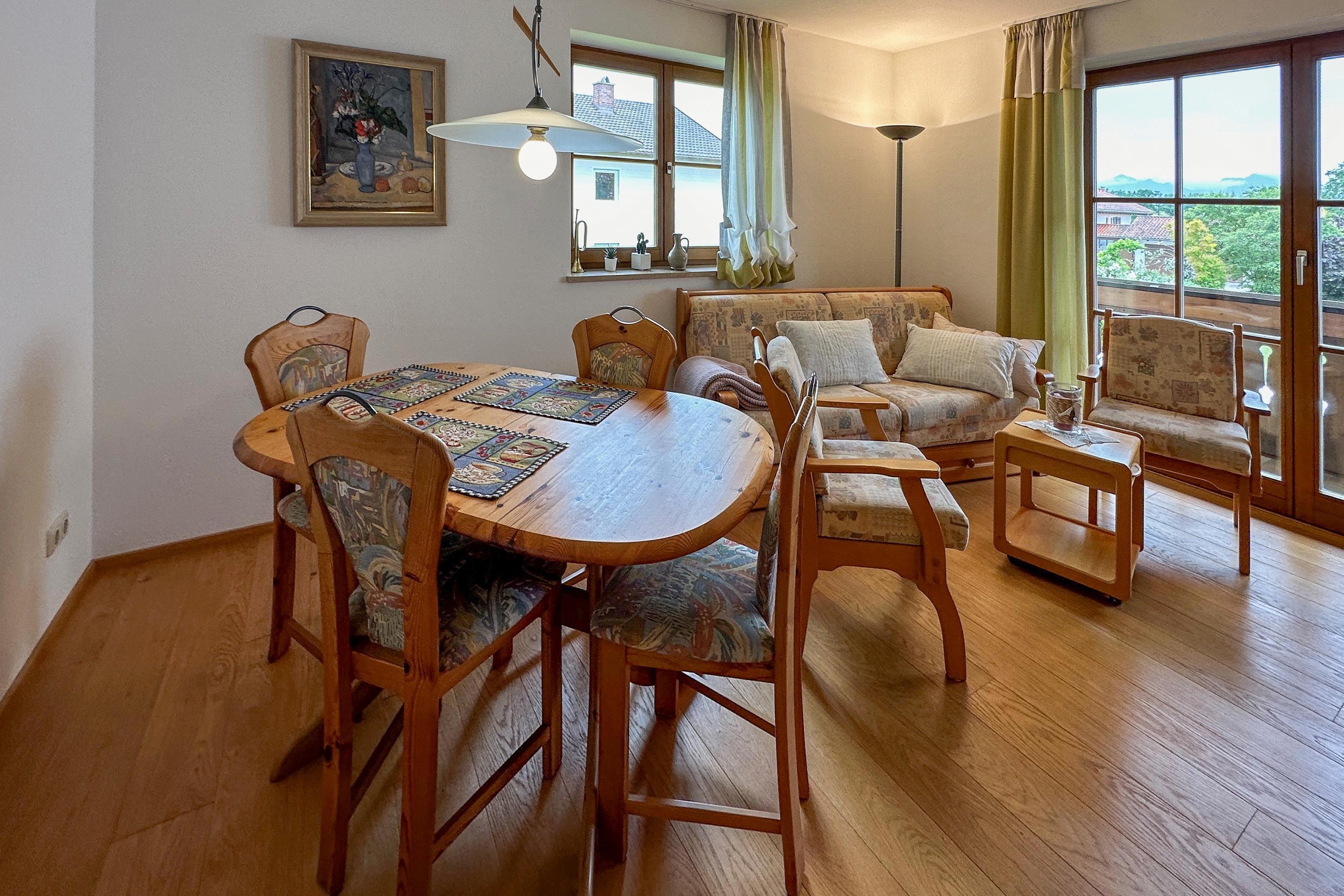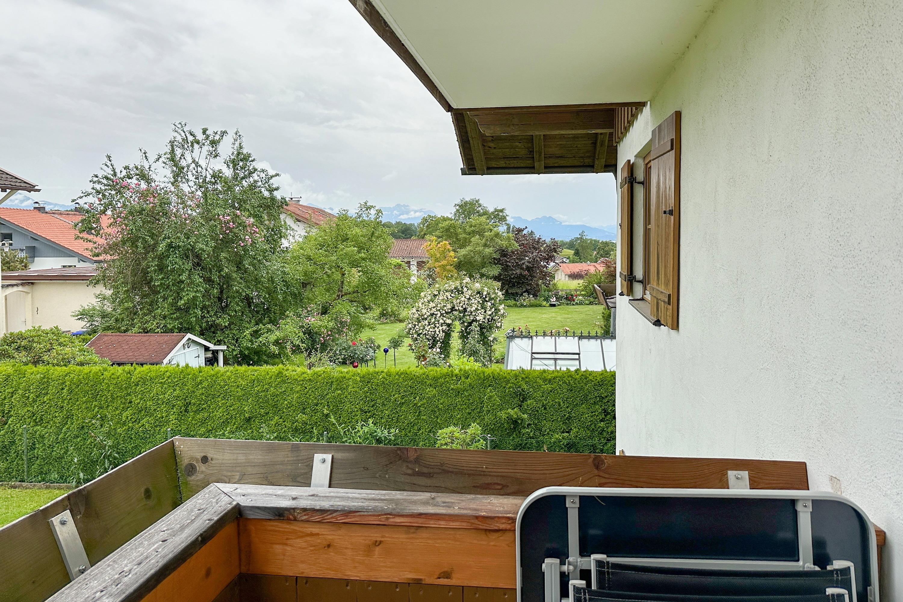 Besonders schön sind die zwei möblierten Balkone, die Ausblicke ins Grüne und auf die Berge bieten. WLAN und Spülmaschine sorgen für Komfort, während die Nähe zum Chiemsee ideale Voraussetzungen für entspannte und aktive Urlaubstage schafft.