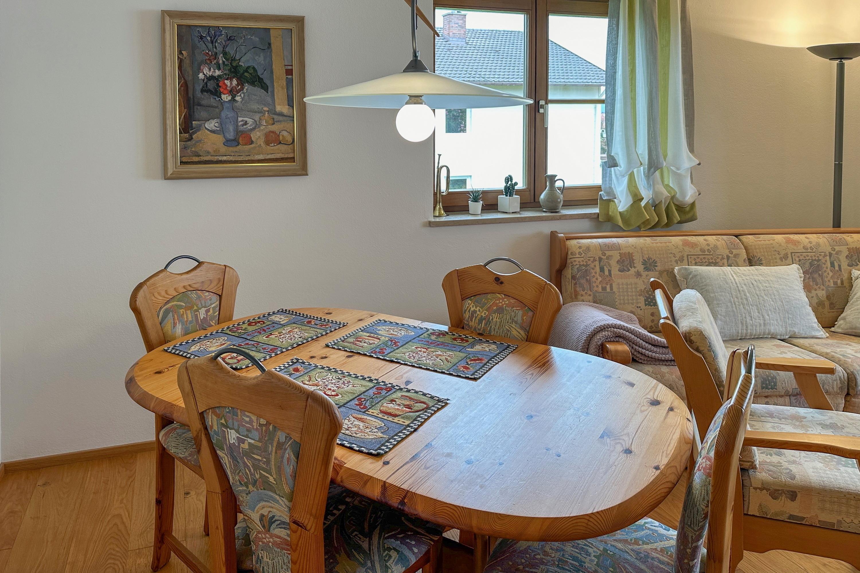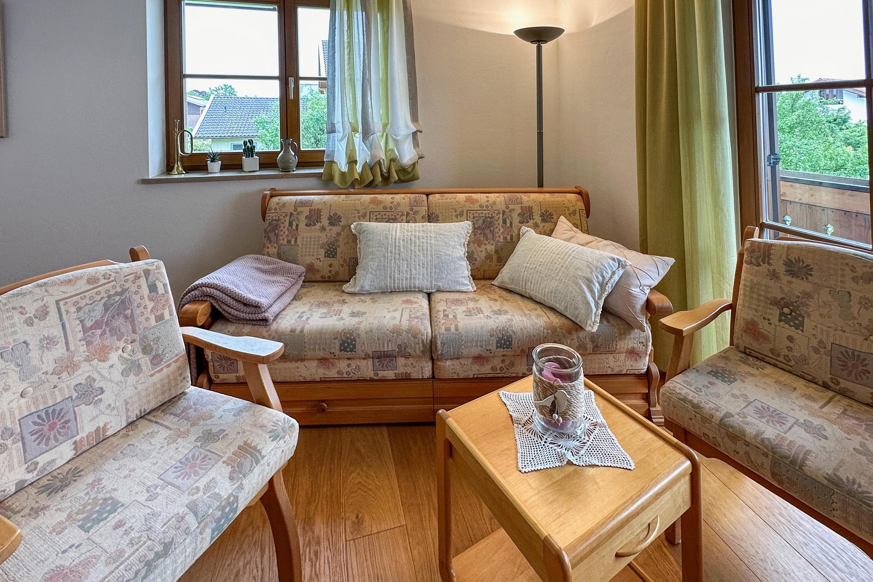 Helle Räume, viel Tageslicht und eine ruhige Lage am Ortsrand von Chieming machen die Ferienwohnung „Cäcilia“ zu einem angenehmen Rückzugsort für bis zu 4 Personen. Auf 60 m² erwarten Sie ein separates Schlafzimmer, ein großzügiger Wohn- und Essbereich mit Schlafsofa sowie eine gut ausgestattete Küche.
