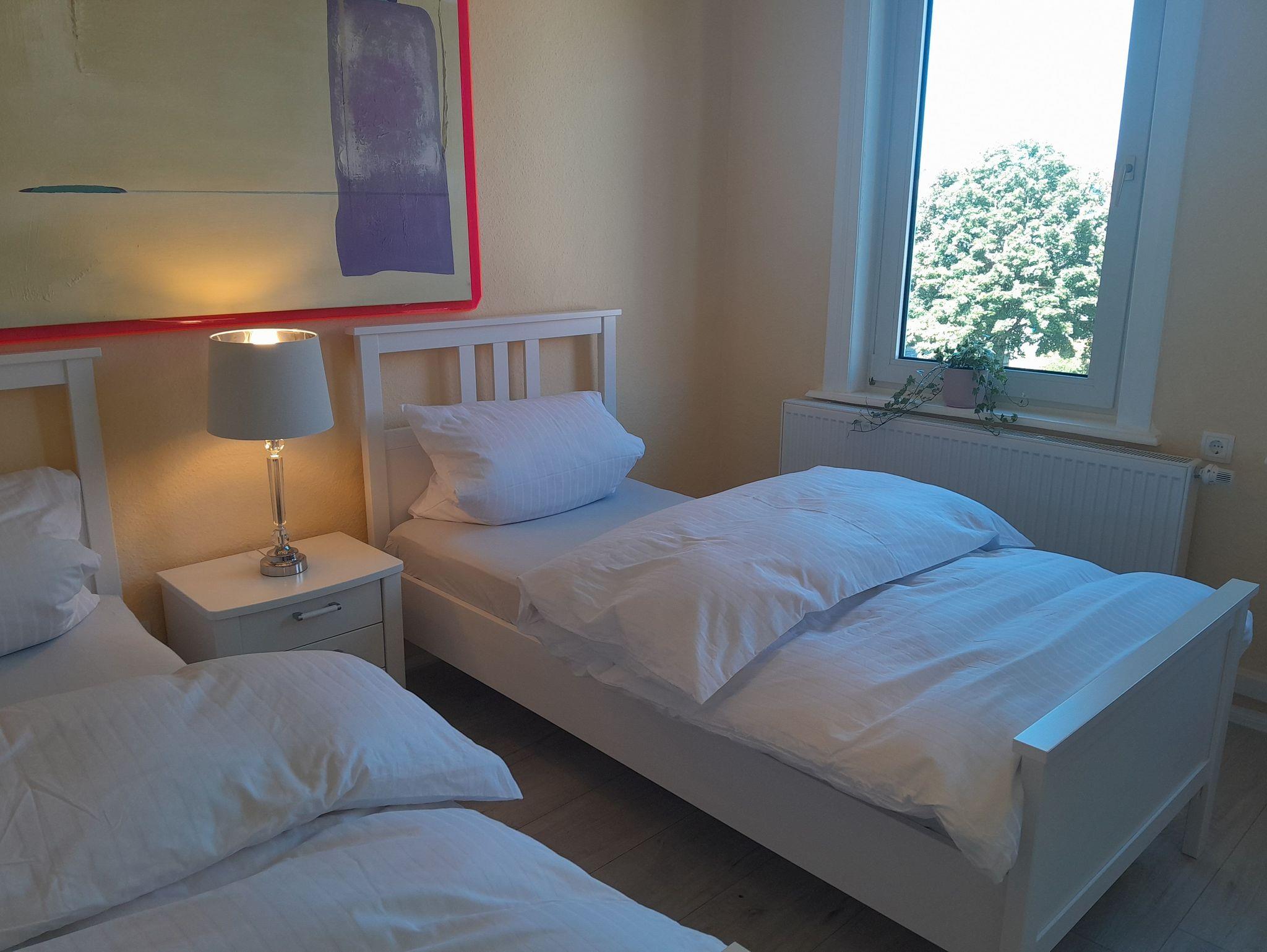 Das Hauptschlafzimmer, mit einem Doppelbett, hat direkte Anbindung an das Badezimmer. Das zweite Schlafzimmer hat zwei Einzelbetten. Der Weg von diesem Zimmer zum Badezimmer führt durch das Hauptschlafzimmer. Bedingt durch diese Besonderheit, sind die Ferienwohnungen für Familien oder Personen geeignet, die sich gut kennen. Eines der Schlafzimmer hat eine gemütliche Sitzecke mit TV-Gerät.