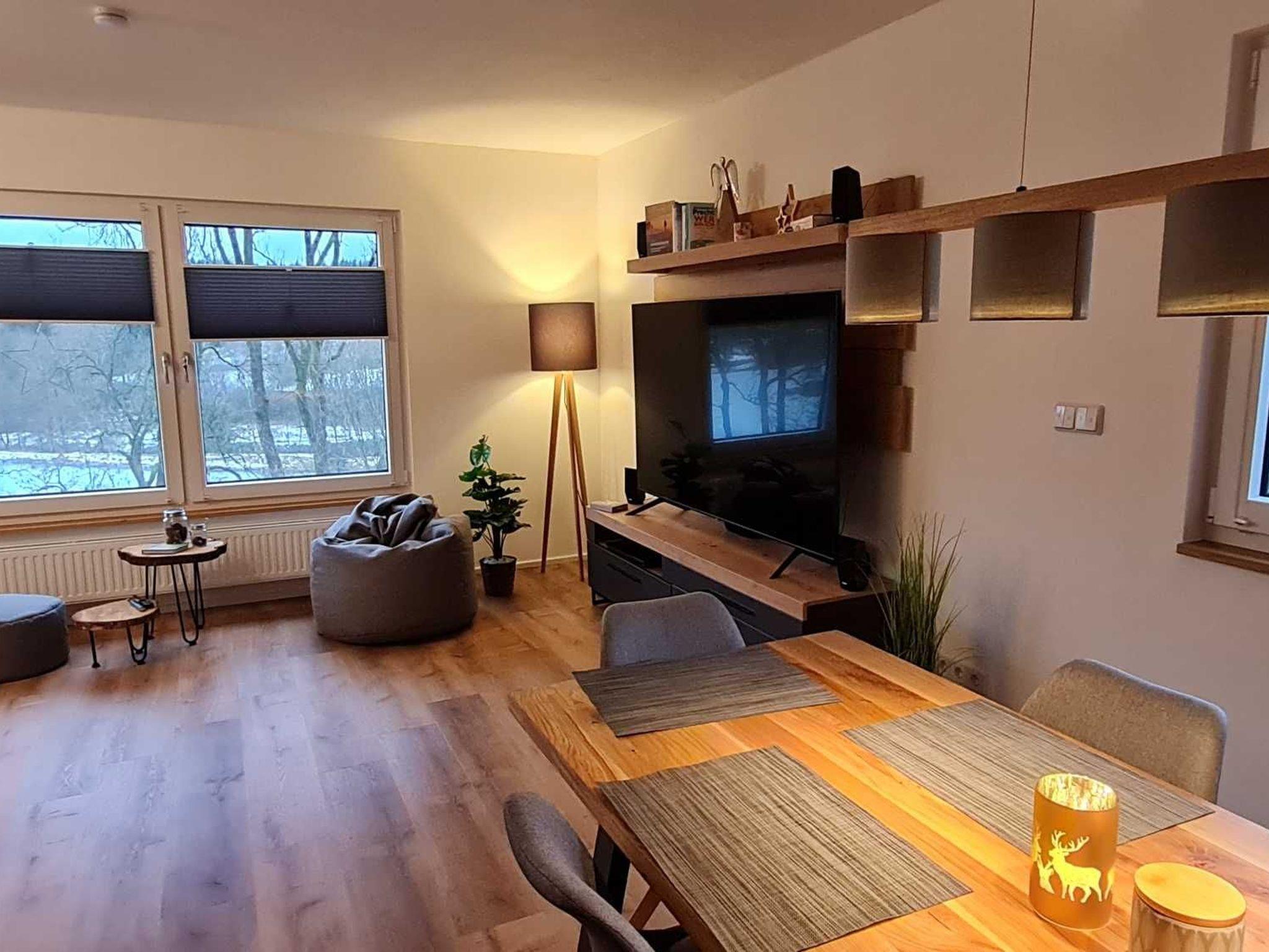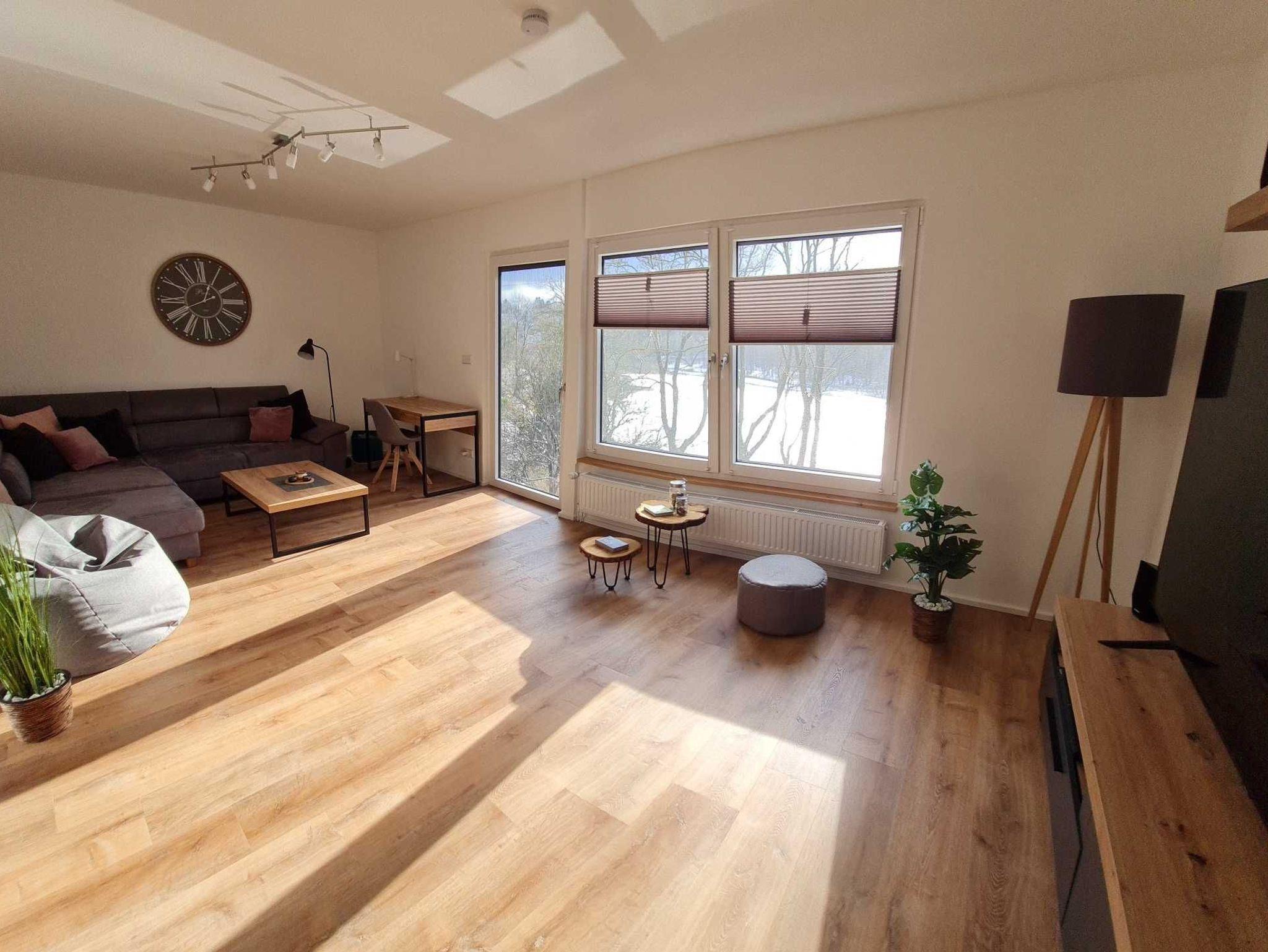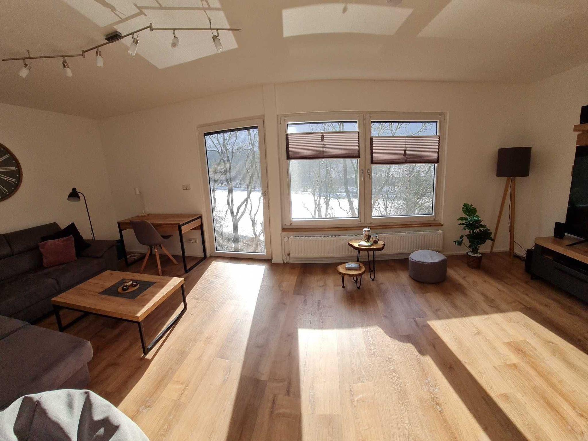 Der große Wohnbereich lädt mit dem großen Schlafsofa (1,2 x 2,0 m), Flat-TV mit SAT-Anschluss, Schreibtisch mit LAN ? Anschluss sowie Lampe (integrierter drahtloser Ladestation sowie USB - Anschluss), Sitzsack und tollem Ausblick auf den Eulenspiegler Teich zum Wohlfühlen ein. Mit dem neuen Balkon (10 qm) können Sie jetzt die unverbaute Aussicht genießen.