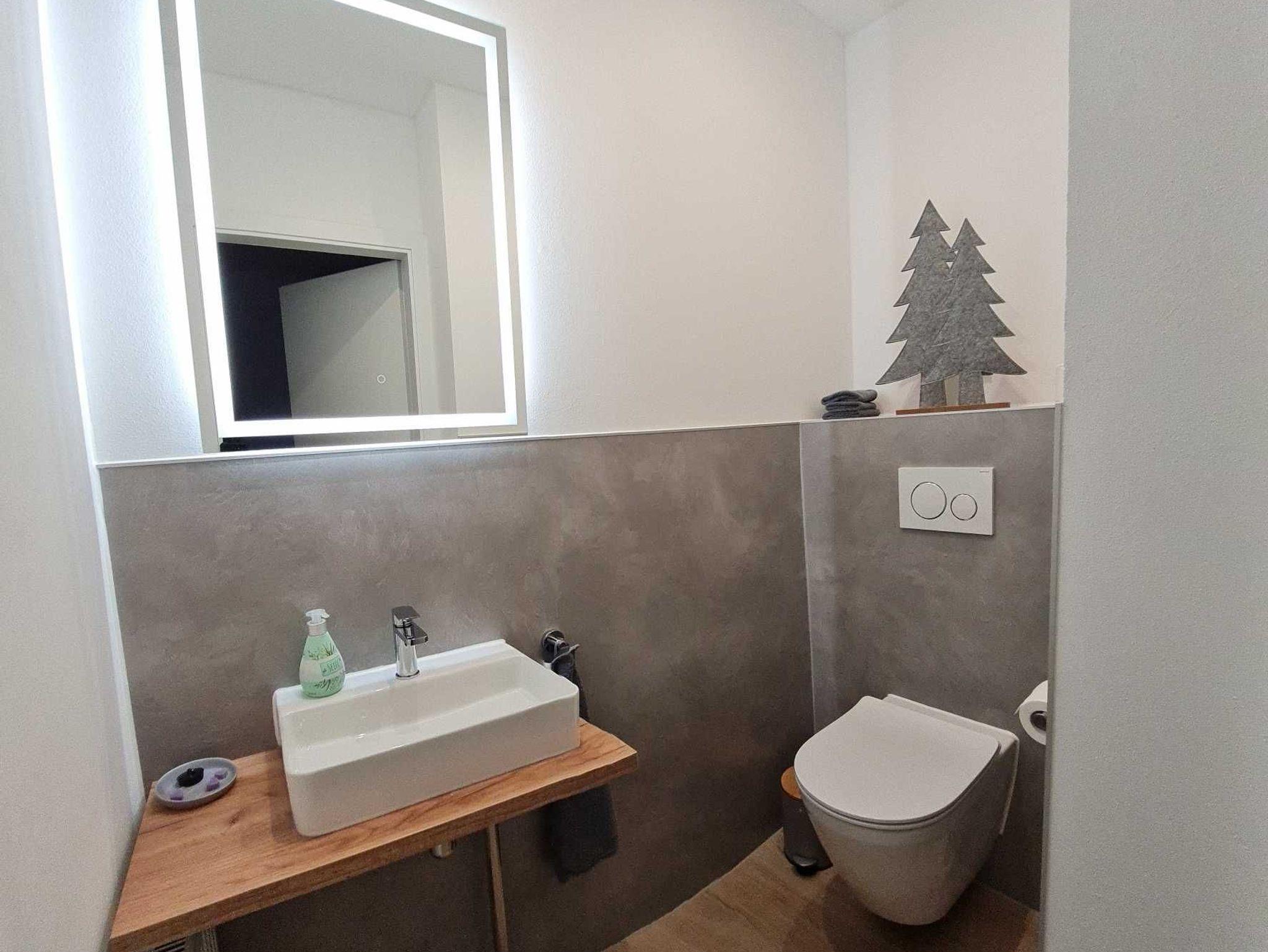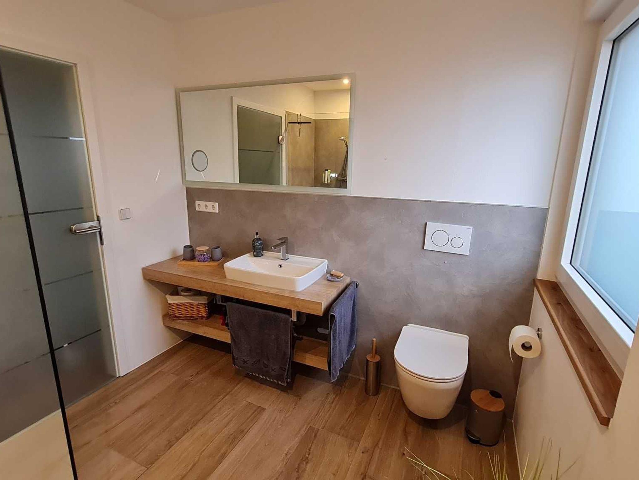 Im großen, modernen Badezimmer findet sich eine begehbare Dusche, Hänge-WC, Waschbecken und Handtuchheizung. Des Weiteren ist im Haus ein modernes Gäste-WC vorhanden.