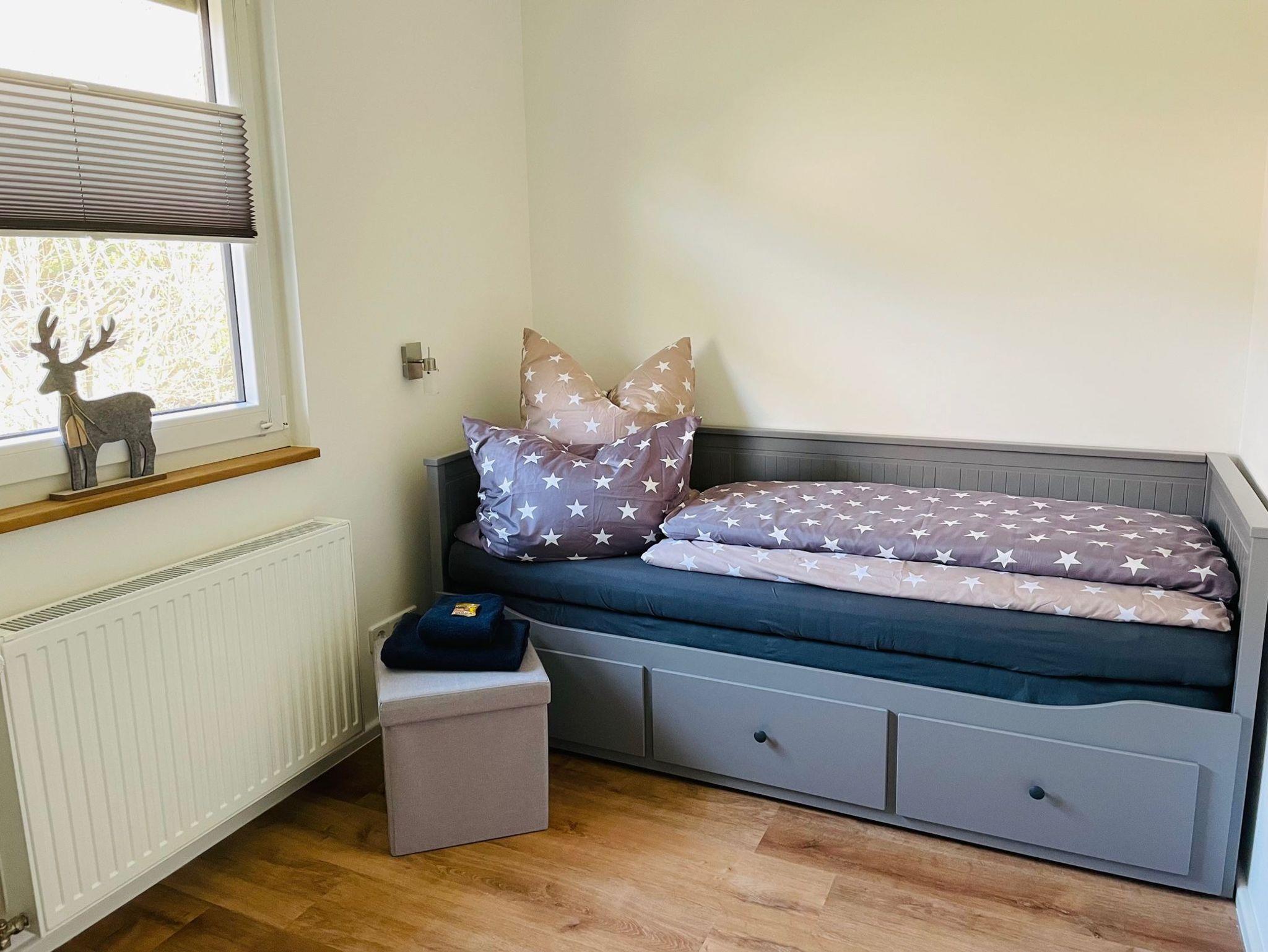 Das zweite Schlafzimmer hat ein Einzelbett, welches auf 1,6 x 2 Meter ausgezogen werden kann. In dem Zimmer steht noch eine Kommode mit integriertem Schreibtisch.