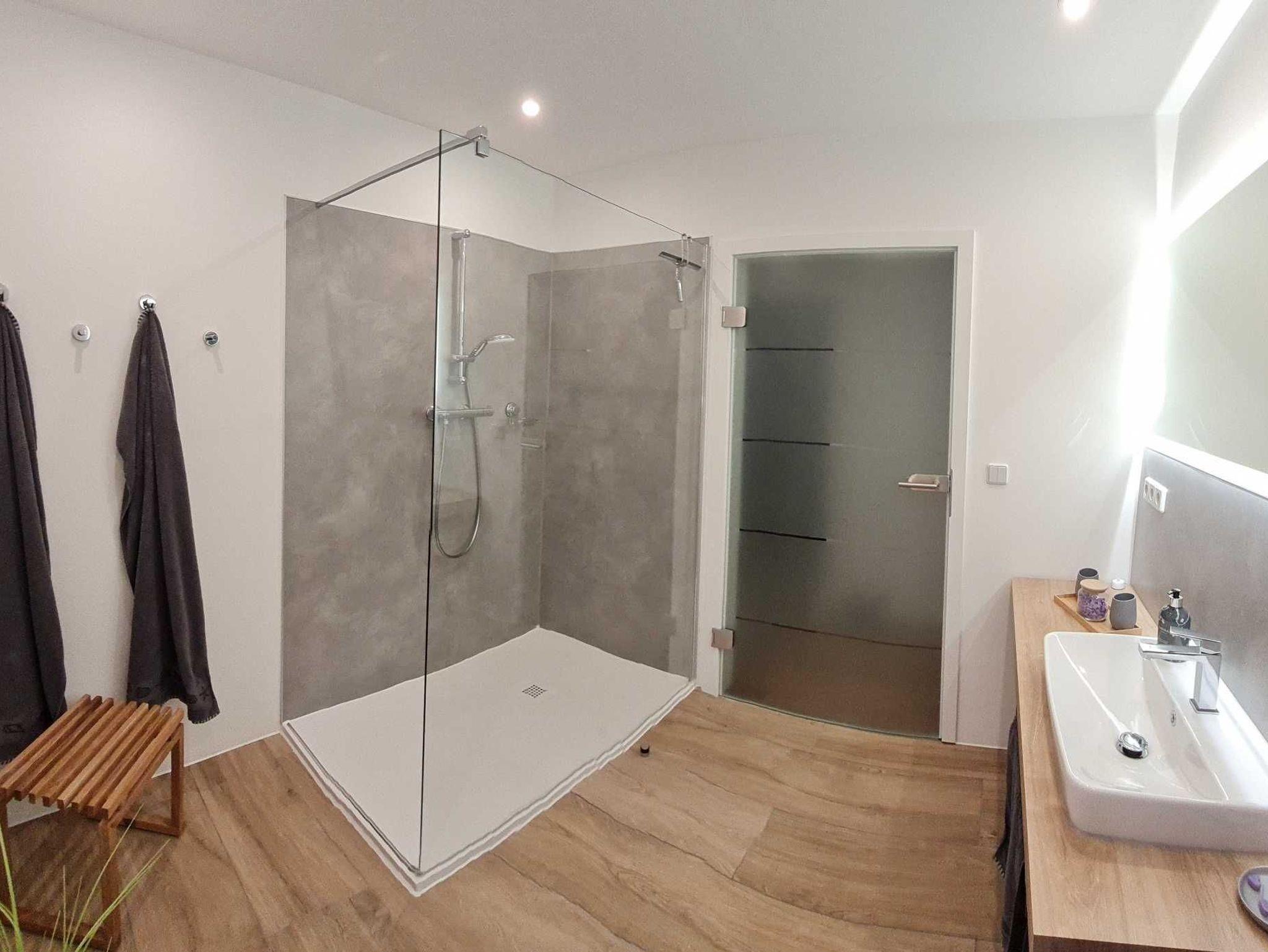 Im großen, modernen Badezimmer findet sich eine begehbare Dusche, Hänge-WC, Waschbecken und Handtuchwärmer. Des Weiteren ist im Haus ein modernes Gäste-WC vorhanden.