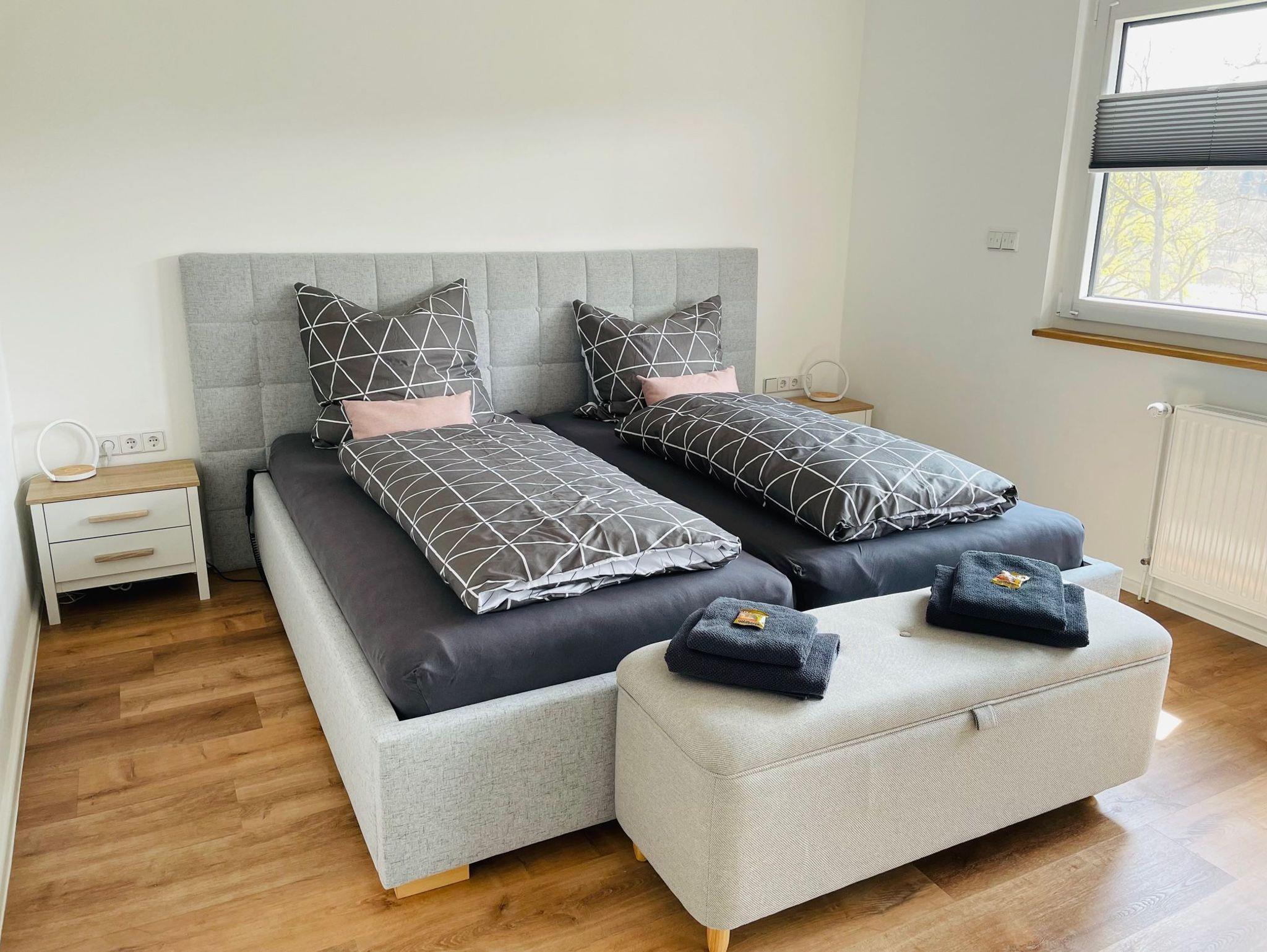 In dem ersten Schlafzimmer steht Ihnen ein großes Doppelbett 2 x 2 Meter, ein Kleiderschrank sowie Nachtschränke mit Nachtischlampen (integrierter drahtloser Ladestation) zur Verfügung.