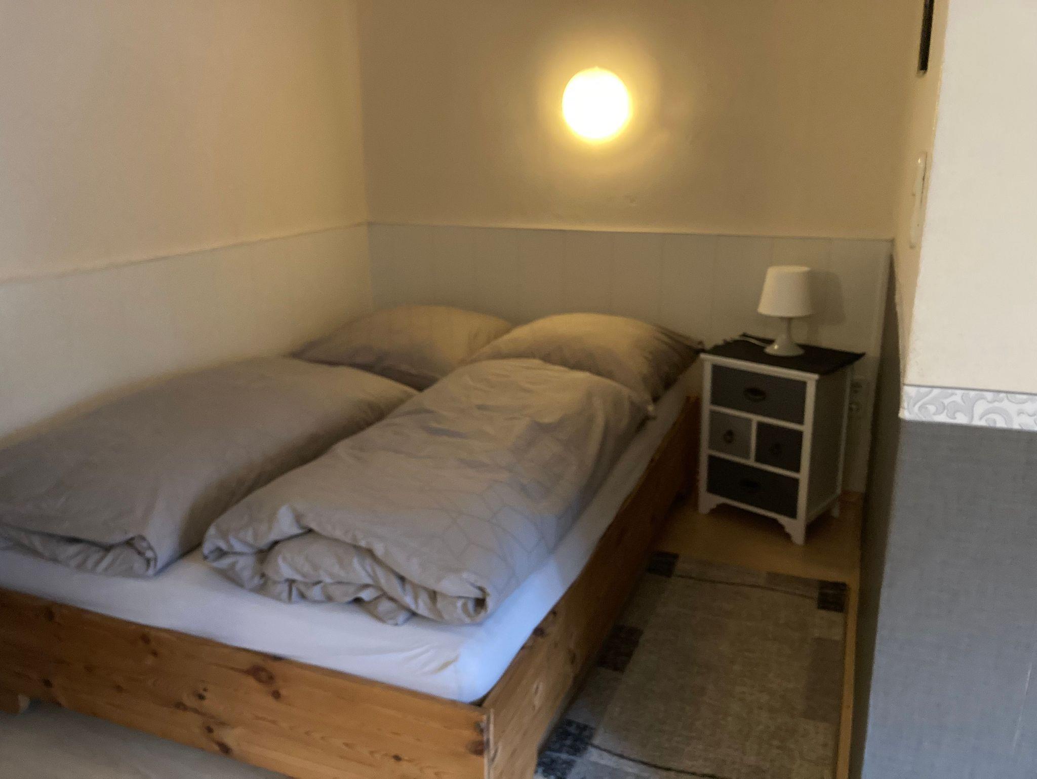Die Souerrain-Ferienwohnung Lenk hat einen offenen Wohnbereich. Das Doppelbett steht in einer Nische. Alle Personen schlafen im selben Zimmer. Die Küche ist voll ausgestattet. Vor der Haustür können die Gäste auf einer Terrasse die Sonne im Sommer genießen.