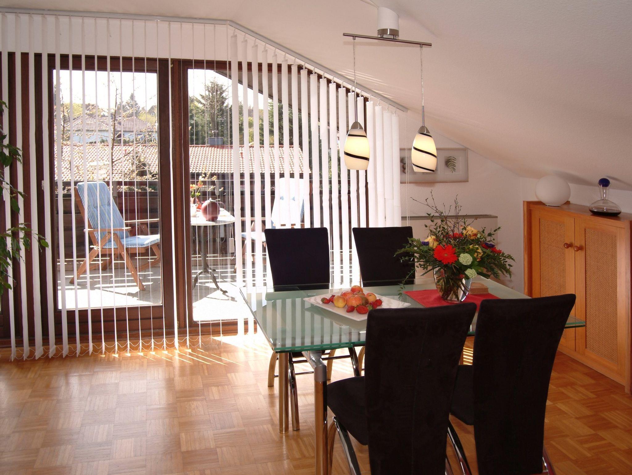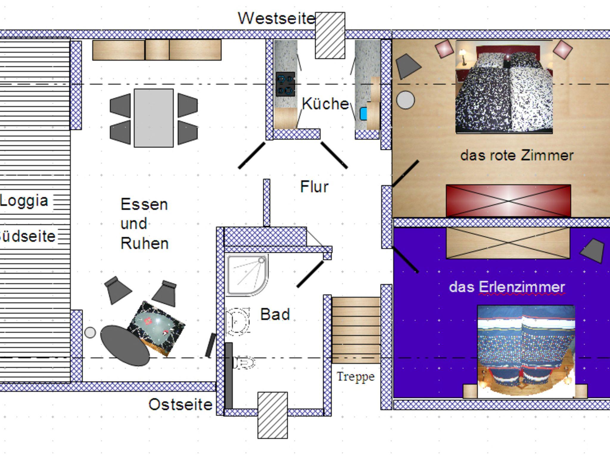 Die 60 m² große Nichtraucher-Ferienwohnung Zum Waldseebad ist mit 2 Doppelzimmern, Küche, Bad, großem Wohn- und Esszimmer sowie einer Loggia auf der Südseite ausgestattet.