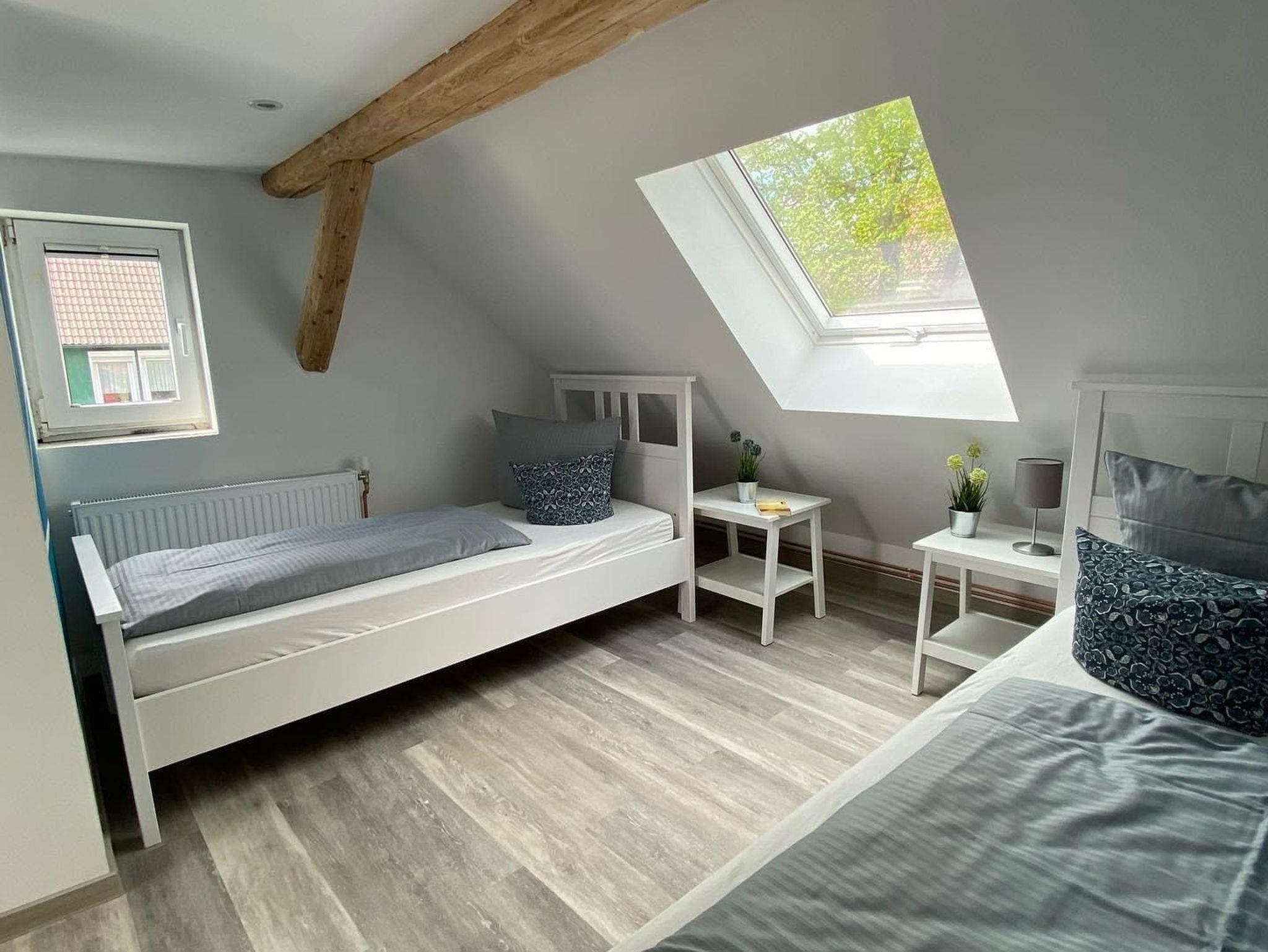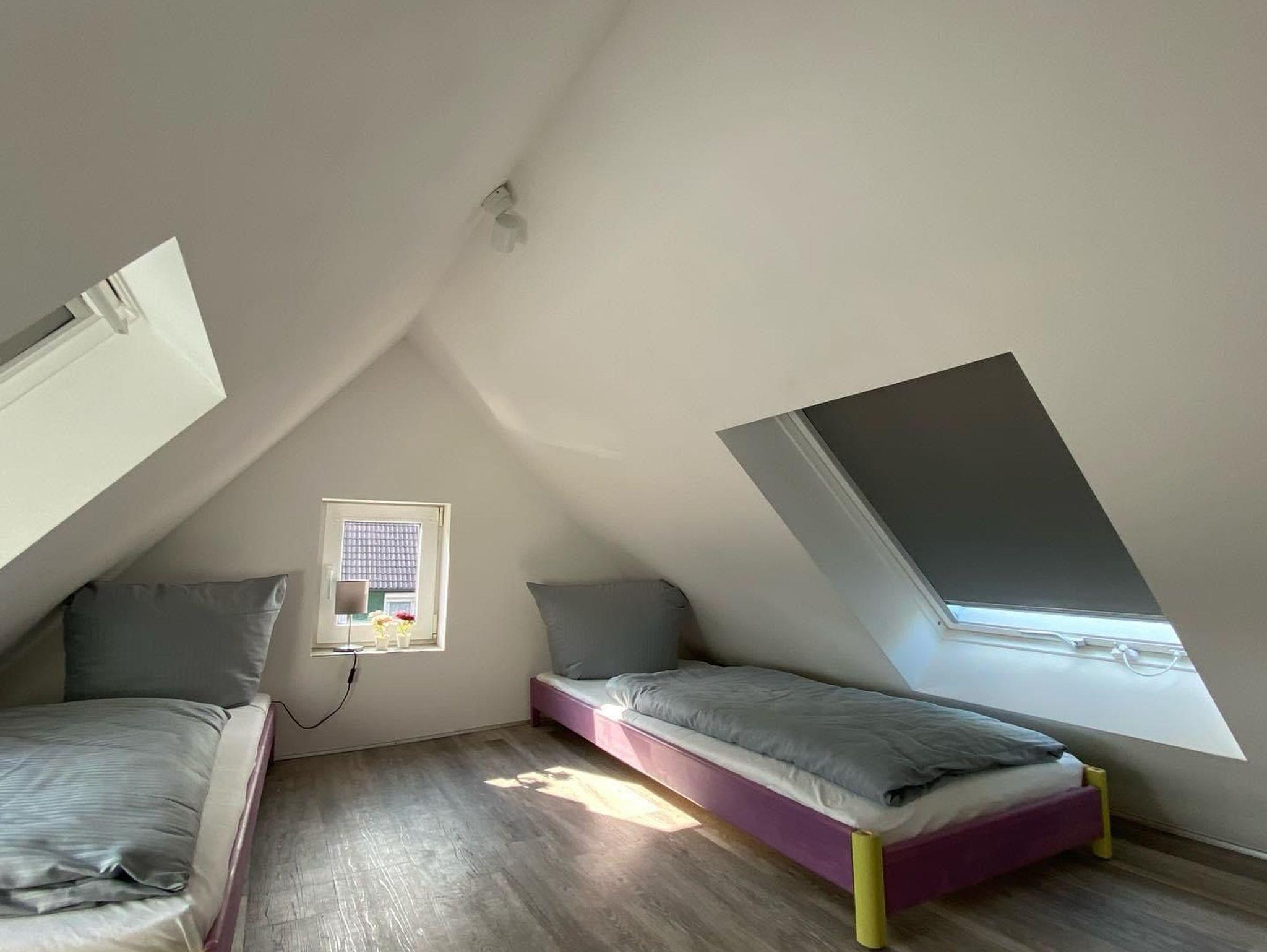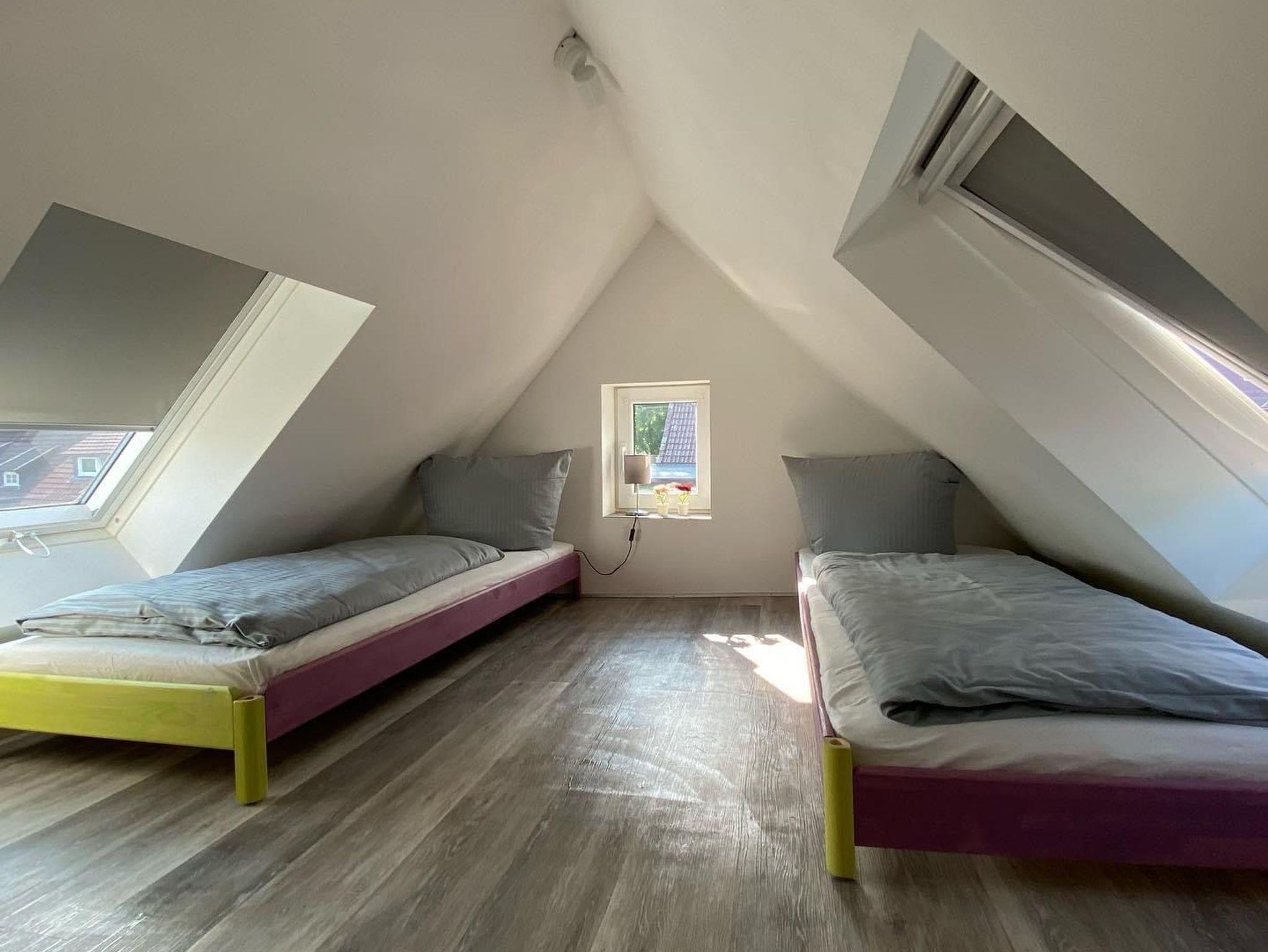 Die 110 qm Wohnung liegt im 1.OG und erstreckt sich über 3 Etagen. In 2 SZ und auf dem Schlafboden finden insgesamt 4 Erwachsene und 2 Kinder Platz. Die Küche ist mit Backofen, Kühlschrank und Geschirrspüler ausgestattet und der große Wohn-Essbereich lädt zum Verweilen ein. Bei schönem Wetter kann man die Abendsonne auf dem Balkon genießen.