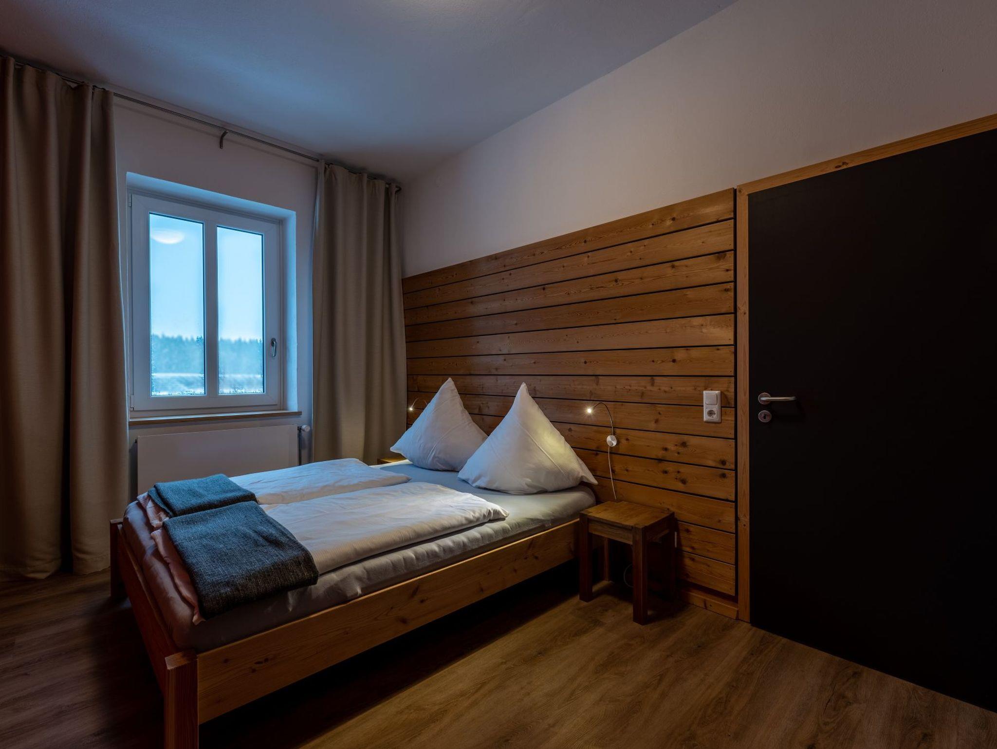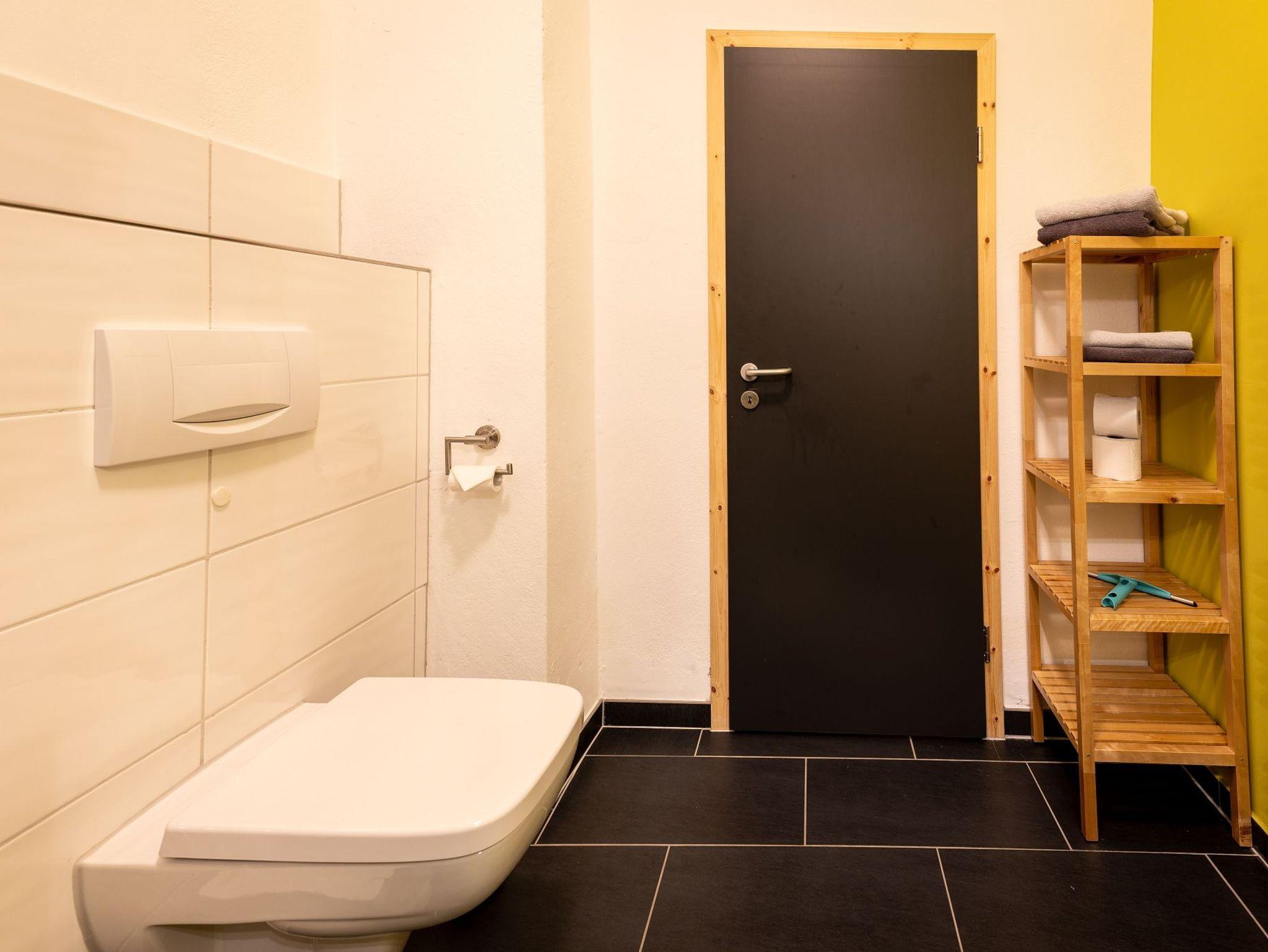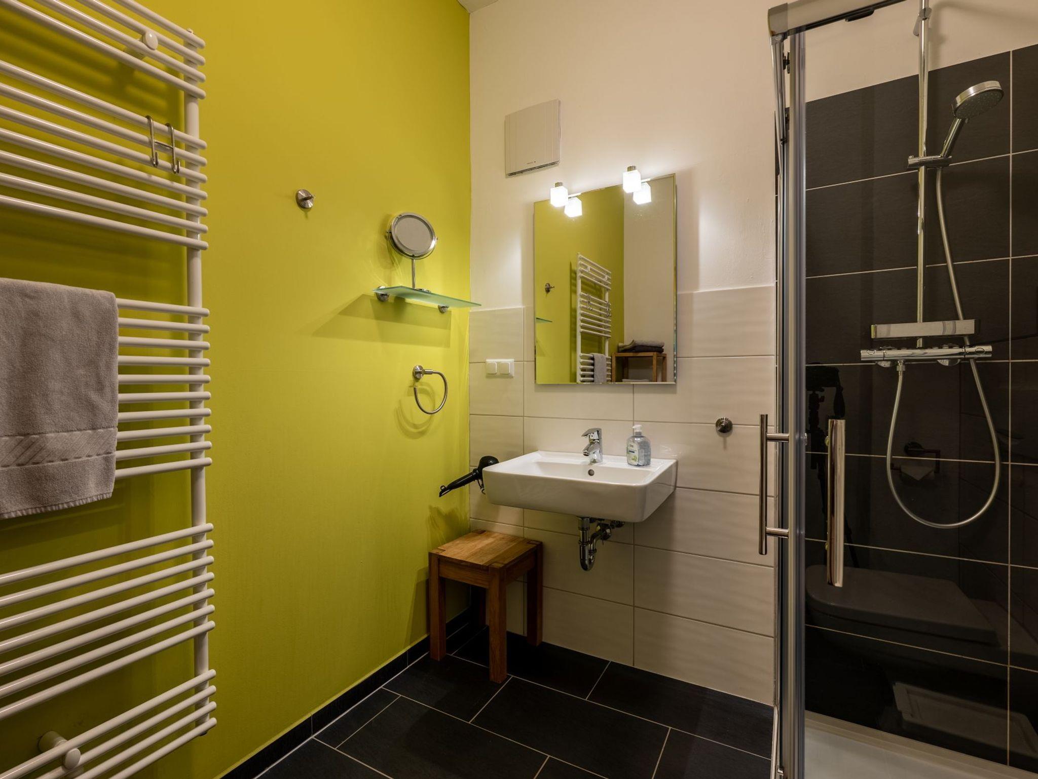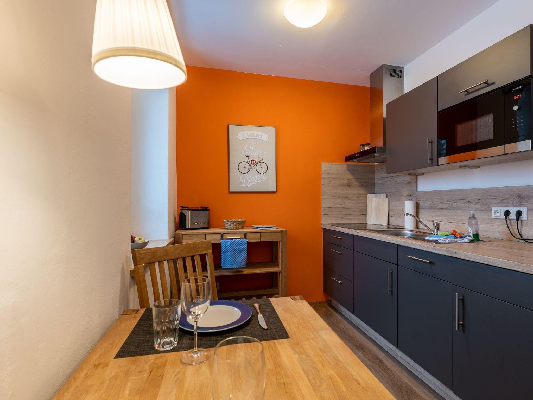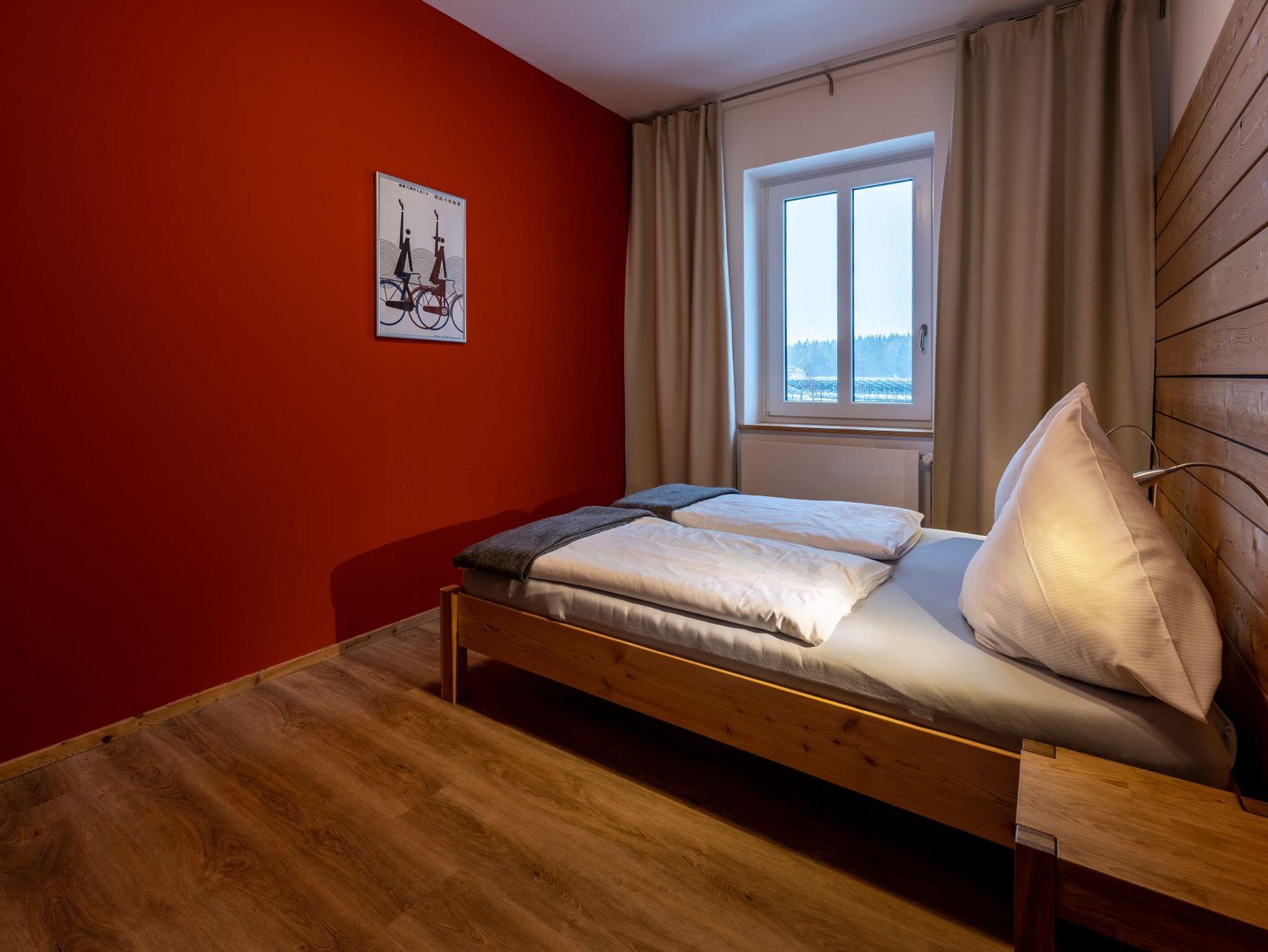 Modern-rustikaler Stil, Nichtraucherwohnung in der 1. Etage, im Sommer 2016 neu eingerichtet, Doppelbett 1,60 x 2,00 m, großes Bad mit bodengleicher Dusche, Laminatboden, freies WLAN, MTB- & eBike-Vermietung, großes Außengelände.