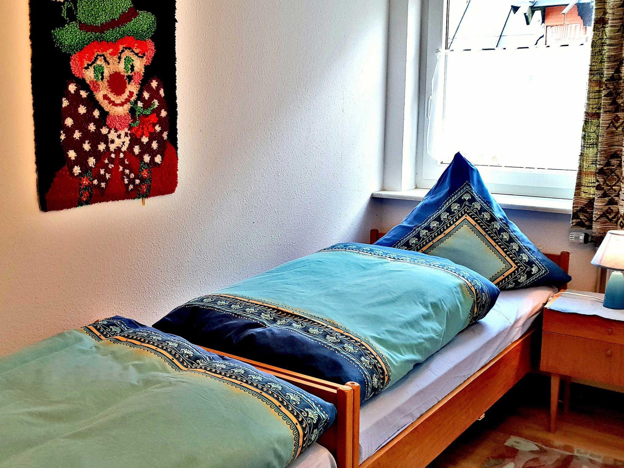 Die Ferienwohnung liegt in der 1. Etage mit großem Balkon. Sie besteht aus einem geräumigen Wohnzimmer mit Balkon mit Kabelfernseher, Radio, CD- und DVD-Player. Eines der beiden Schlafzimmer ist mit einem Doppelbett, das andere mit zwei Einzelbetten ausgestattet. Familien mit Kindern machen davon besonders gern Gebrauch.