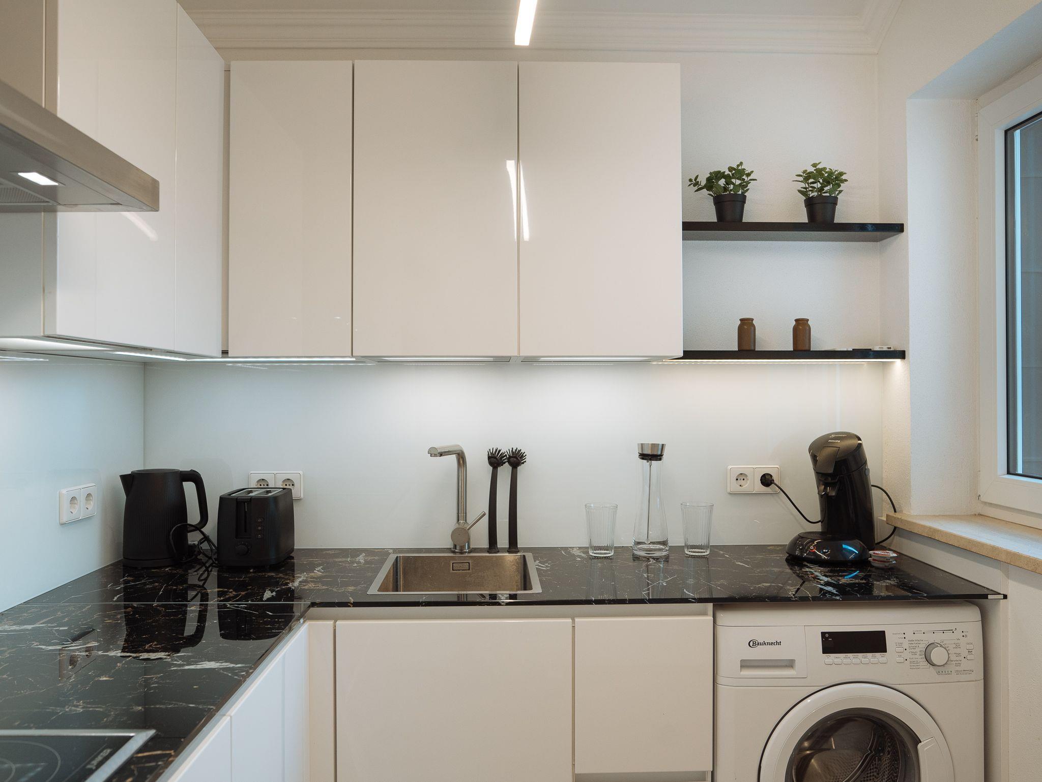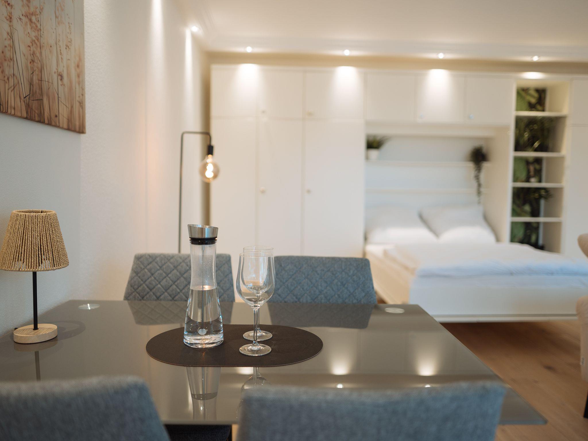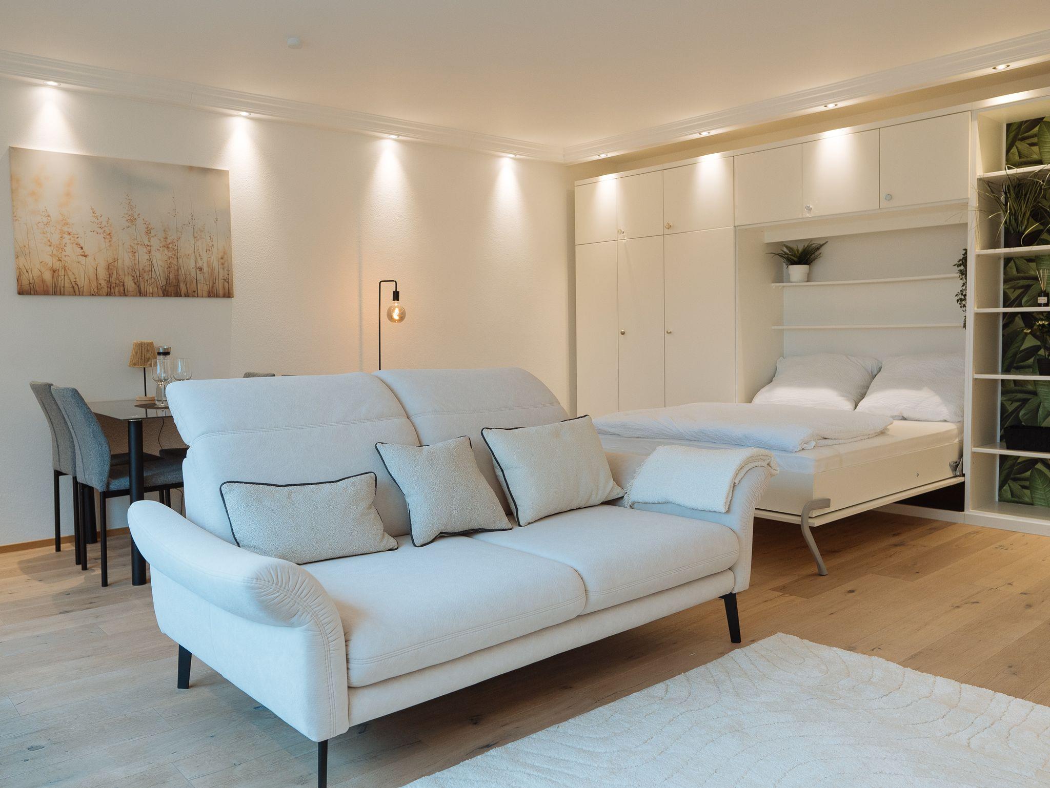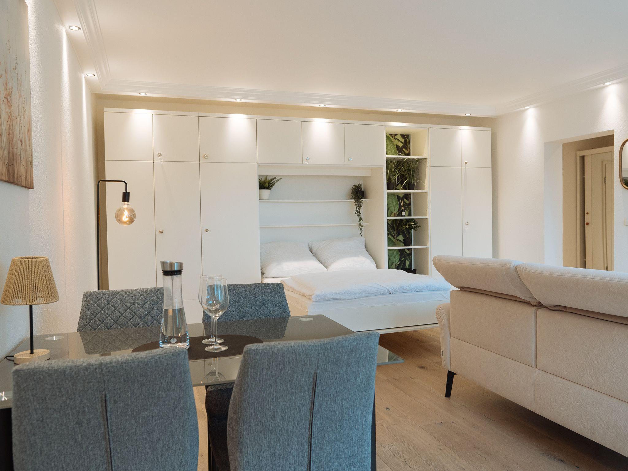 Großzügiges Studio mit komfortablem Doppelbett (optional: Schlafcouch oder Beistellbett). Voll ausgestattete Küche: Geschirrspüler, Backofen, Toaster, Kaffeemaschine & Waschmaschine. 50?Zoll Flachbild-TV und Highspeed-WLAN mit bis zu 1.000?Mbit/s – ideal fürs Arbeiten oder Streaming.