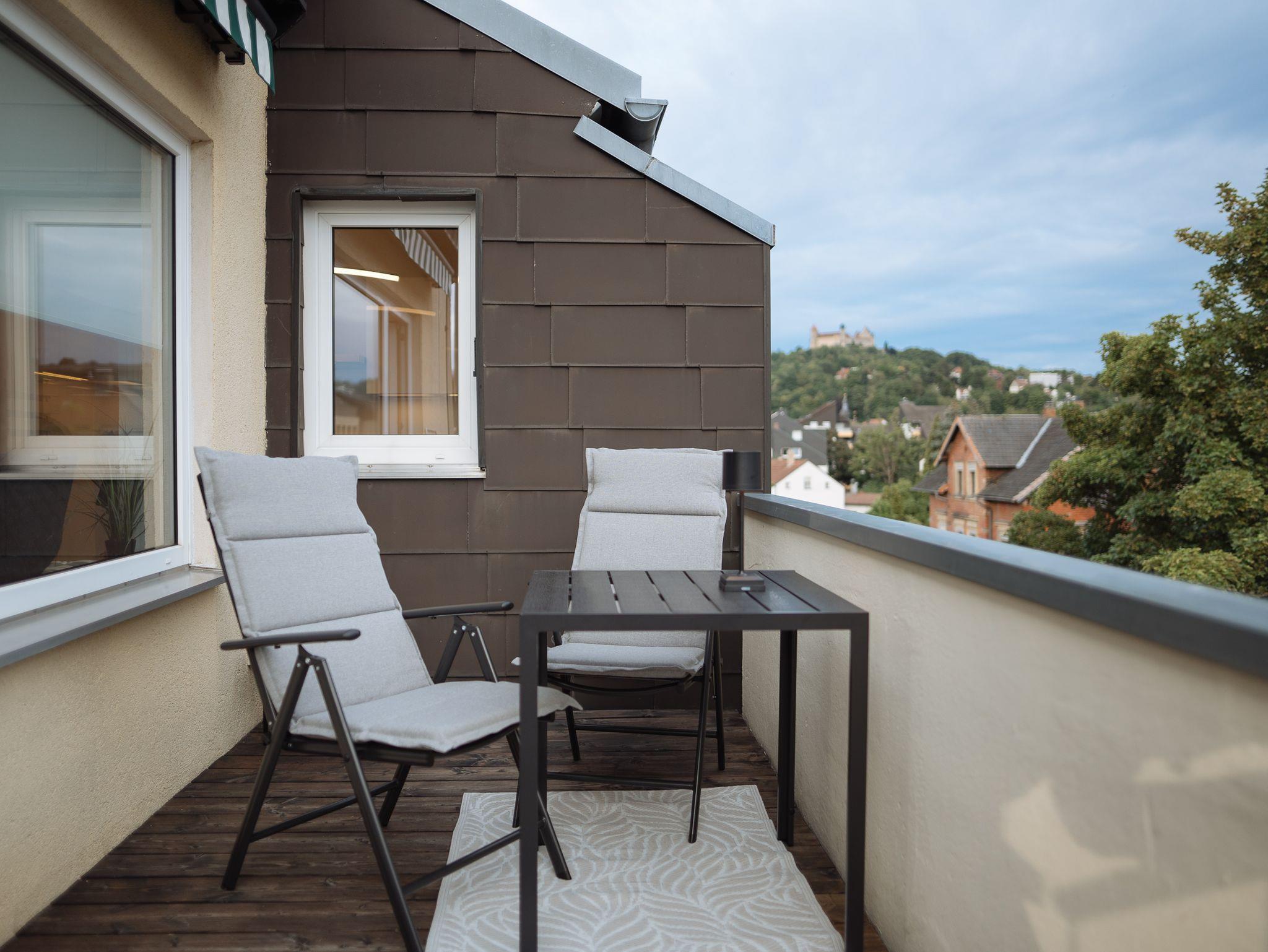 Balkon mit traumhaftem Panoramablick über die Stadt und auf die Veste Coburg. Eigener Stellplatz inklusive!