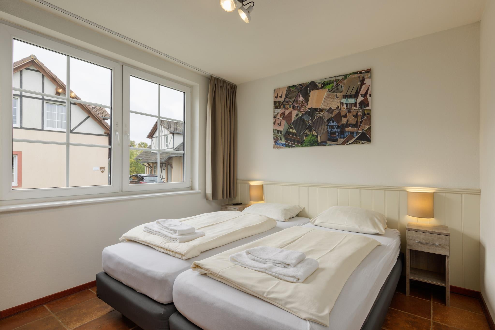 Disse fritliggende villaer, som blev renoveret i 2017, ligger på Ferienresort Cochem. Designet er moderne, komfortabelt og hyggeligt. Du har en rummelig stue og et åbent køkken udstyret med forskellige moderne apparater til din rådighed. Der er også et soveværelse med to enkeltsenge (skubbet sammen til en dobbeltseng) og eget badeværelse nedenunder. Der er to enkeltværelser ovenpå. Der er et tv i et af soveværelserne. Det andet badeværelse er også ovenpå. Alle senge er boxmadras. Et opbevaringsrum med vaskemaskine og tørretumbler fuldender billedet. Der er en have med terrasse og havemøbler, og der er en parkeringsplads ved villaen til én bil. 2027: Swimmingpoolen er lukket fra 11.01 til 17.01.2027 på grund af renoveringsarbejde.