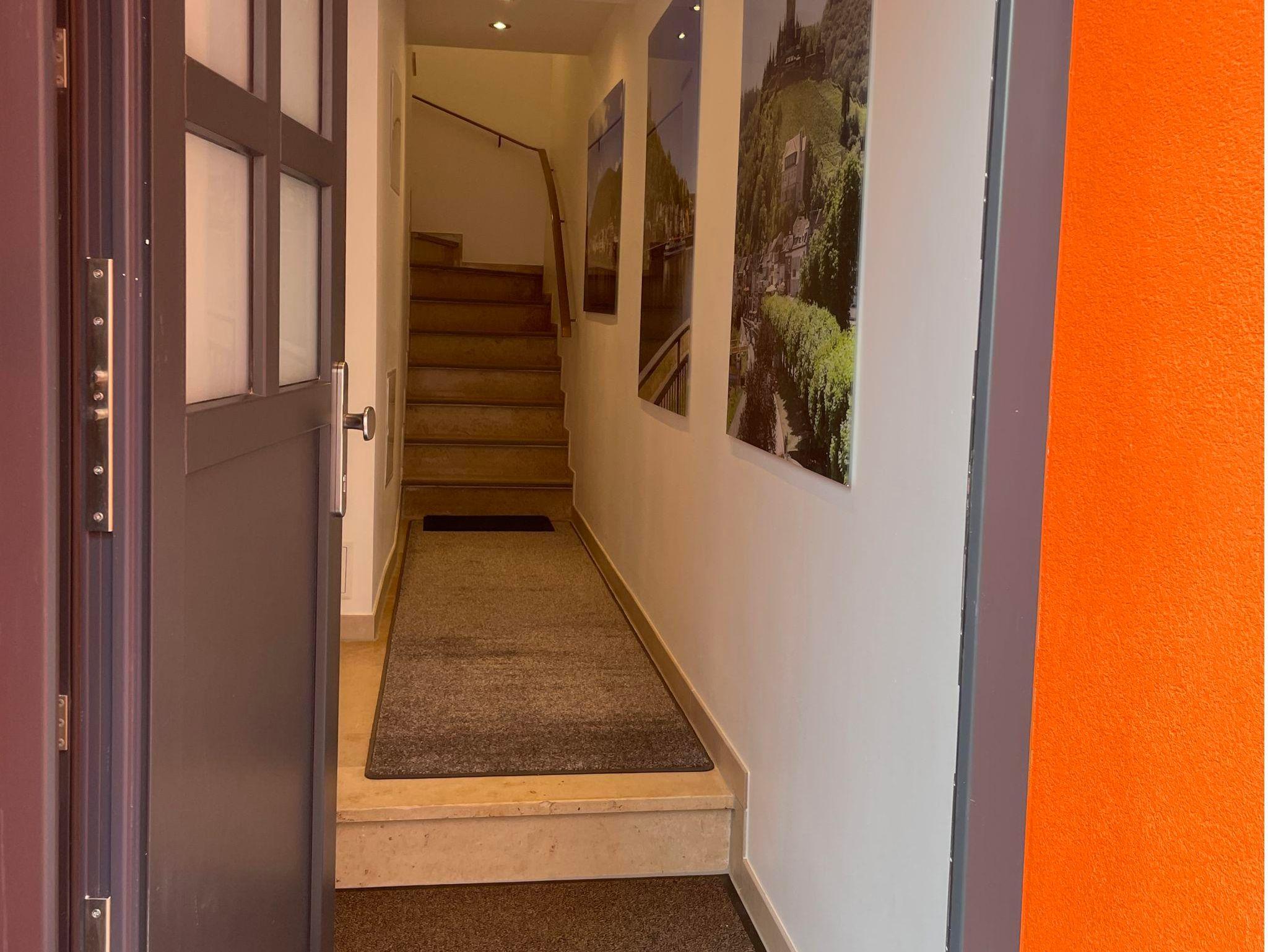 Es ist gerade mal 4 m breit und direkt an den Felsen gebaut. Dafür bieten die Wohnungen einen herrlichen Blick auf die Mosel und den gegenüber liegenden Weinberg.