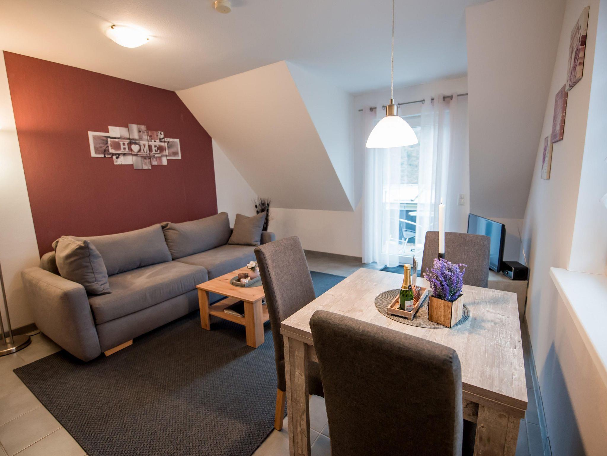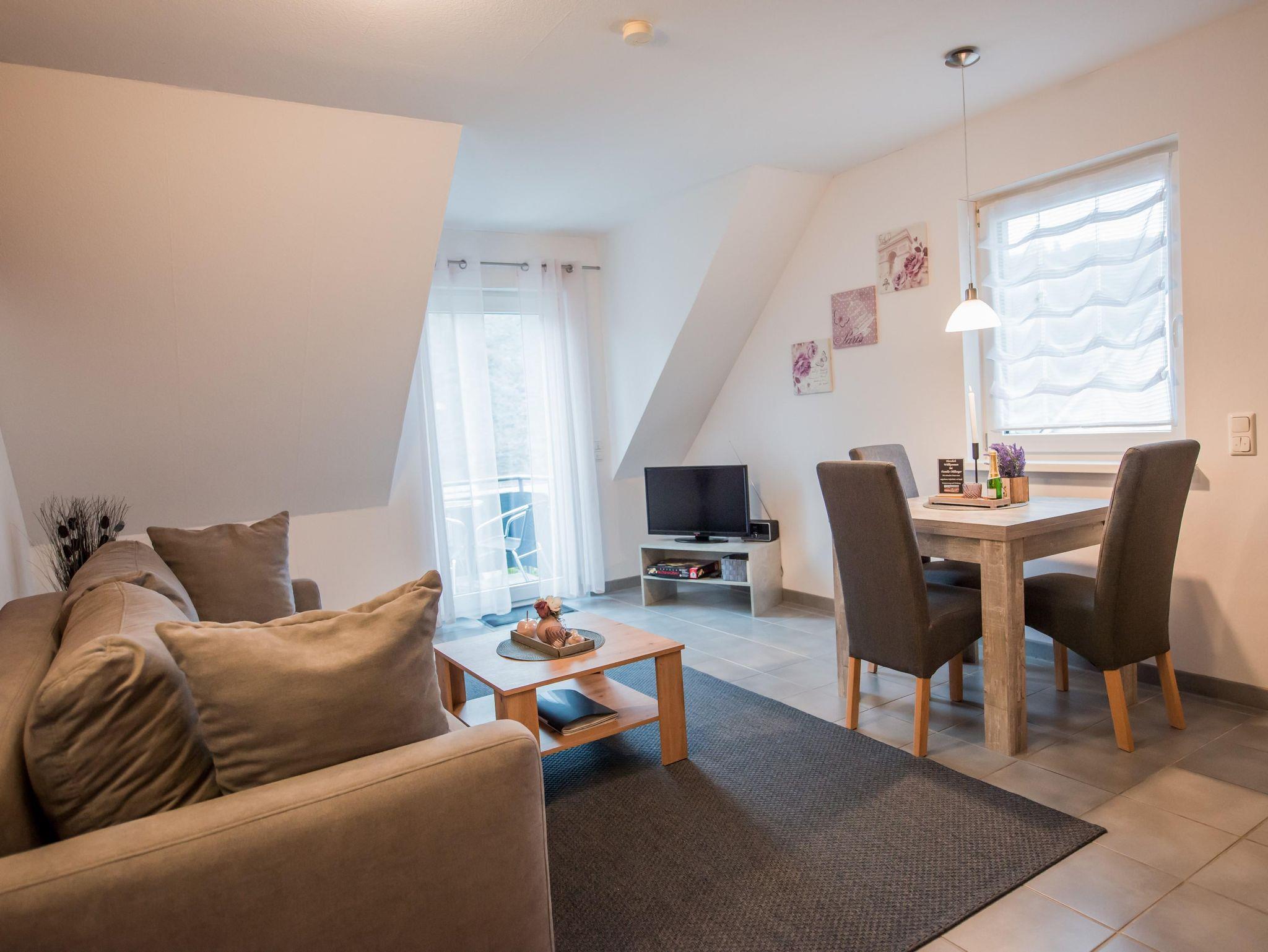 Sie ist ausgestattet mit einem gemütlichem Wohnraum mit Küche (komplett ausgestattet),ein Schlafsofa (für eine dritte Person, gegen Aufpreis geeignet) , separates Schlafzimmer, DU/WC, LED-Sat-TV,Balkon, W-LAN.