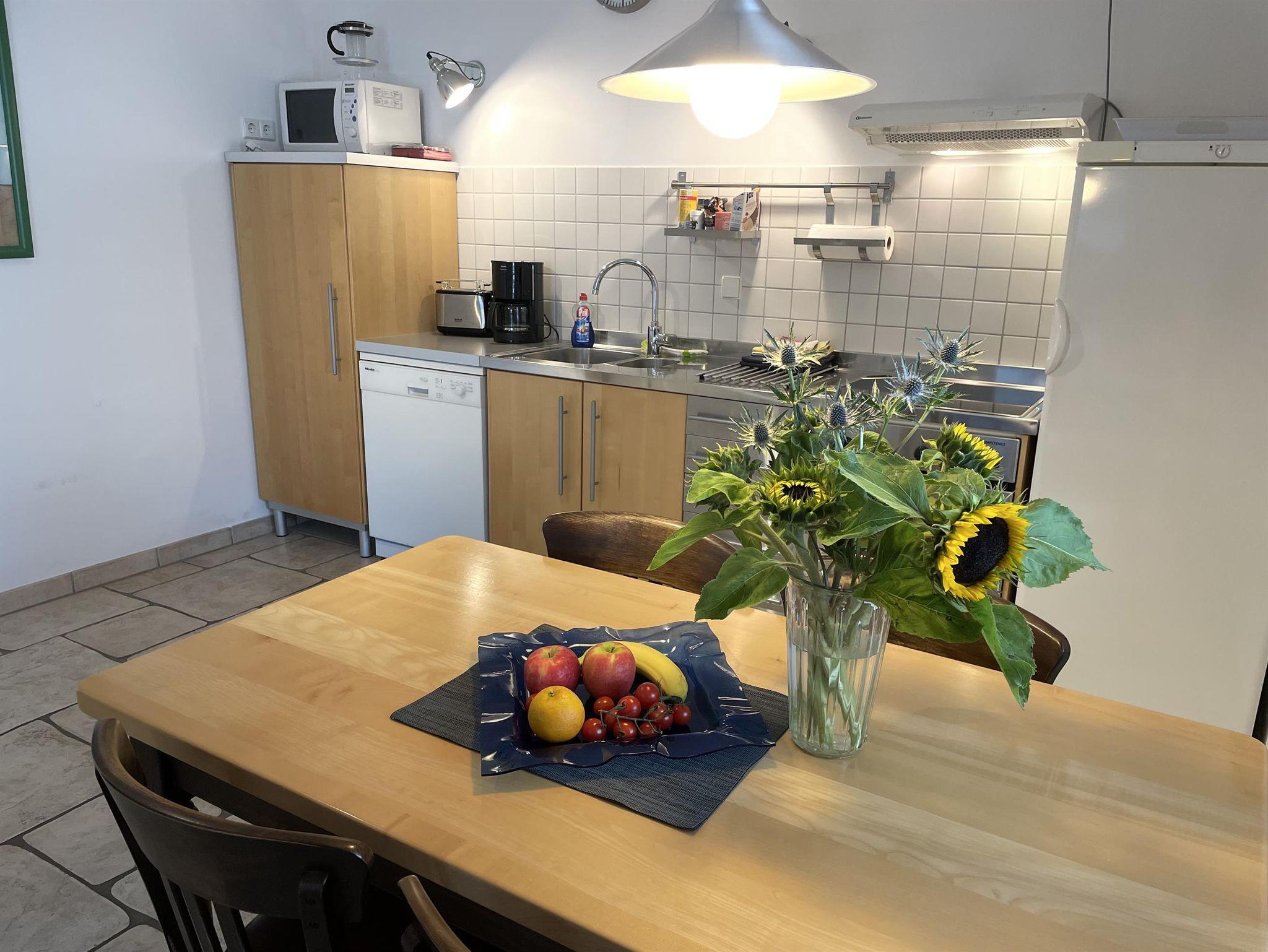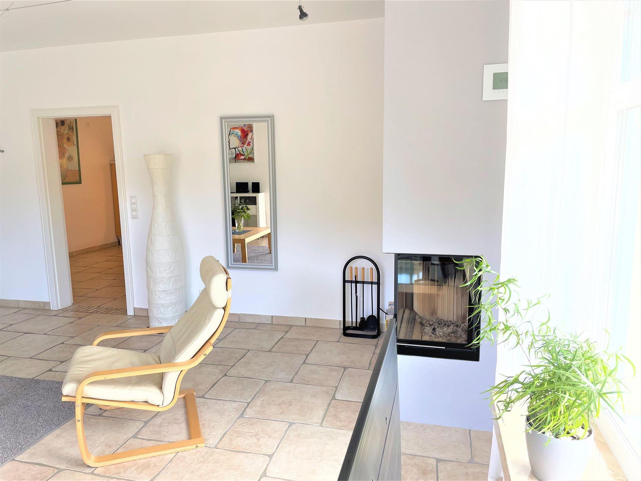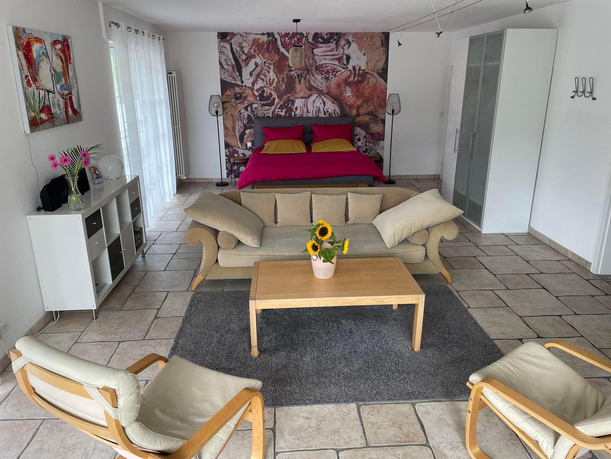 Die neu eingerichtete 70 qm Ferienwohnung besteht aus einem großen Wohn-/Schlafraum mit gemütlichem Kamin, einer voll ausgestatteten Küche und Badezimmer mit Dusche/WC. Direkt vor der Ferienwohnung befindet sich eine 100 m² große Freiterasse mit Gartenmöbeln zur alleinigen Nutzung.