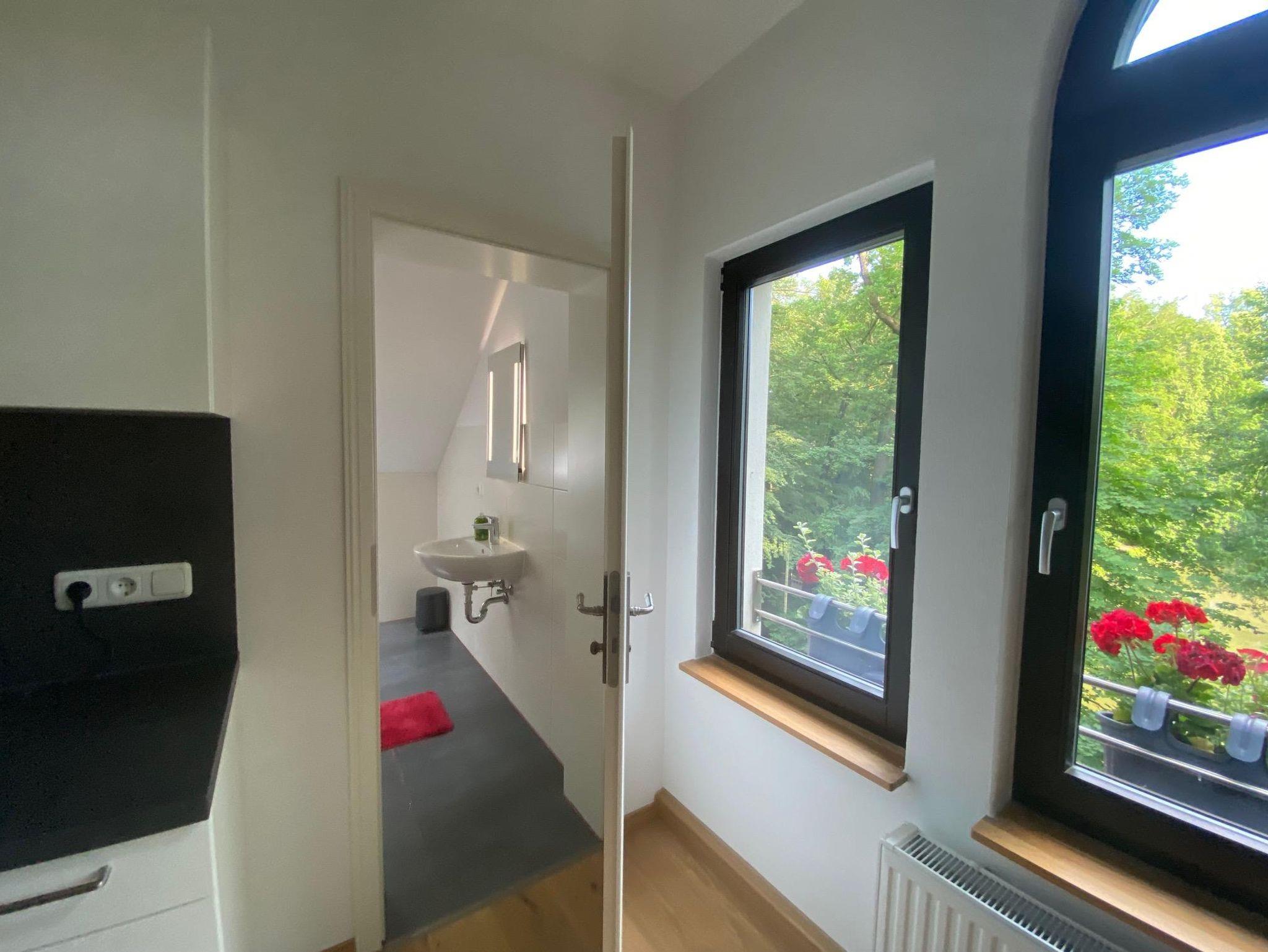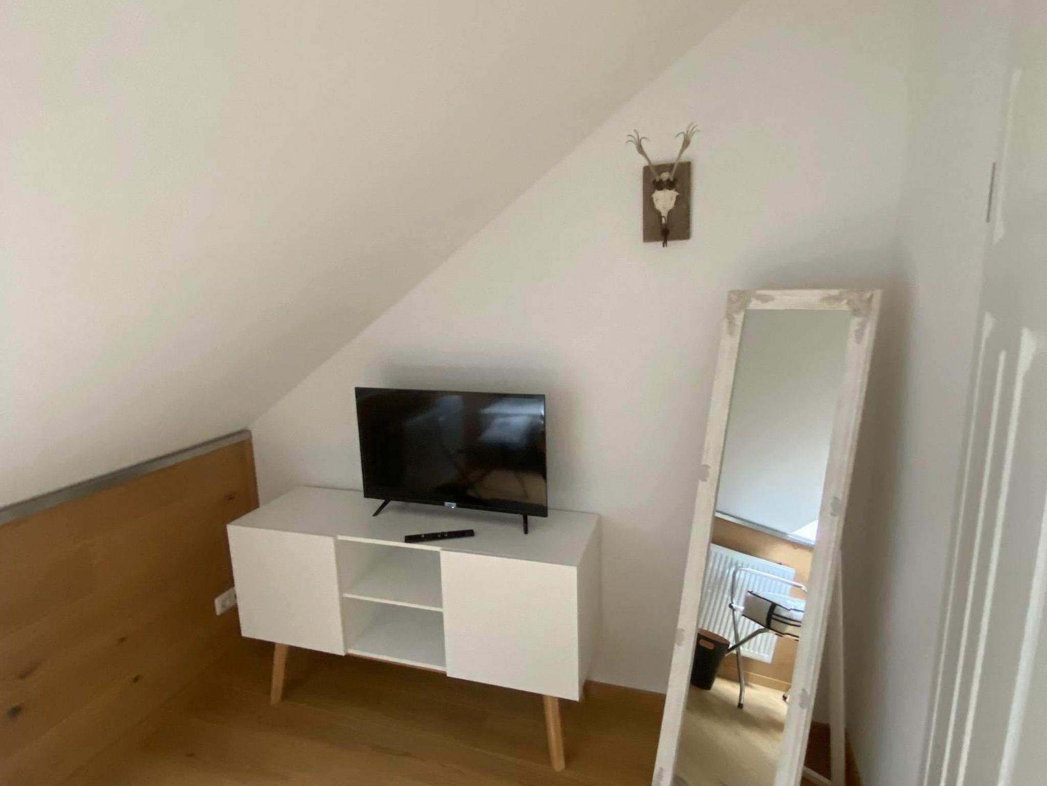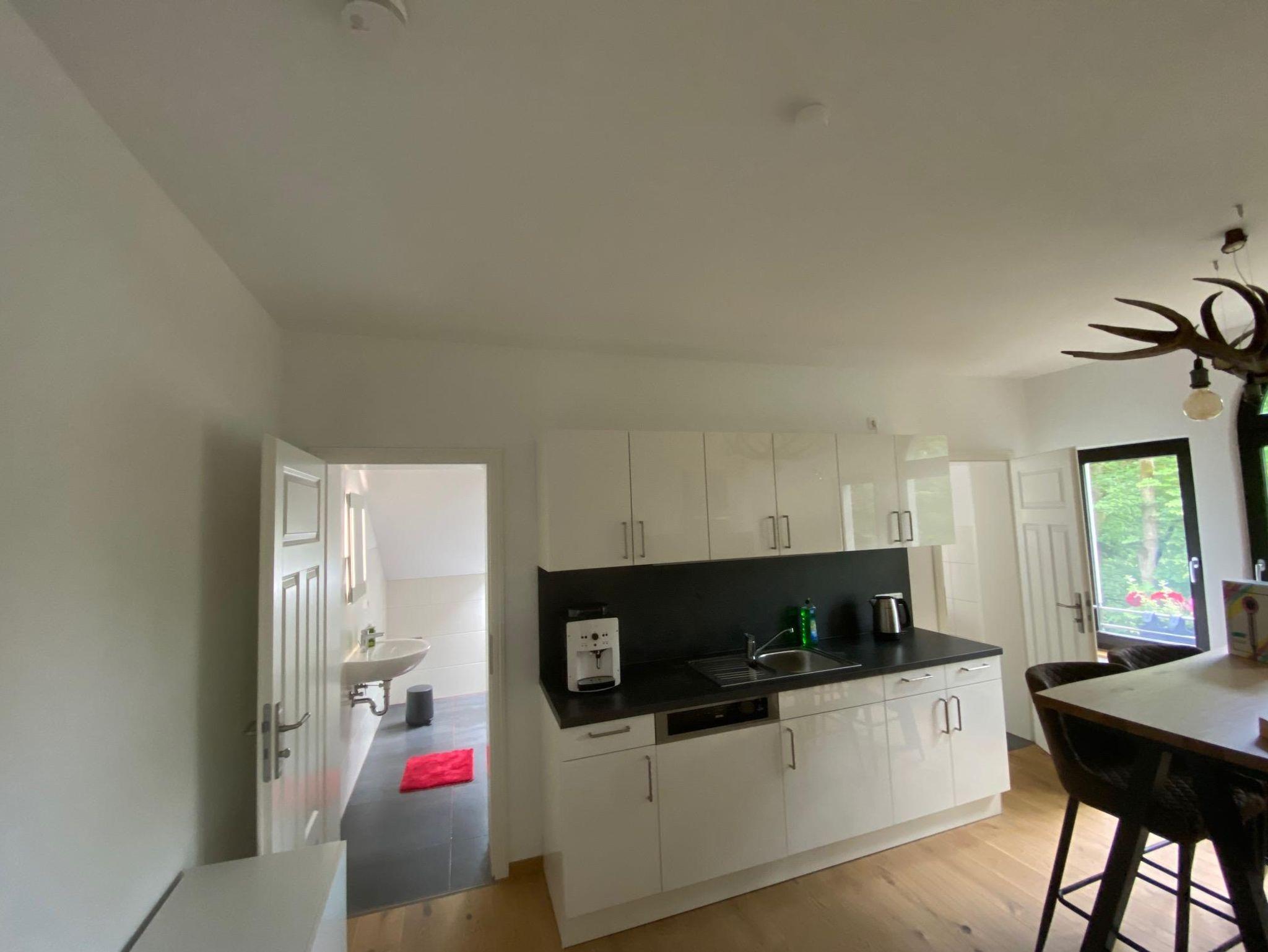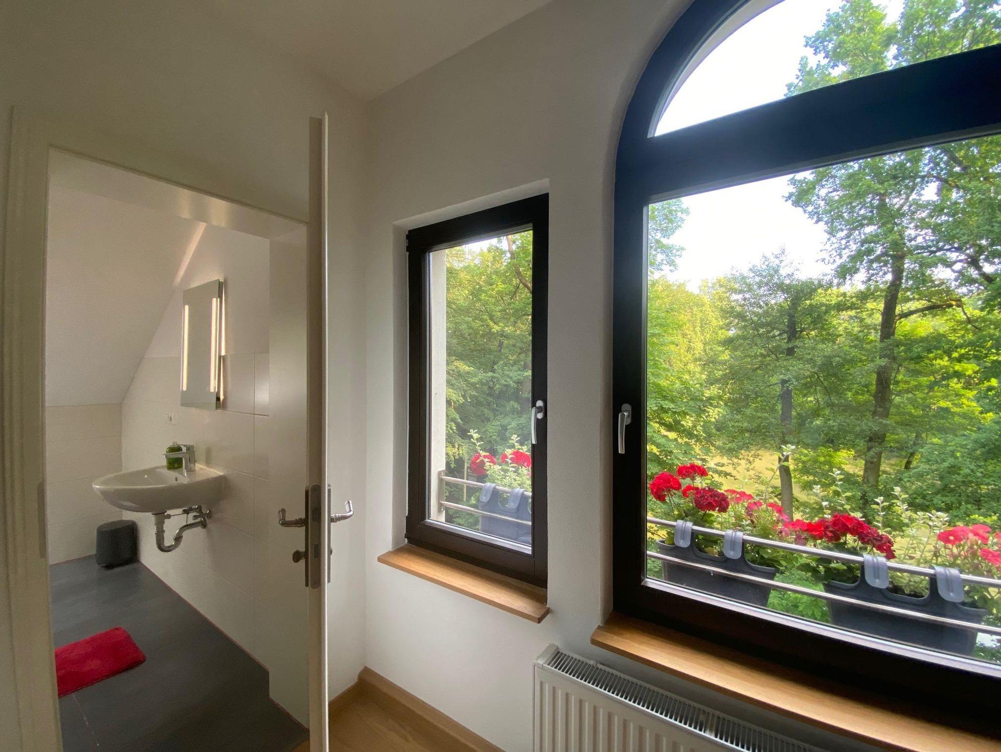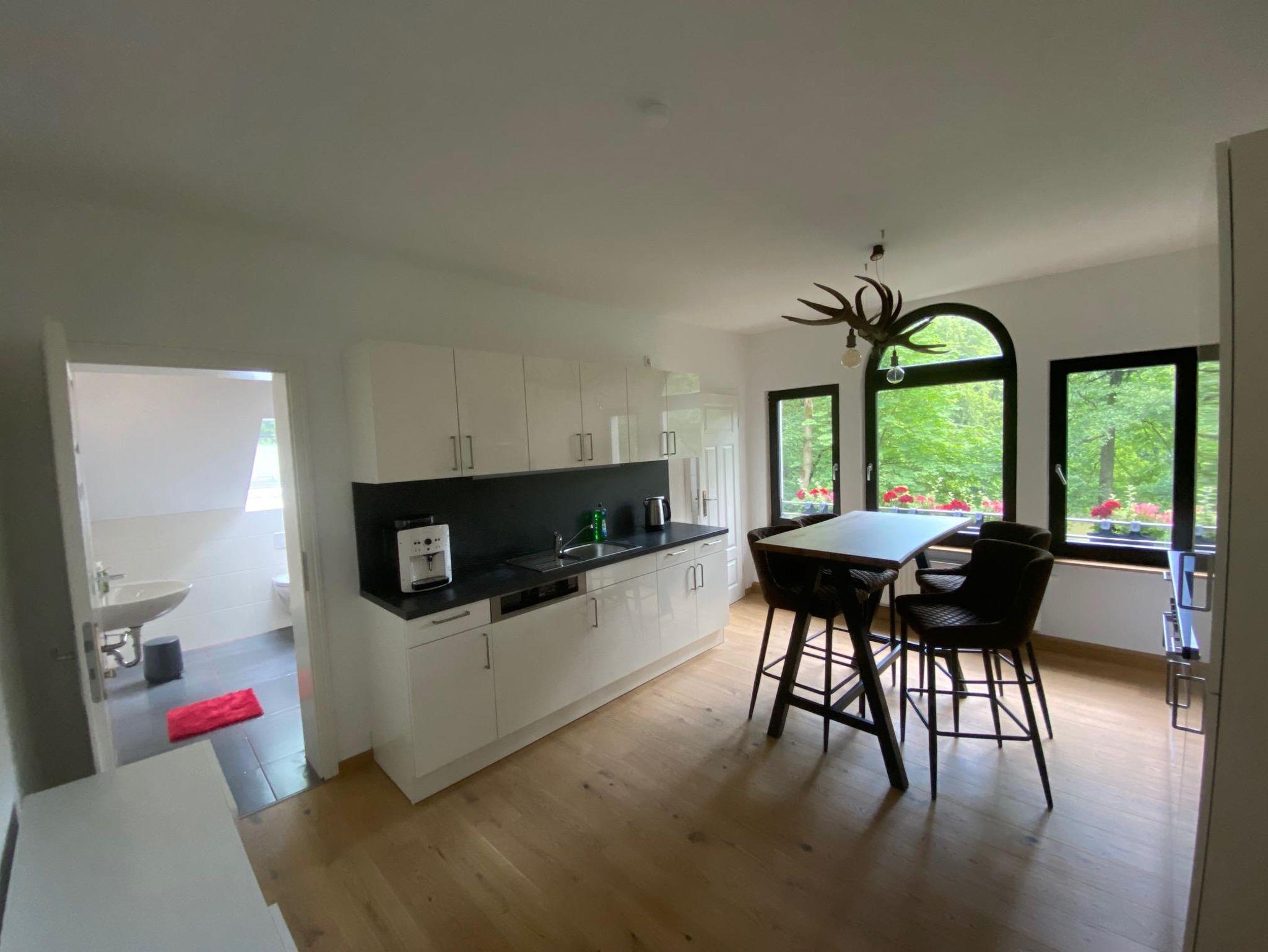 Im Dachgeschoss auf der linken Seite erwartet Sie Ihr gemütliches Reich. Sie schlafen in getrennten 90x200cm Betten und haben eine gut ausgestattete Küchenzeile, sowie eine gemütliche Sitzecke und einen TV dort integriert. Ein Glas Wein am Abend, ein Kaffee vor dem Start in den Tag ist jederzeit für Sie möglich. Sollten Sie ein Frühstück dazu buchen, können Sie dies hier in Ihrem eigenen Reich gerne in aller Ruhe genießen. Im Tageslicht-Bad mit Dusche können Sie mit Blick in den Himmel und die Baumkronen entspannen.