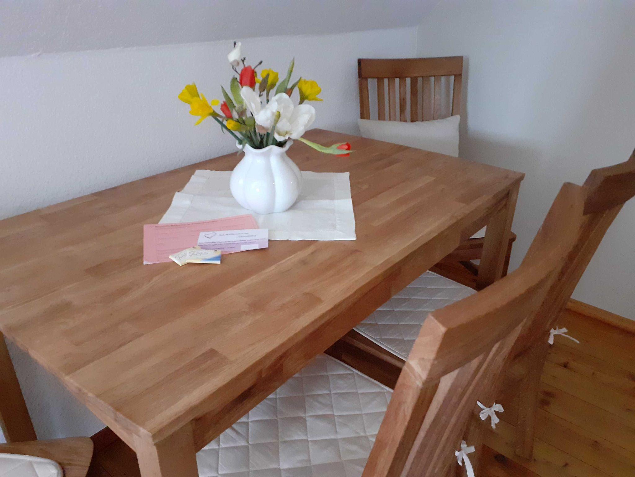 Für alle Gäste ist die Nutzung der voll ausgestatteten Küche gewährleistet. Diese befindet sich im gegenüberliegenden Gebäude vom Haupthaus, wo auch das Frühstück in der Guten Stube eingenommen werden kann. Ein Kühlschrank für unsere Gäste befindet sich in der Diele.