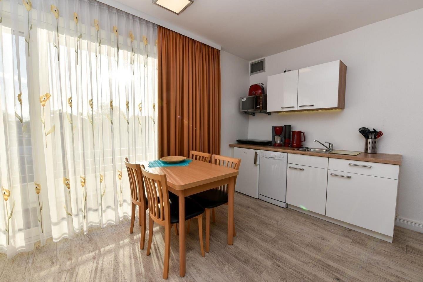 - Einen hellen Wohnbereich mit Sofa, zwei Sesseln, TV und integrierter Küche inklusive Spülmaschine, Mikrowelle und Kühlschrank.